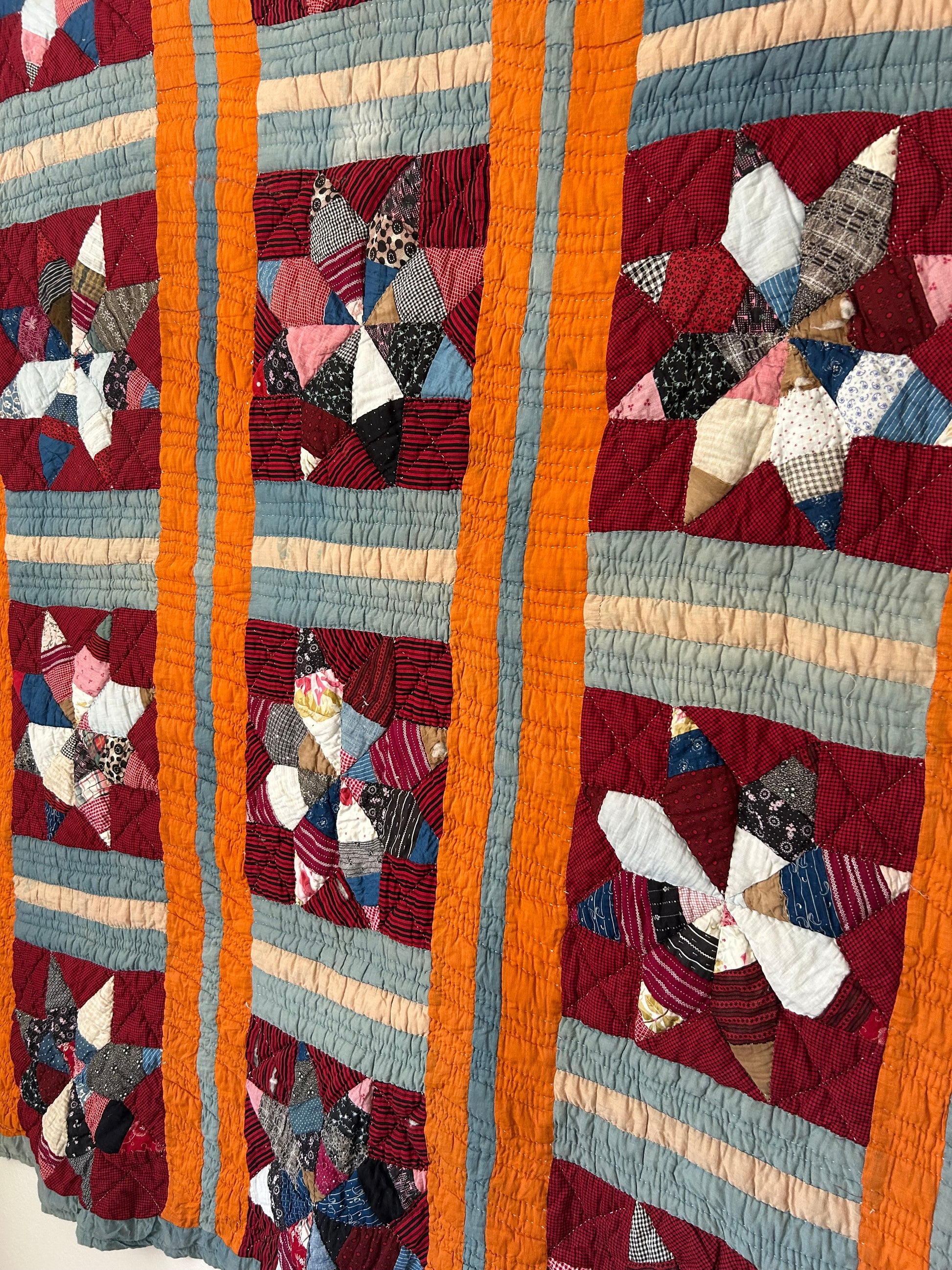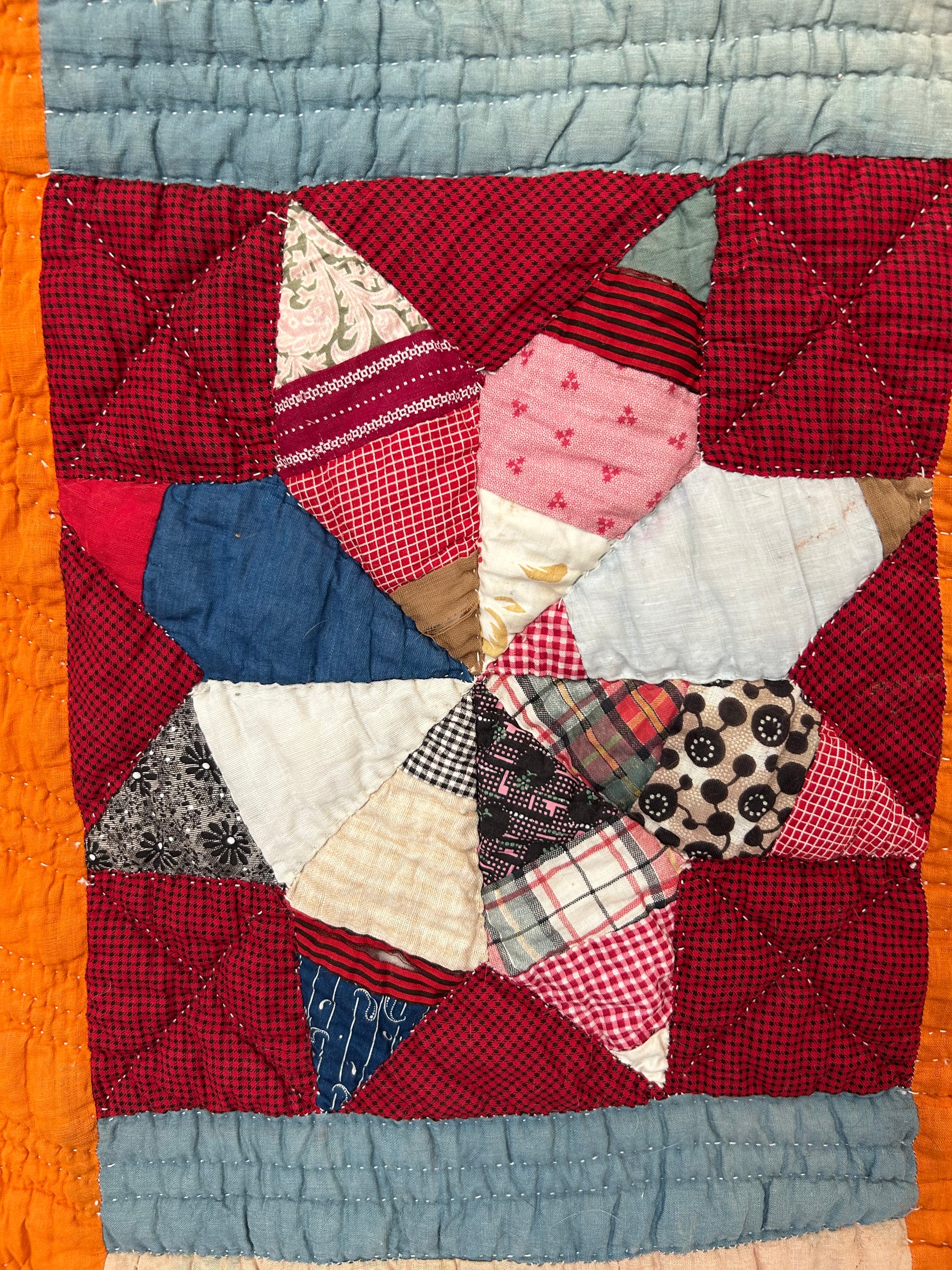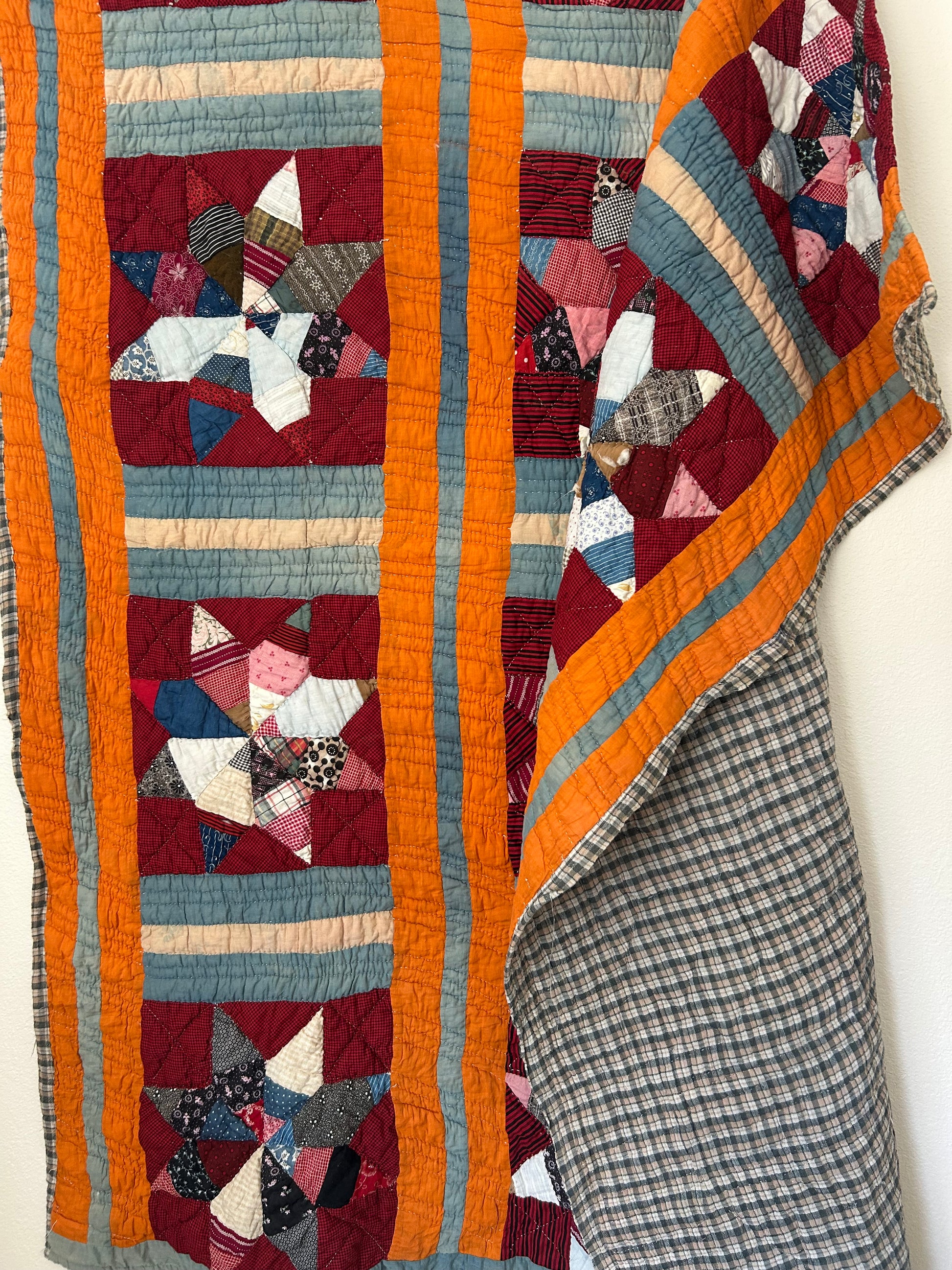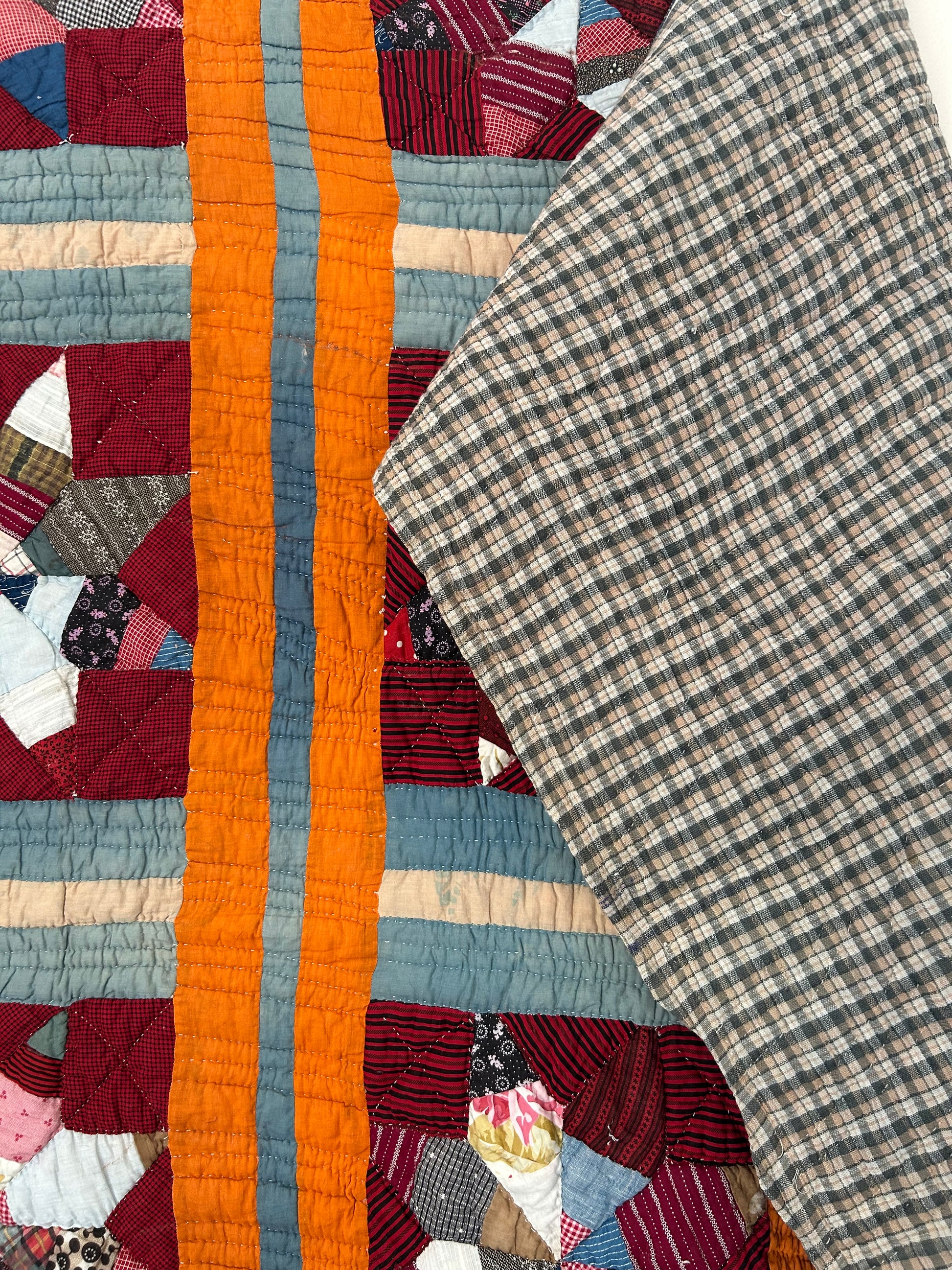 This antique Lemoyne Star Quilt from the early 1900s features rich deep reds and cheddar hues, beautifully hand-stitched with intricate detail. It has a cozy, medium-thick feel and is backed with plaid flannel. While there are some holes and discoloration, the quilt remains a stunning example of vintage craftsmanship.