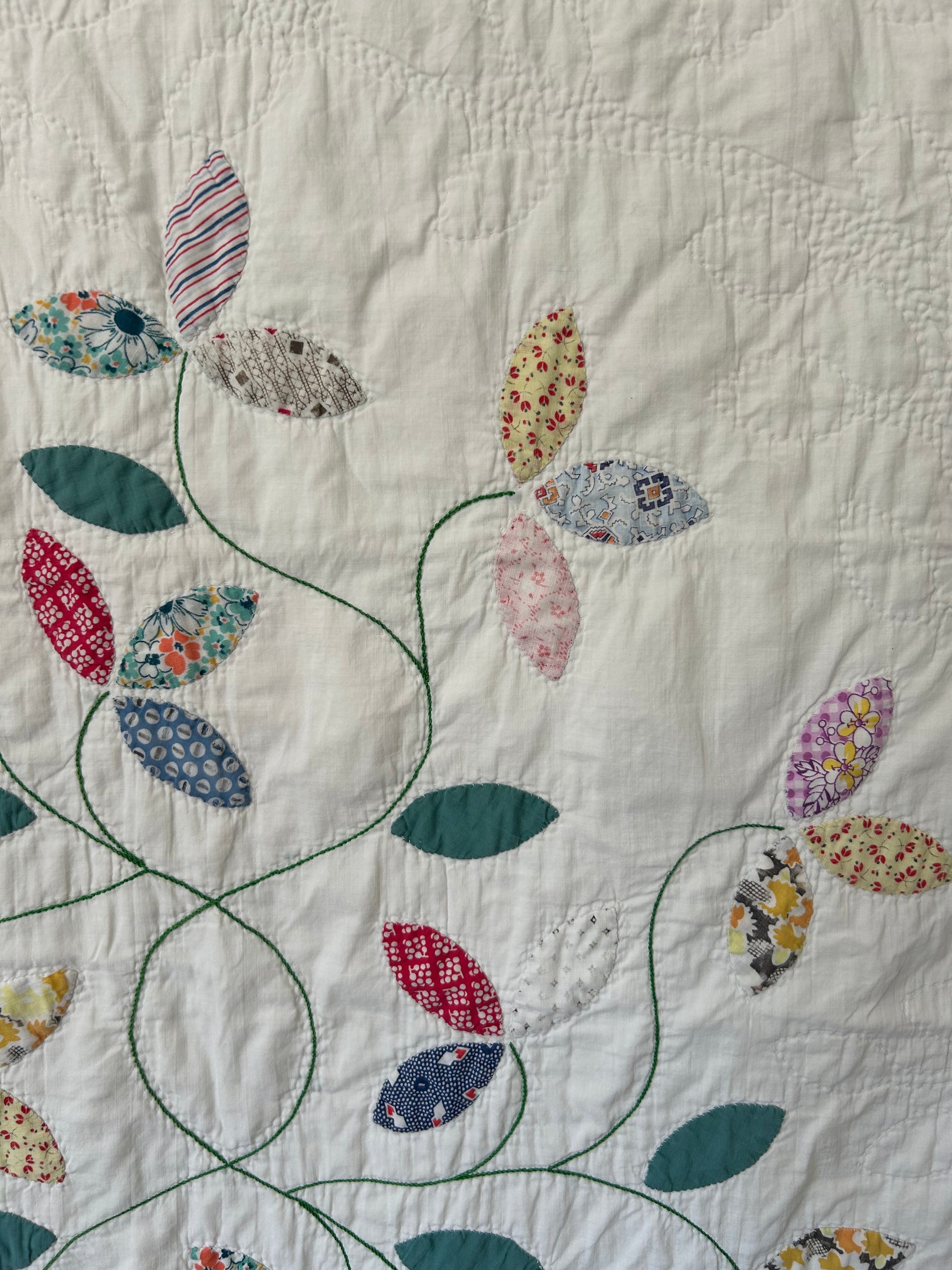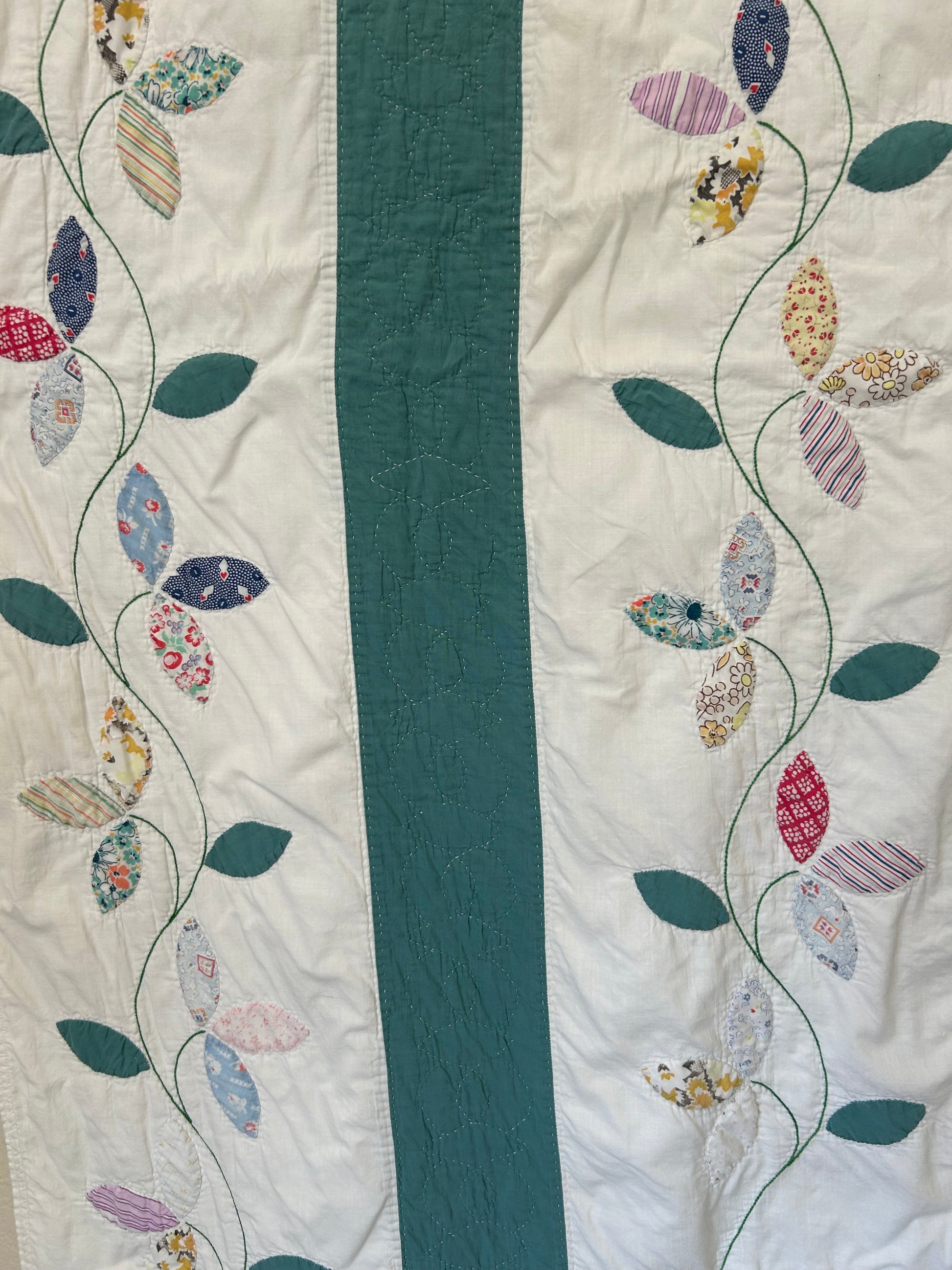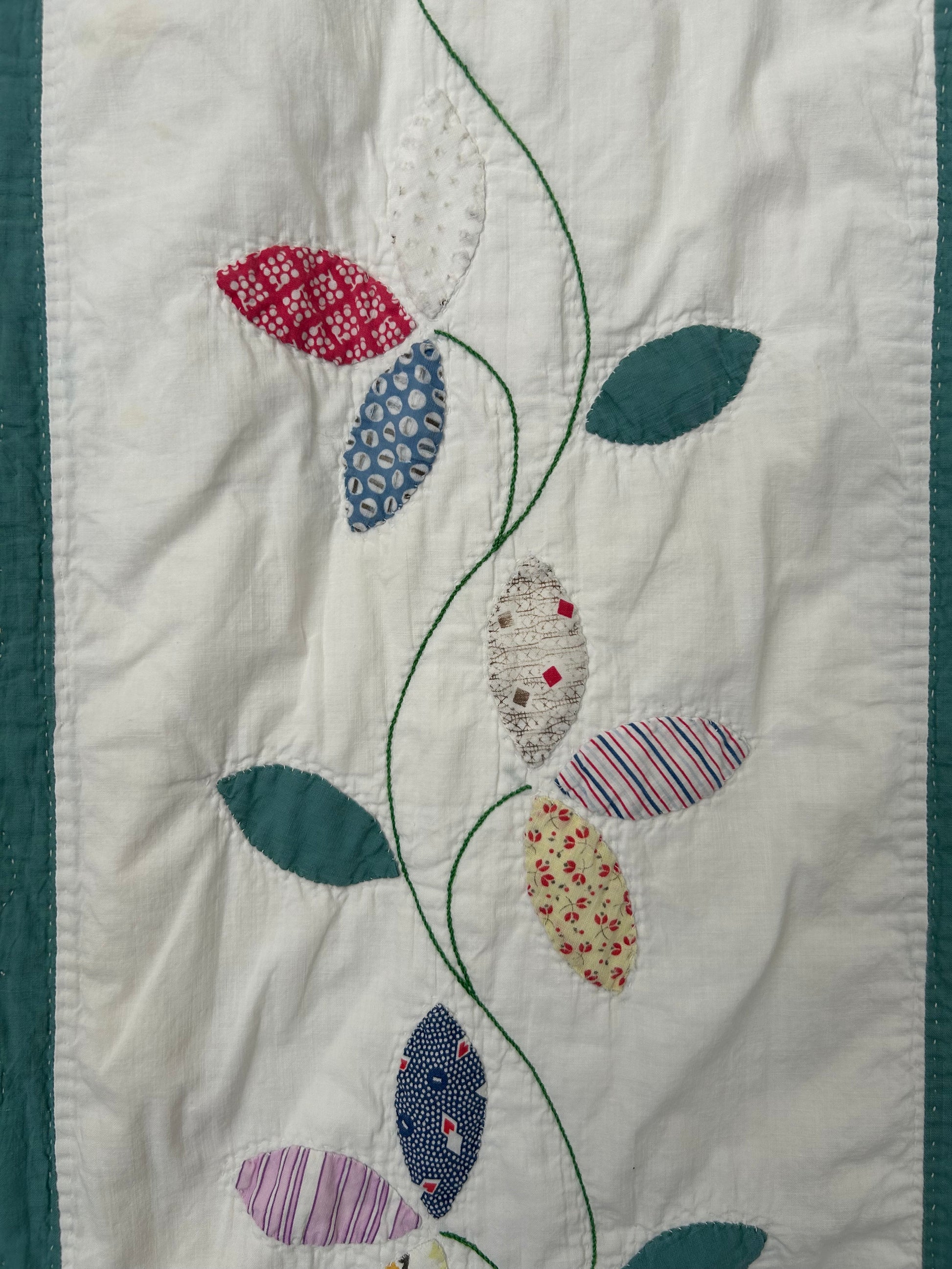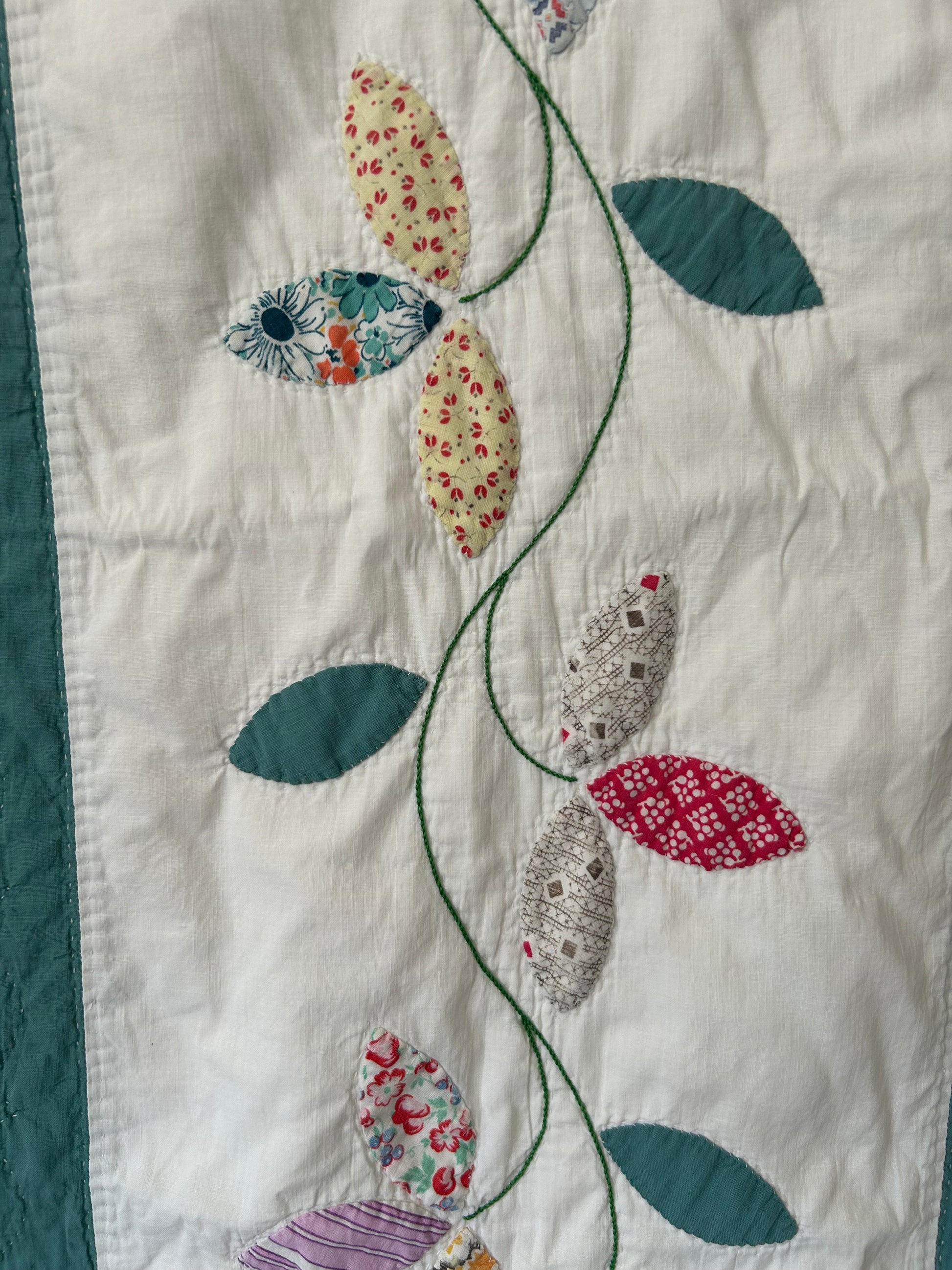 This beautiful 1940s Autumn Leaves Quilt features hand-stitched and appliquéd leaves with a pretty green frame. Machine bound and light in weight, it’s perfect for a summer quilt. There’s slight wear along some of the stitched edges and one light stain, but overall it remains a charming piece.