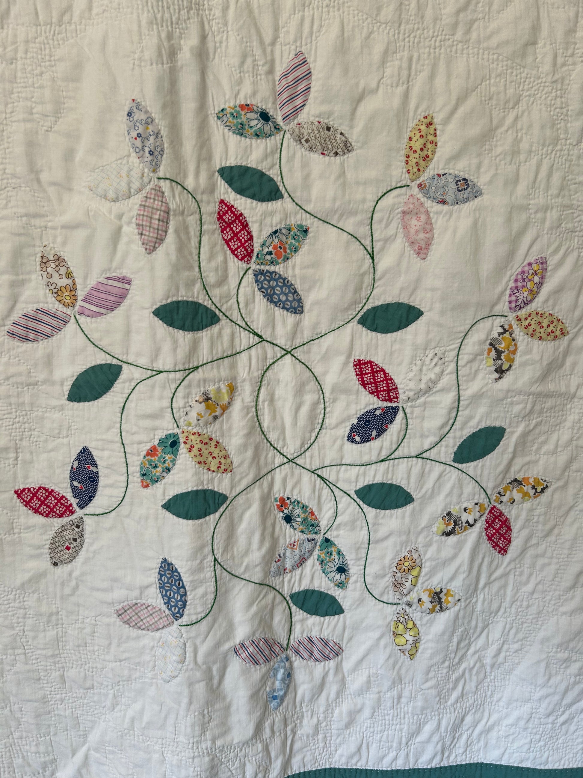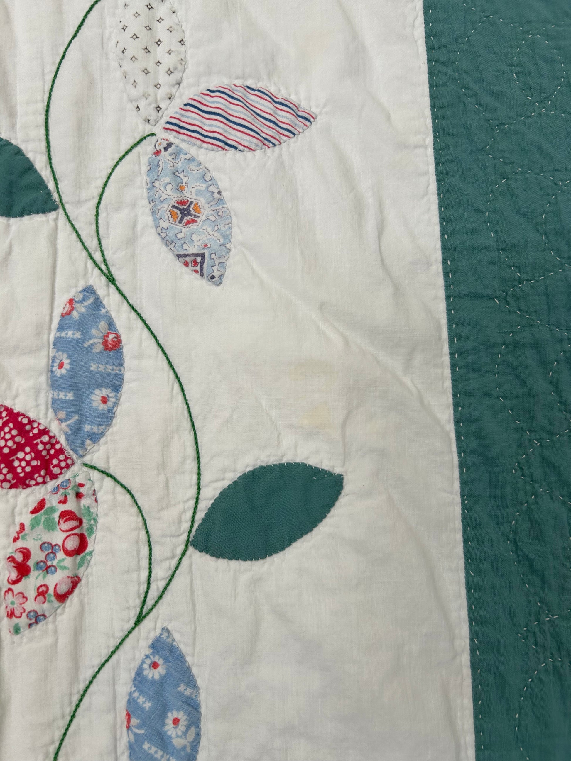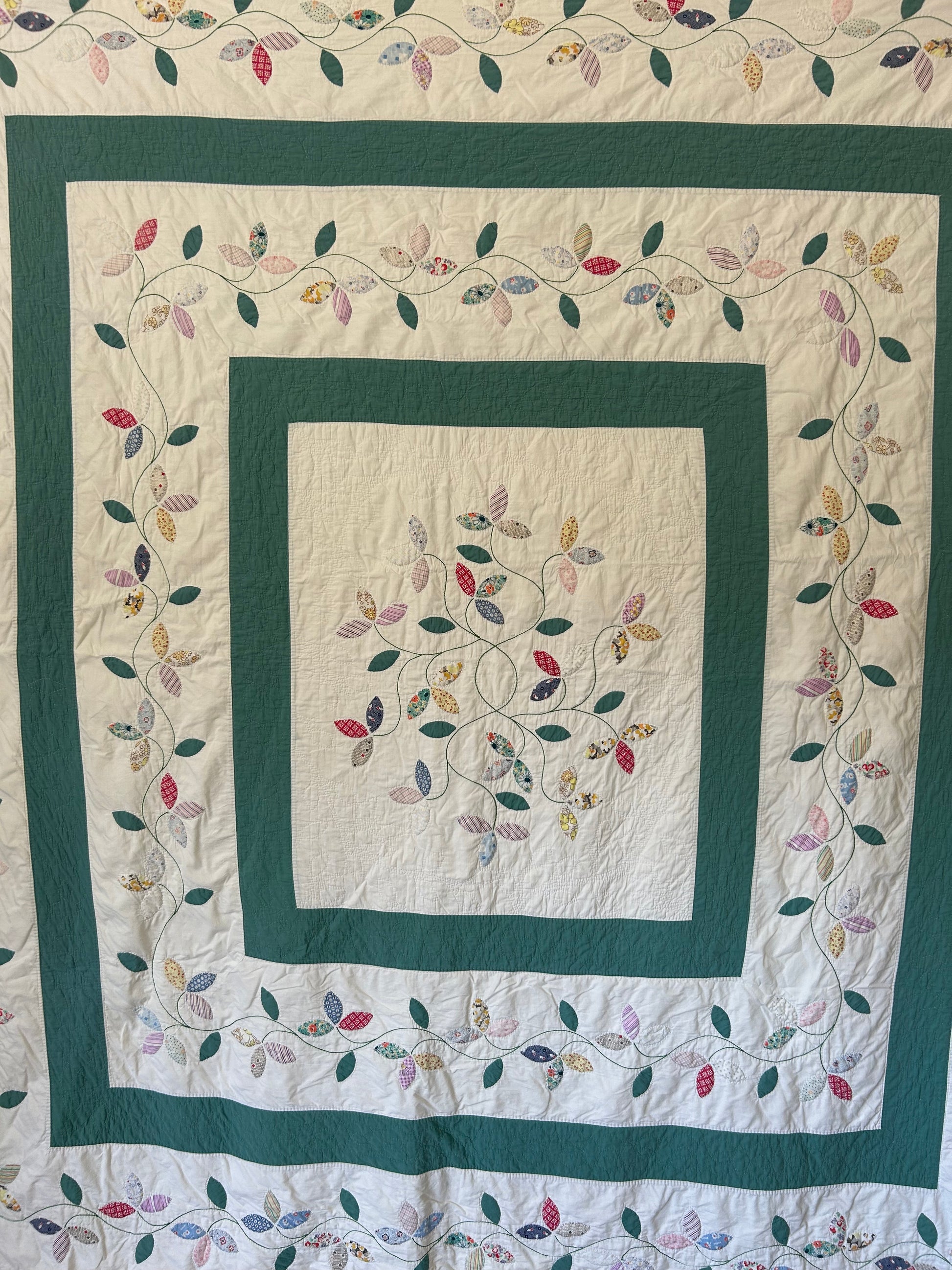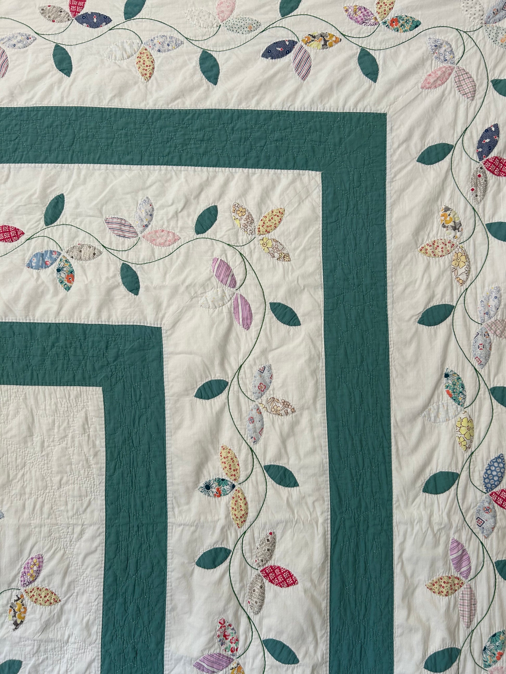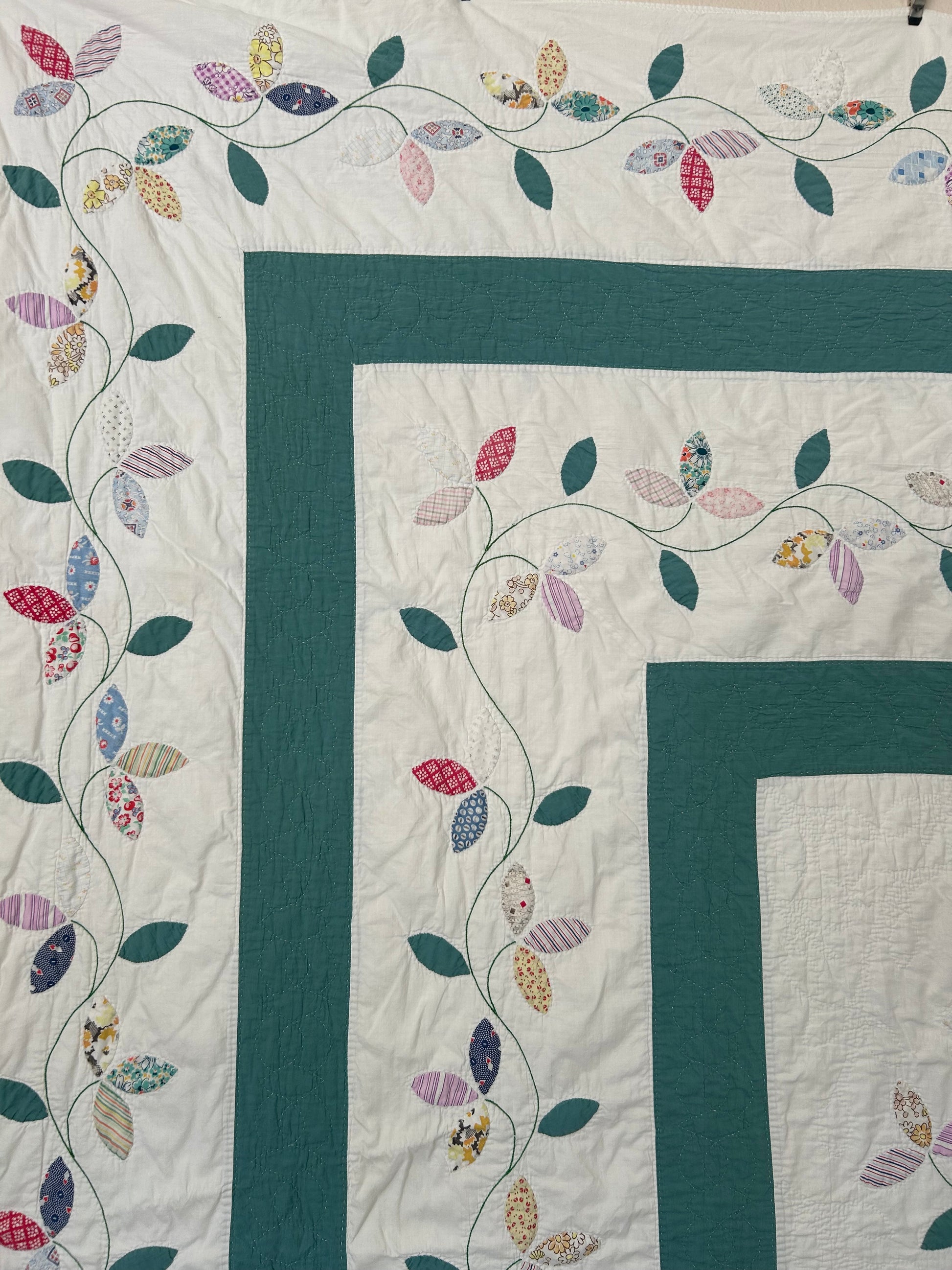 This beautiful 1940s Autumn Leaves Quilt features hand-stitched and appliquéd leaves with a pretty green frame. Machine bound and light in weight, it’s perfect for a summer quilt. There’s slight wear along some of the stitched edges and one light stain, but overall it remains a charming piece.