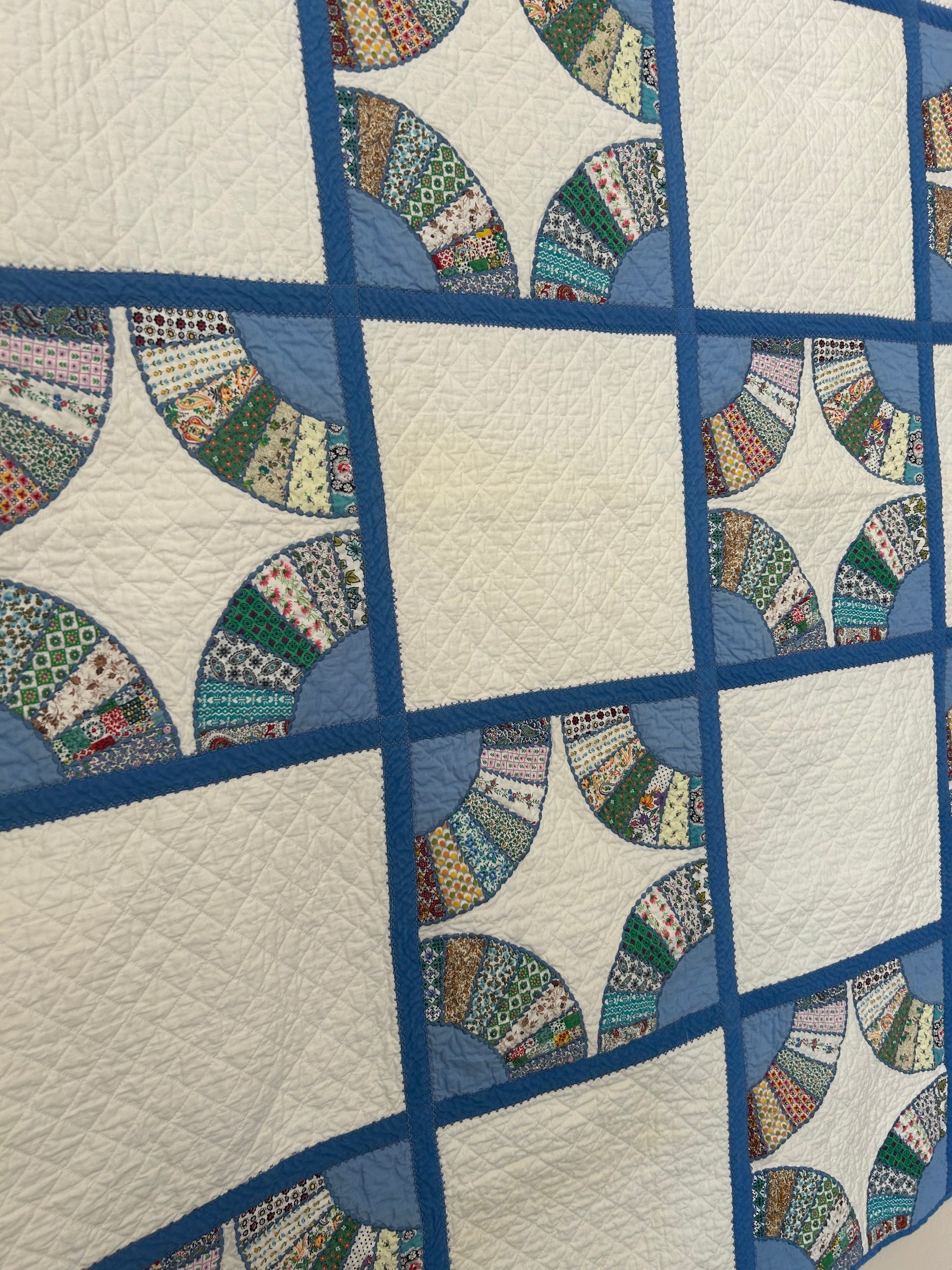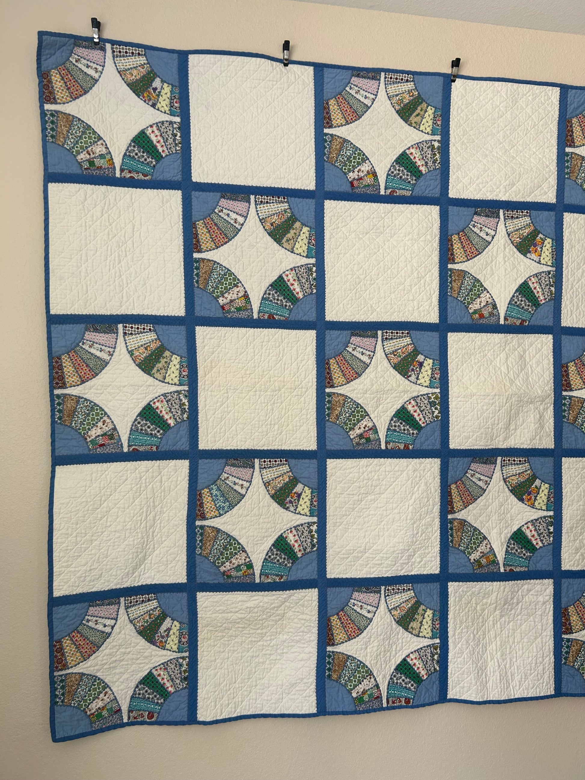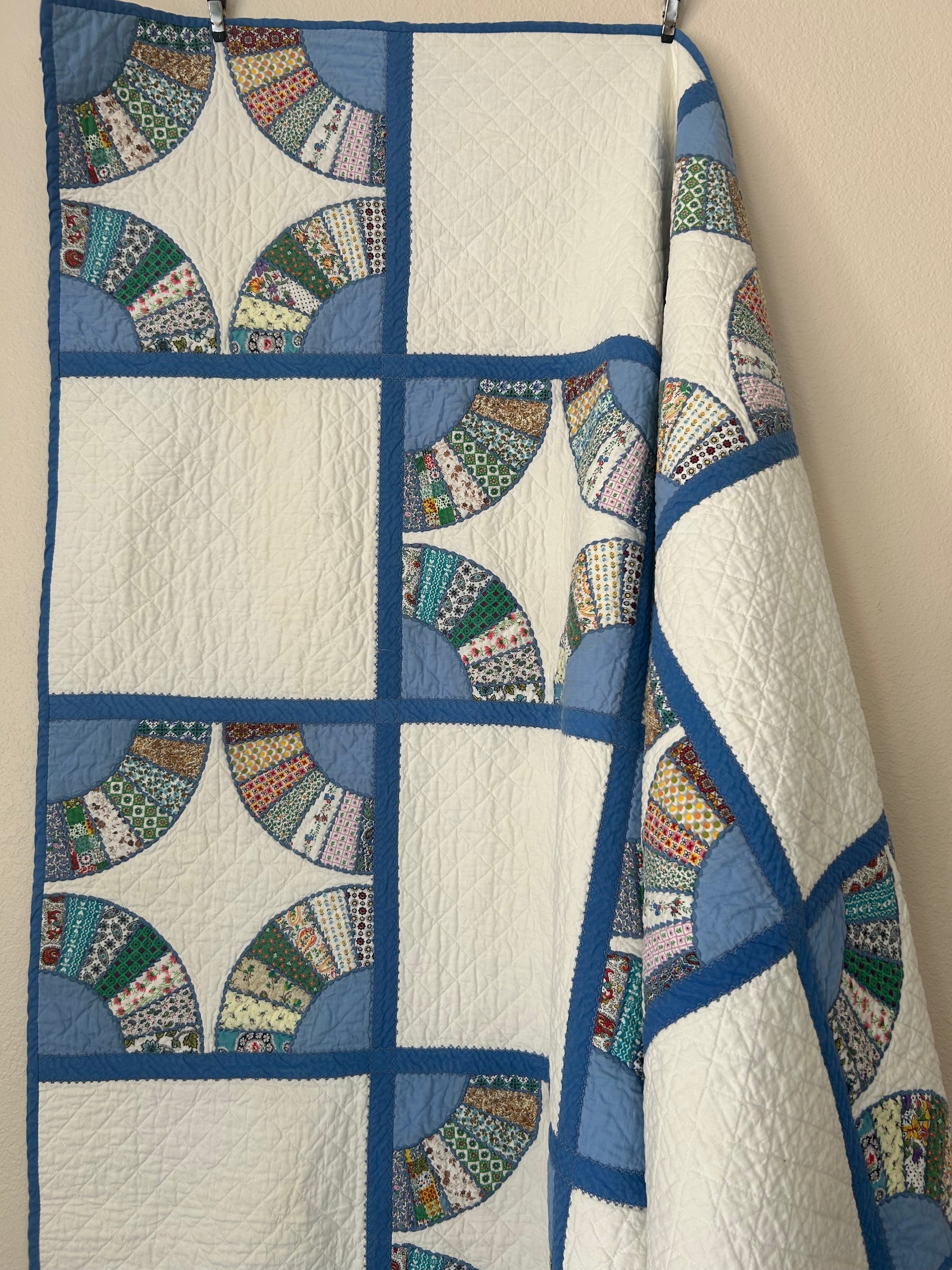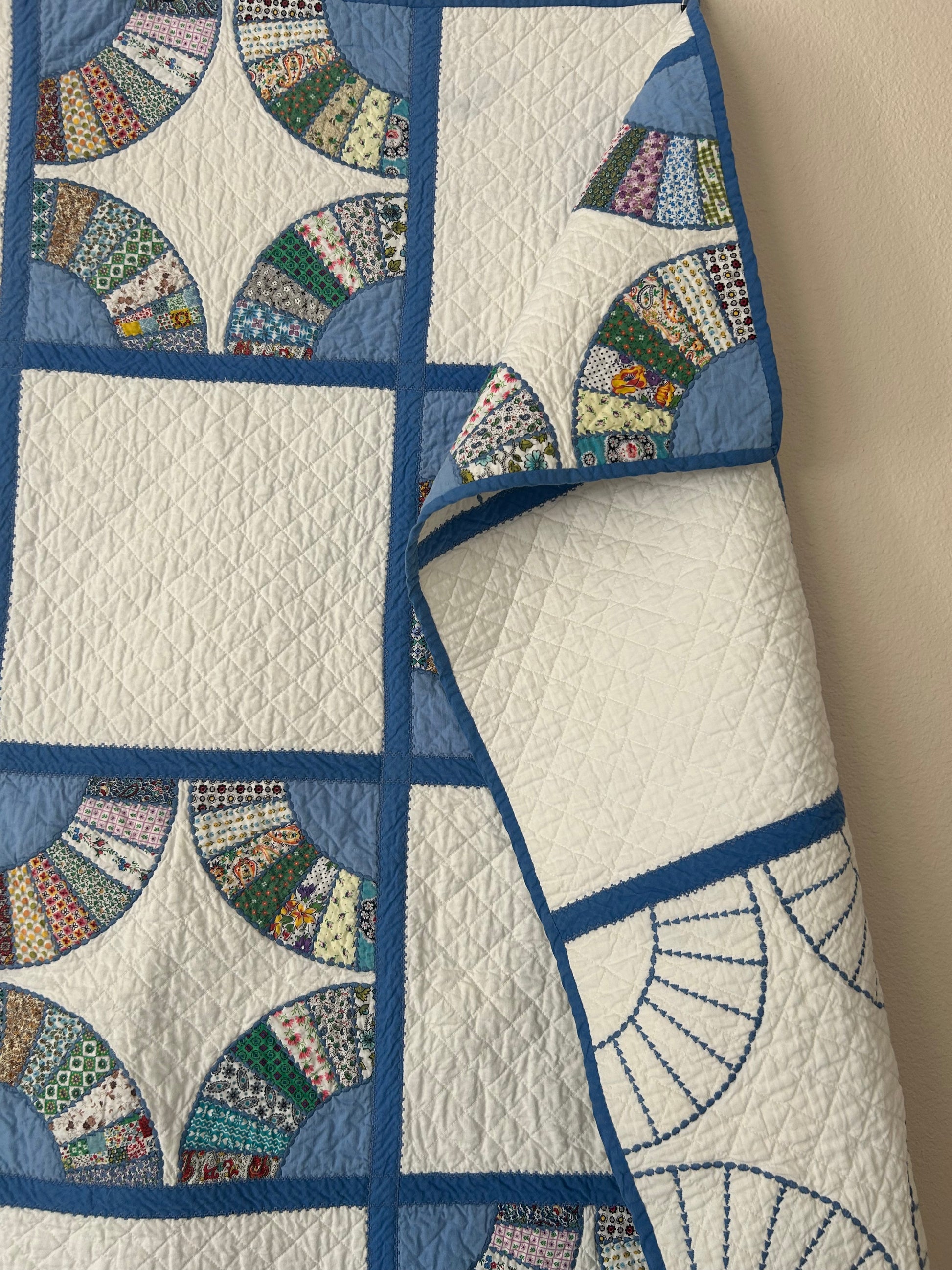 This stunning Blue Fan Quilt from the 1960s features a beautiful fan pattern with intricate appliqué details. Machine stitched, it offers both charm and craftsmanship. There’s ever so slight yellowing, which was hard to photograph, and a small spot, but overall, it remains a breathtaking piece.