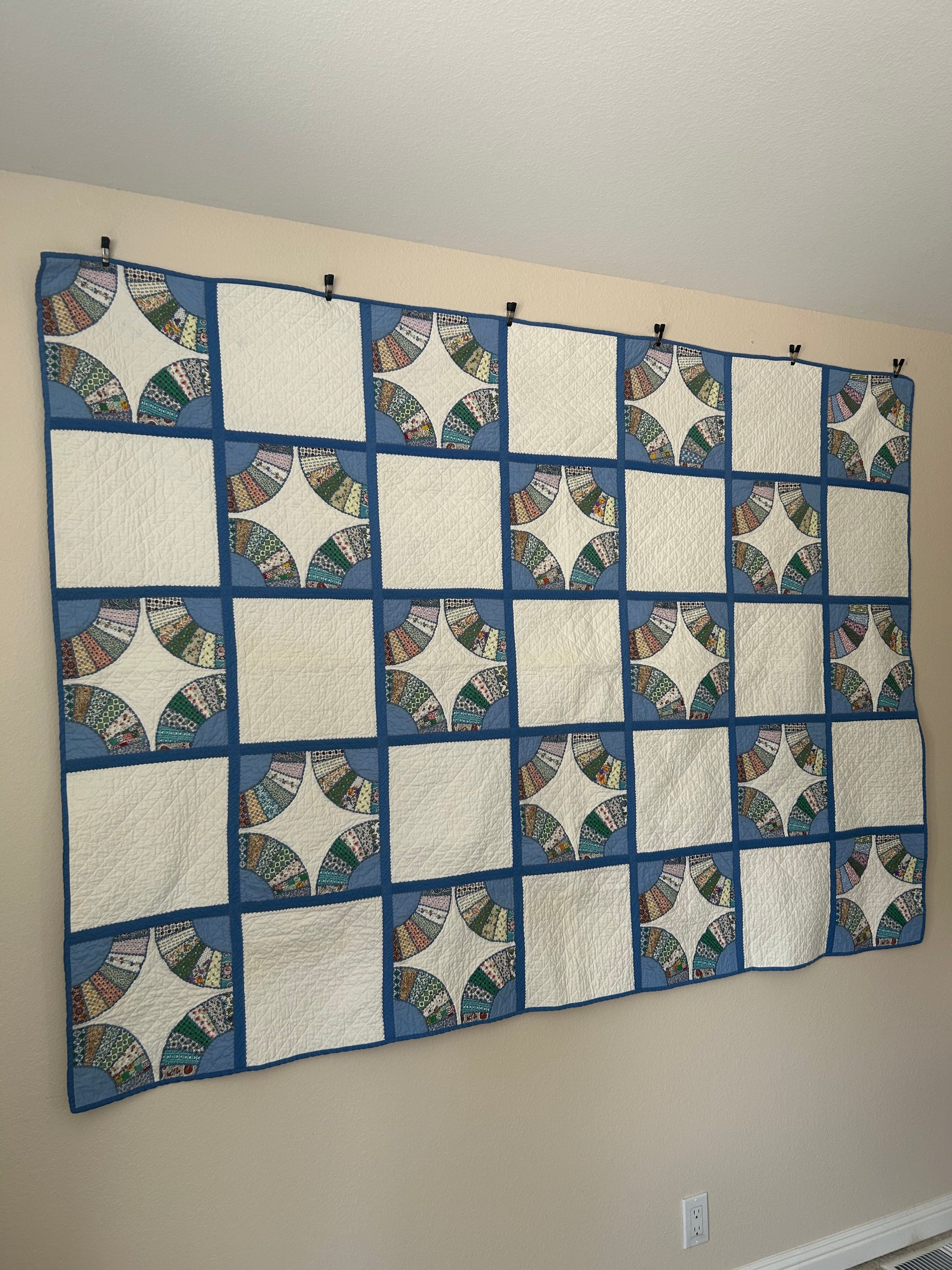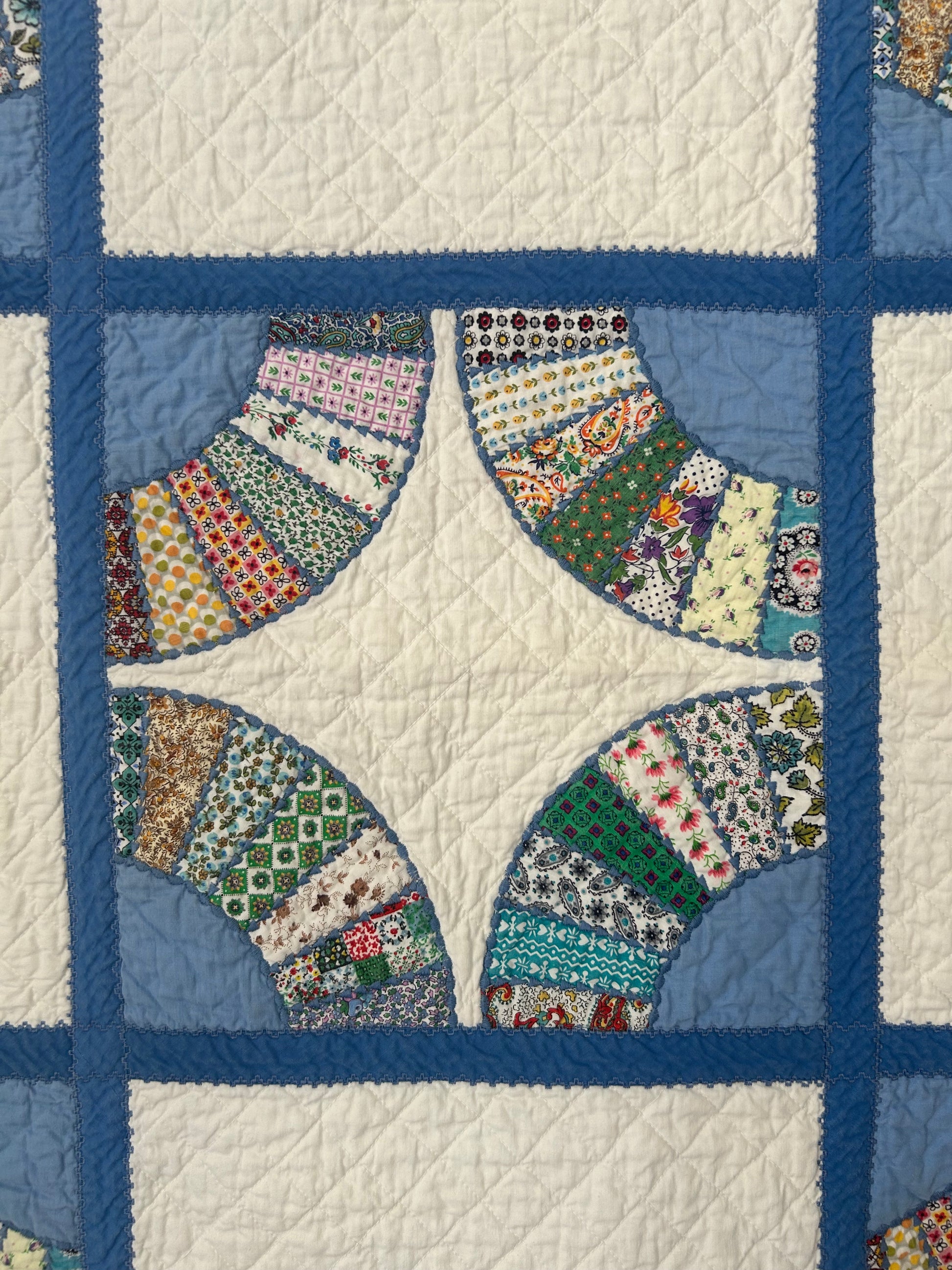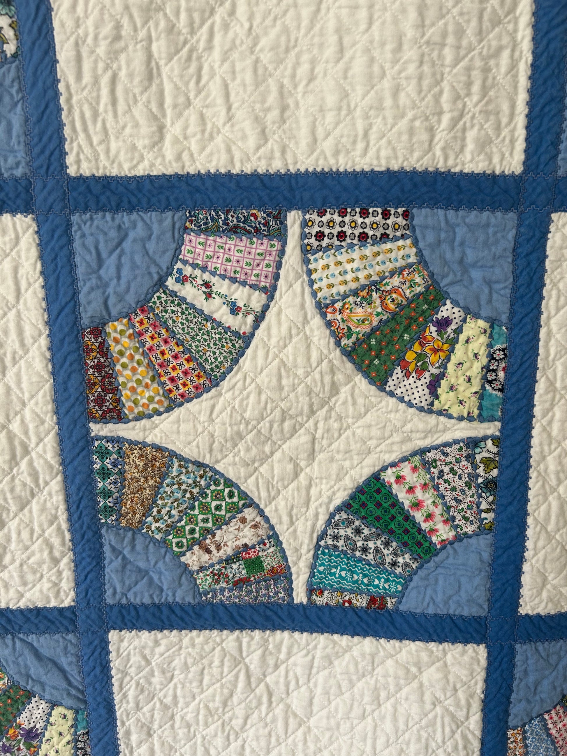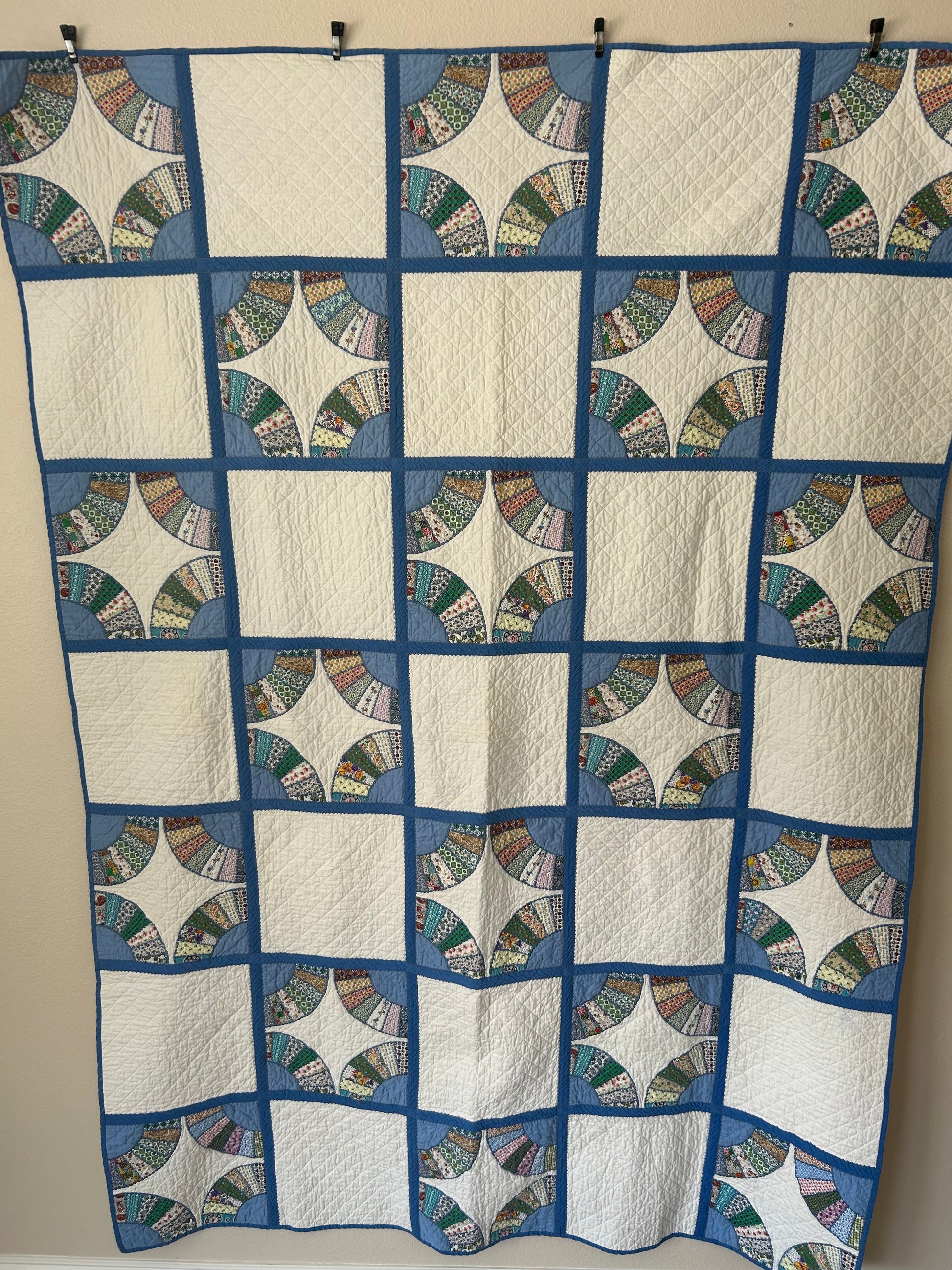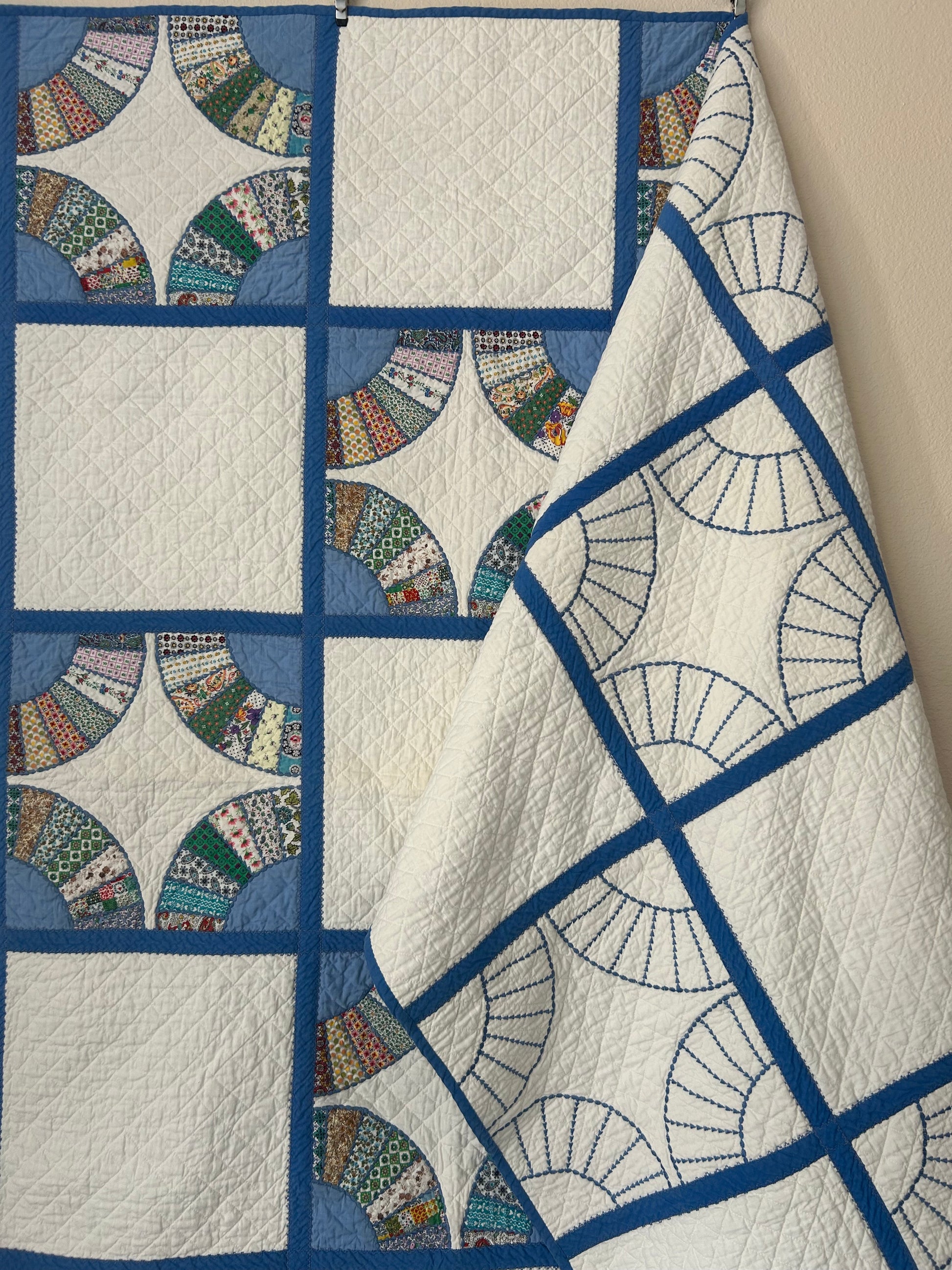 This stunning Blue Fan Quilt from the 1960s features a beautiful fan pattern with intricate appliqué details. Machine stitched, it offers both charm and craftsmanship. There’s ever so slight yellowing, which was hard to photograph, and a small spot, but overall, it remains a breathtaking piece.