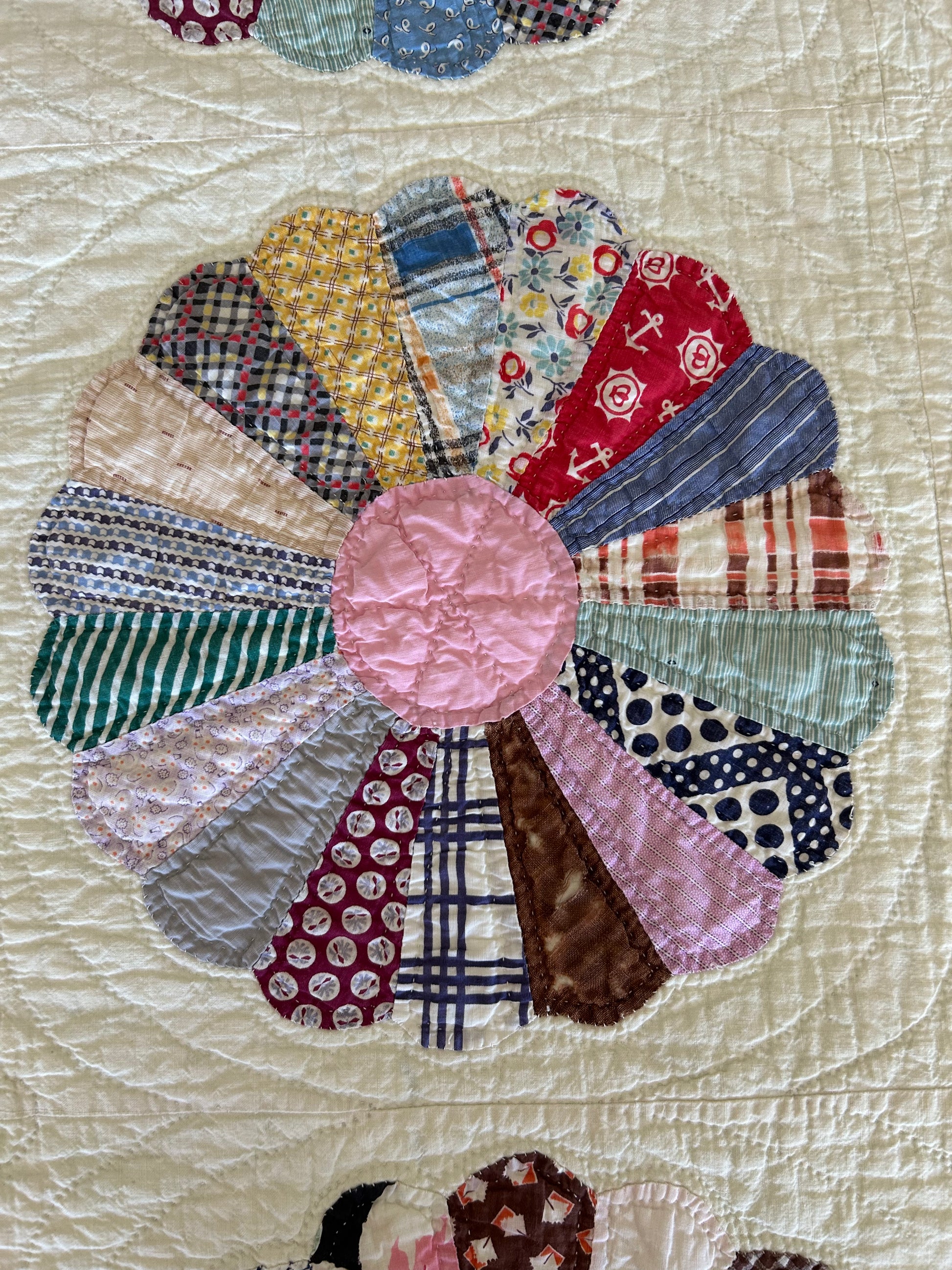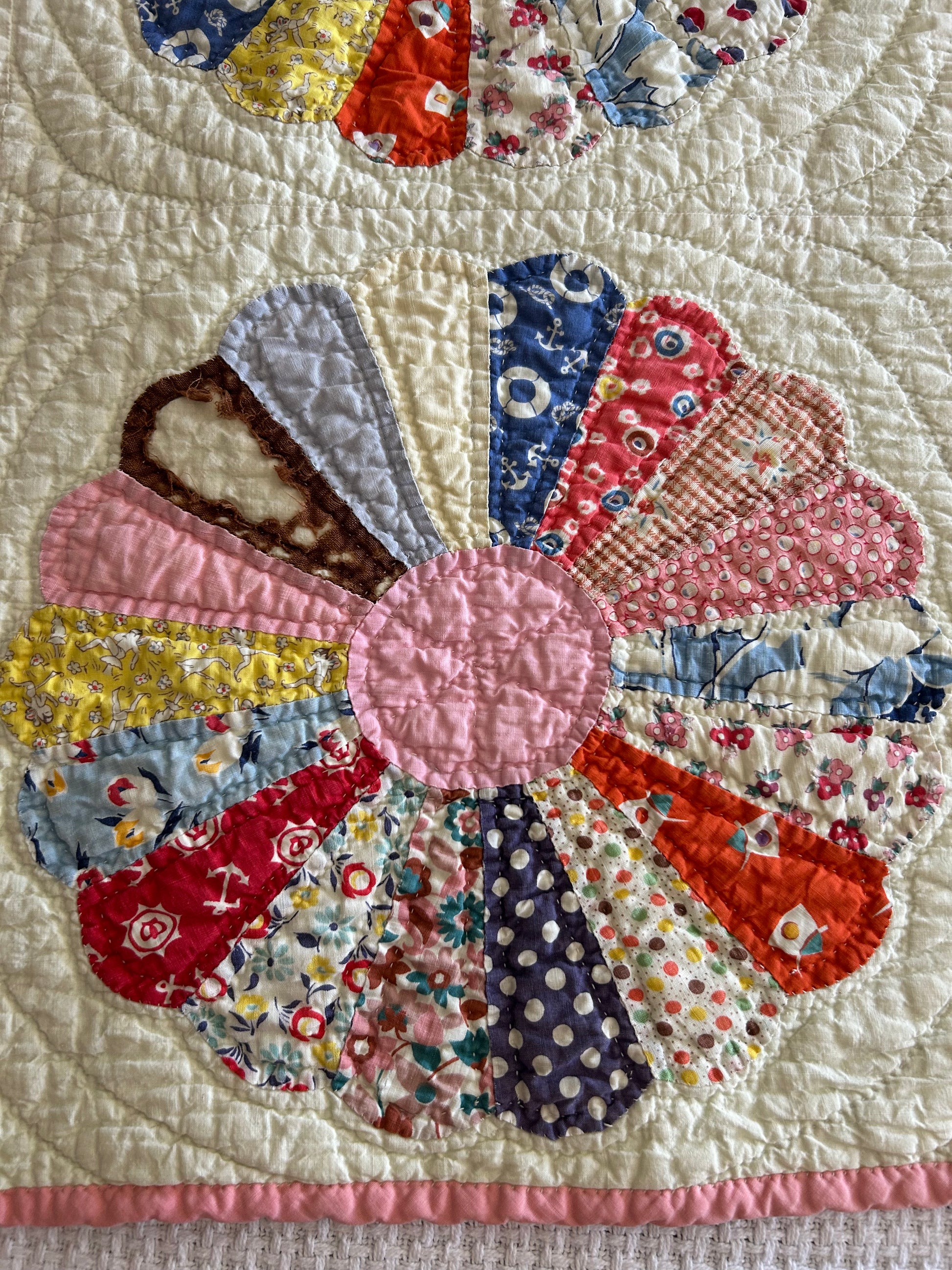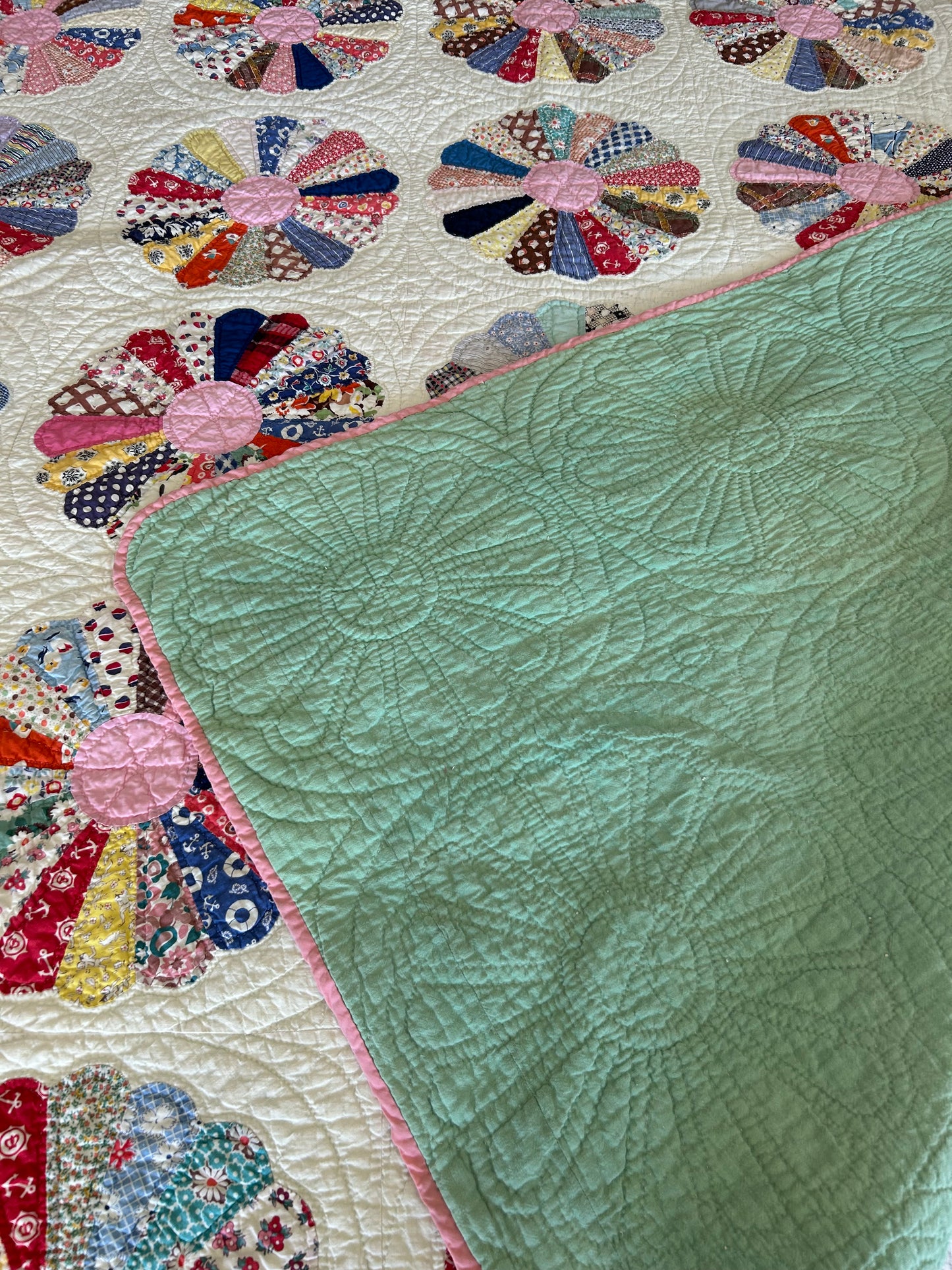 This vibrant Vintage Dresden Plate Quilt features cheerful, colorful plates on a yellow-green background, with pink binding and a bold green backing for extra pop. Hand stitched at 8 stitches per inch and machine pieced, it’s a beautifully crafted quilt that brings vintage charm to any space.