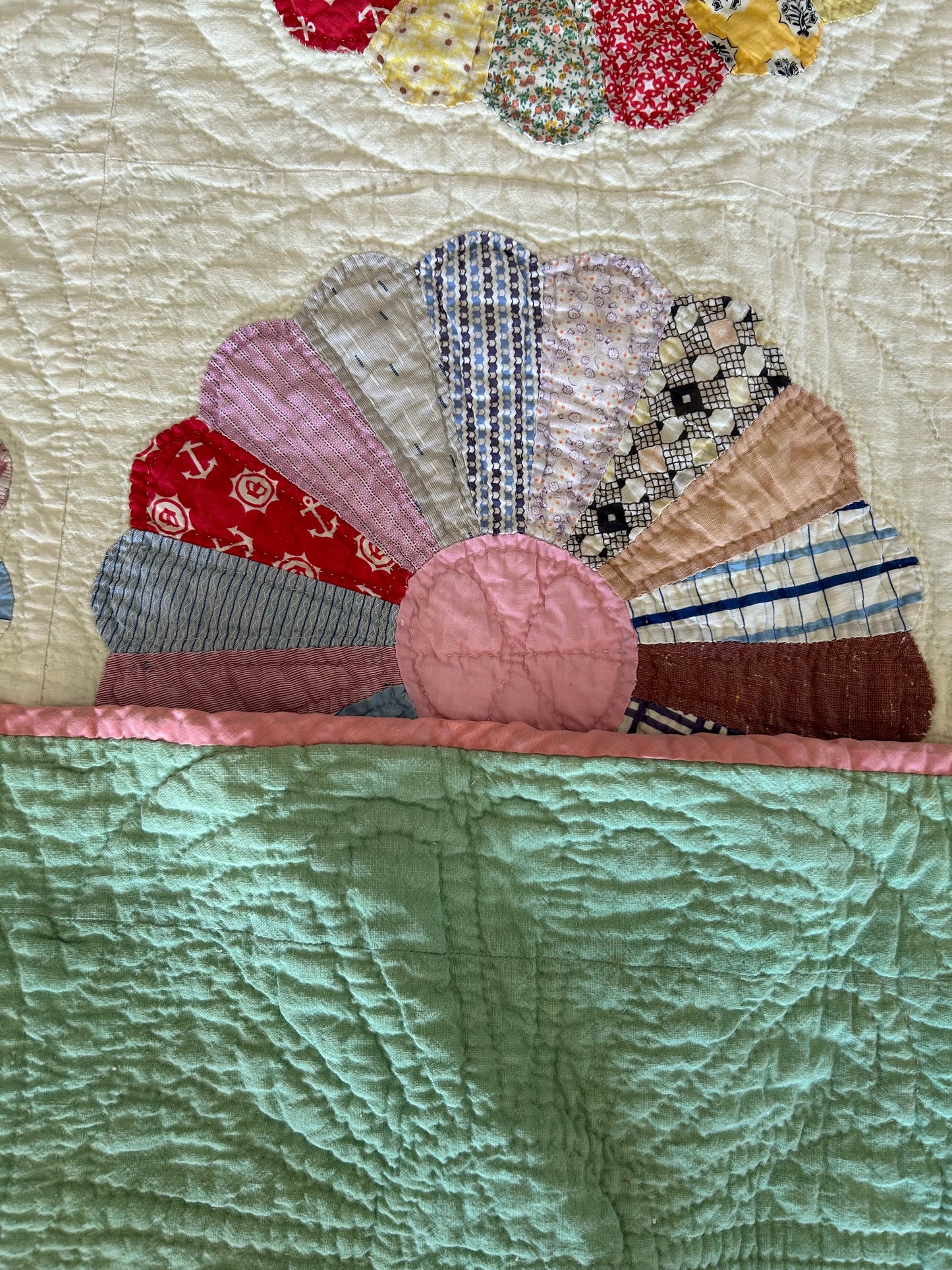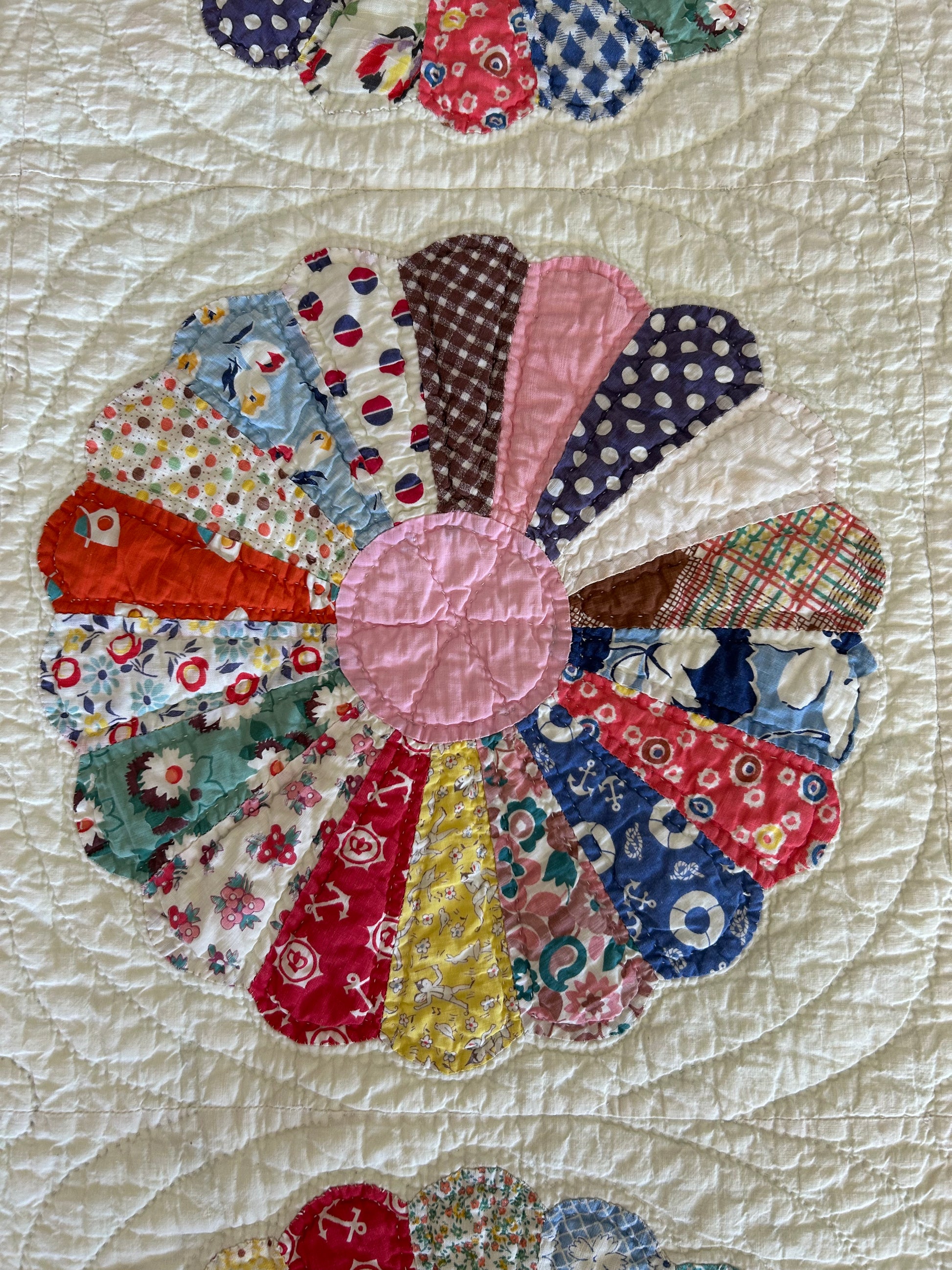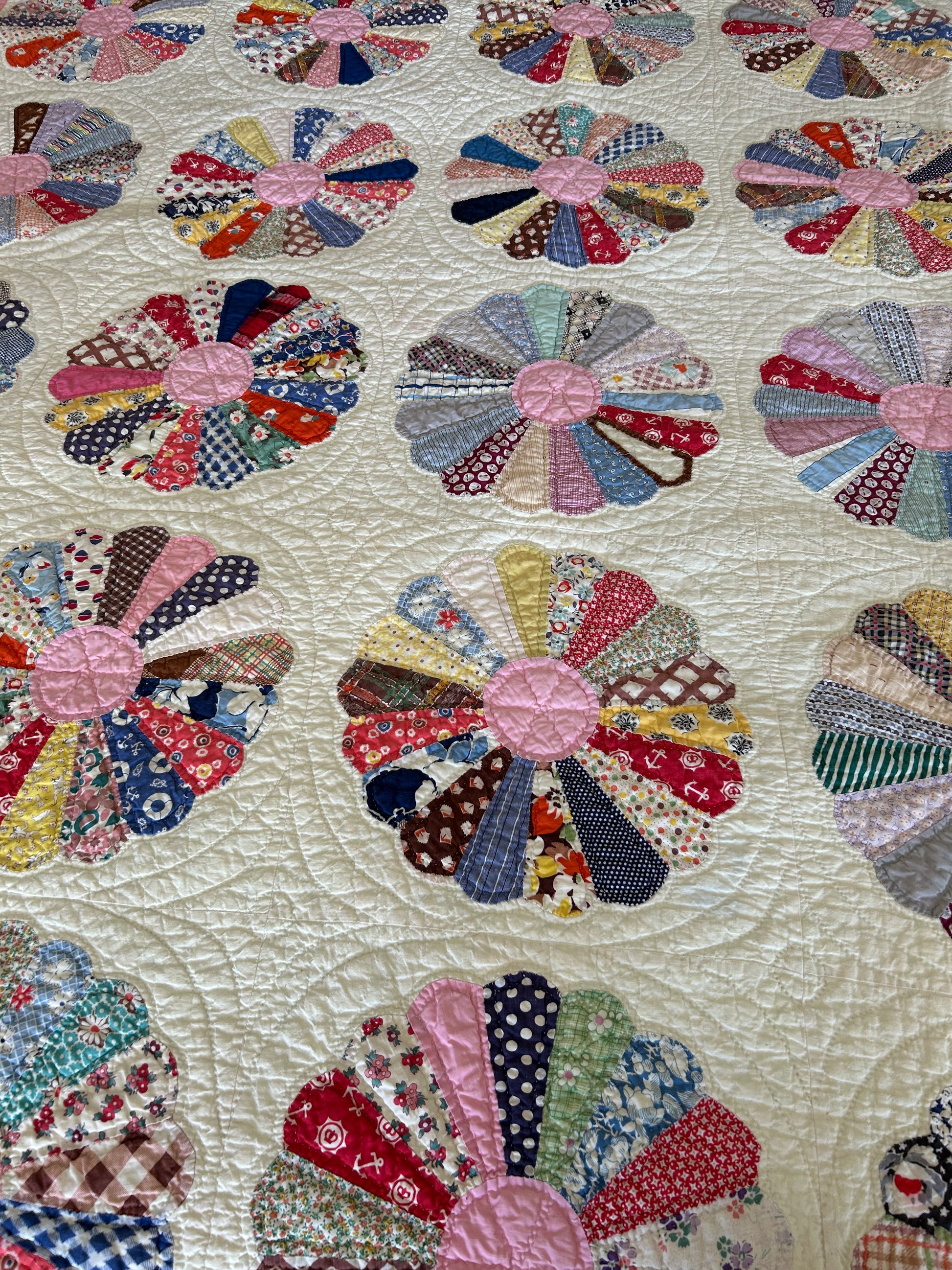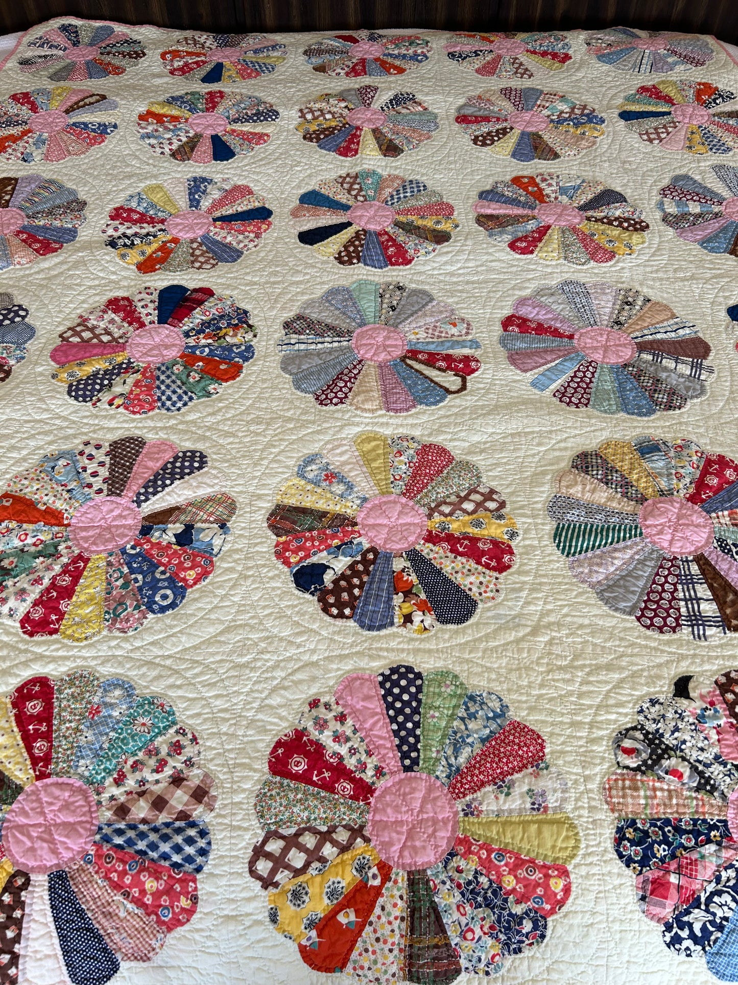 This vibrant Vintage Dresden Plate Quilt features cheerful, colorful plates on a yellow-green background, with pink binding and a bold green backing for extra pop. Hand stitched at 8 stitches per inch and machine pieced, it’s a beautifully crafted quilt that brings vintage charm to any space.