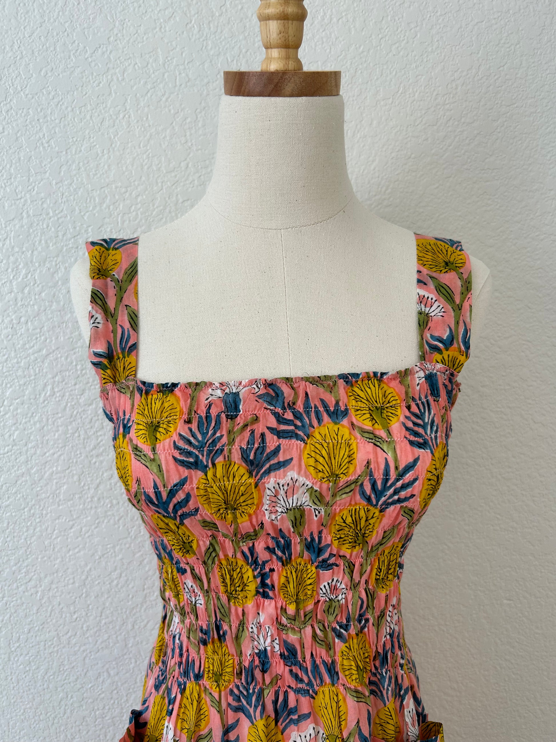 This beautiful sleeveless midi sundress by Shade Amour features a pink and yellow floral print. It has a stretchy gathered bust and a free-flowing skirt, making it both flattering and comfortable.