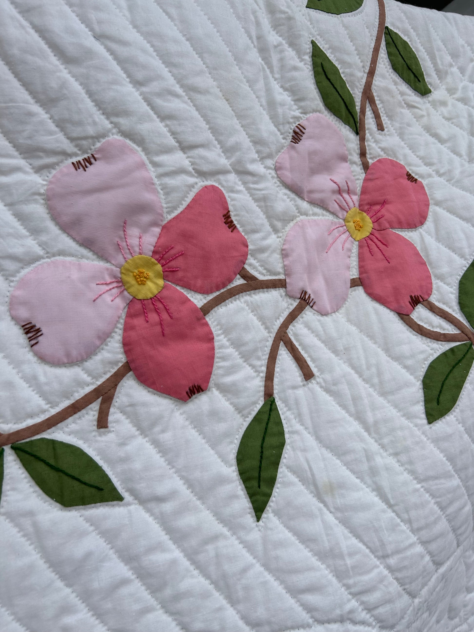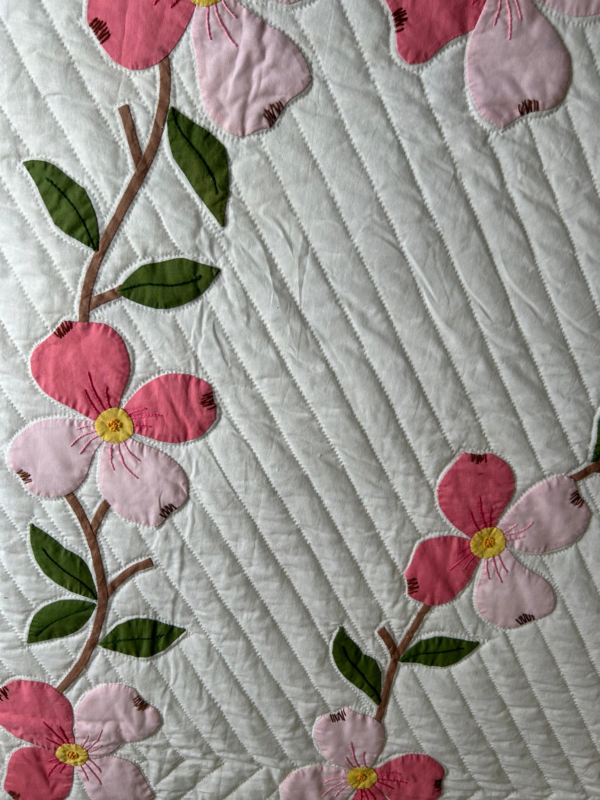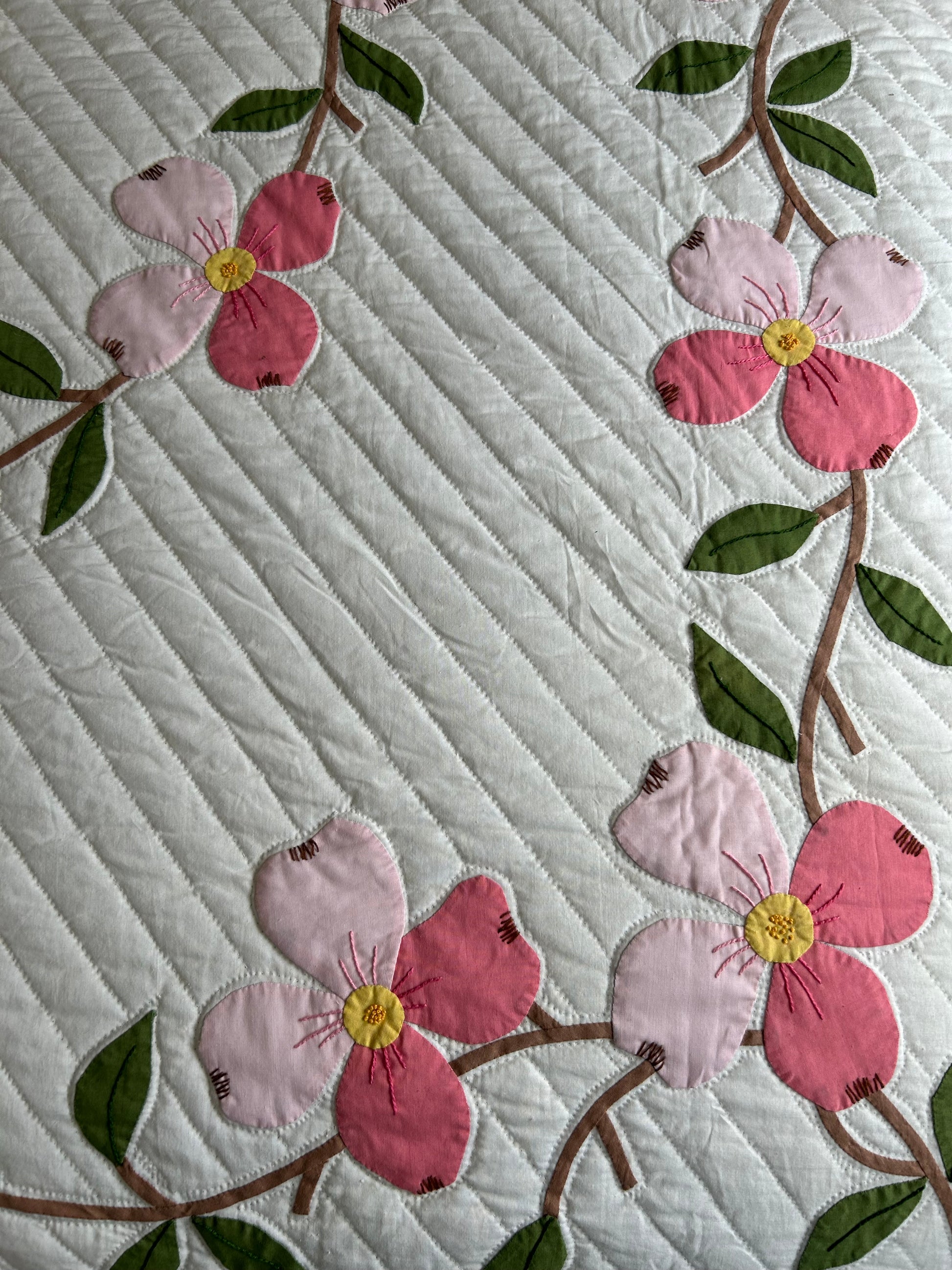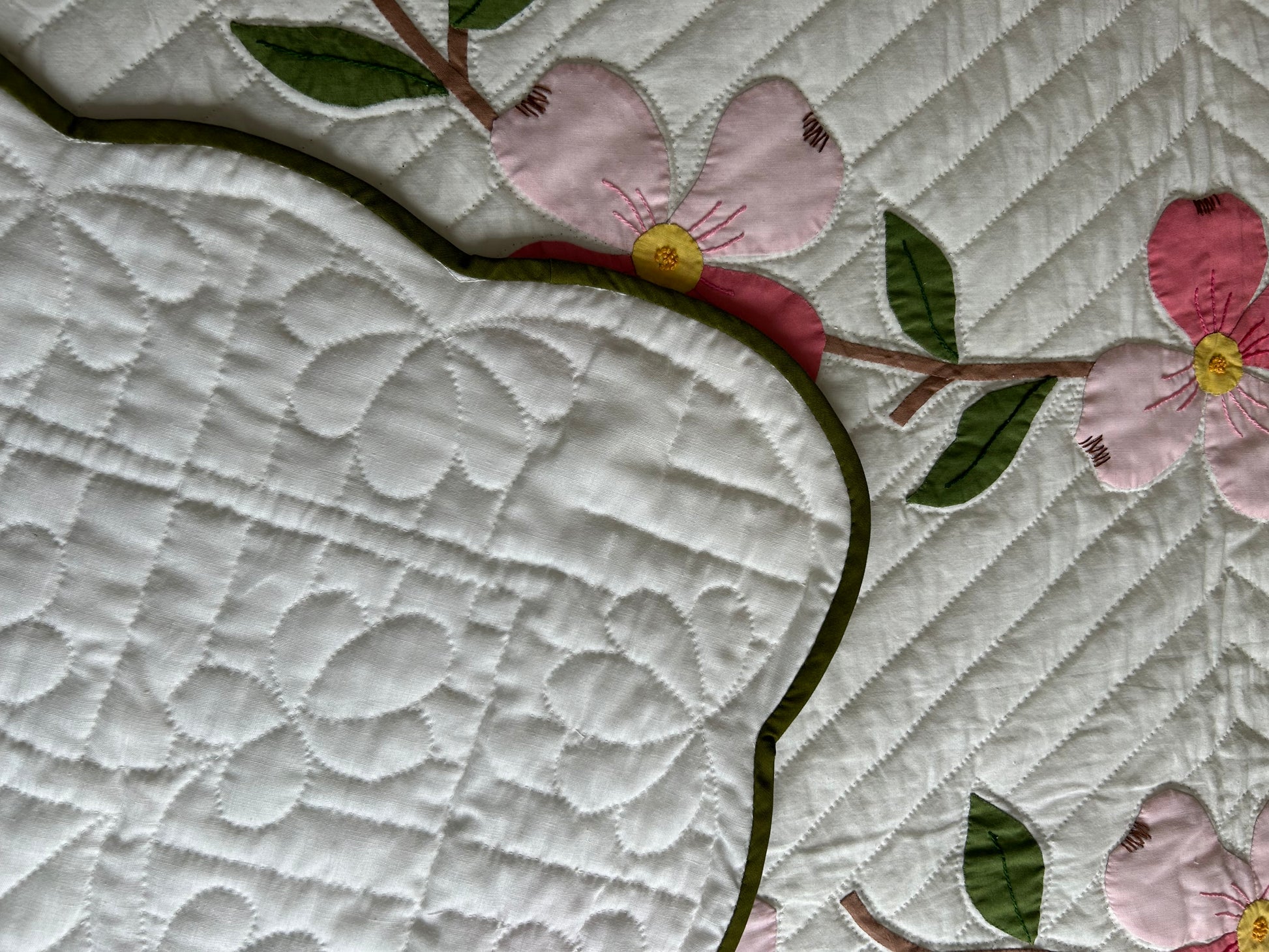 A soft pink and white dogwood appliqué design with hand-stitched details and machine-pieced craftsmanship. This light, unused quilt is beautifully preserved, with pencil marks from quilting still visible, and a green scalloped binding for a sweet finish.