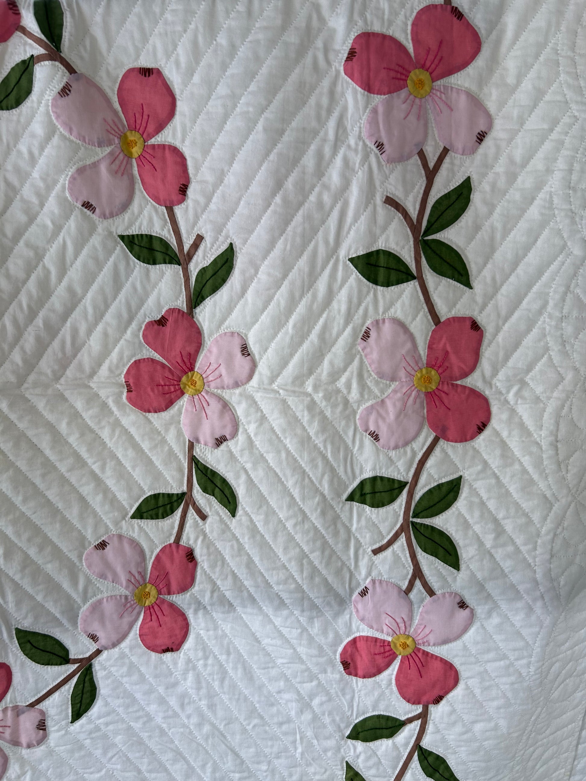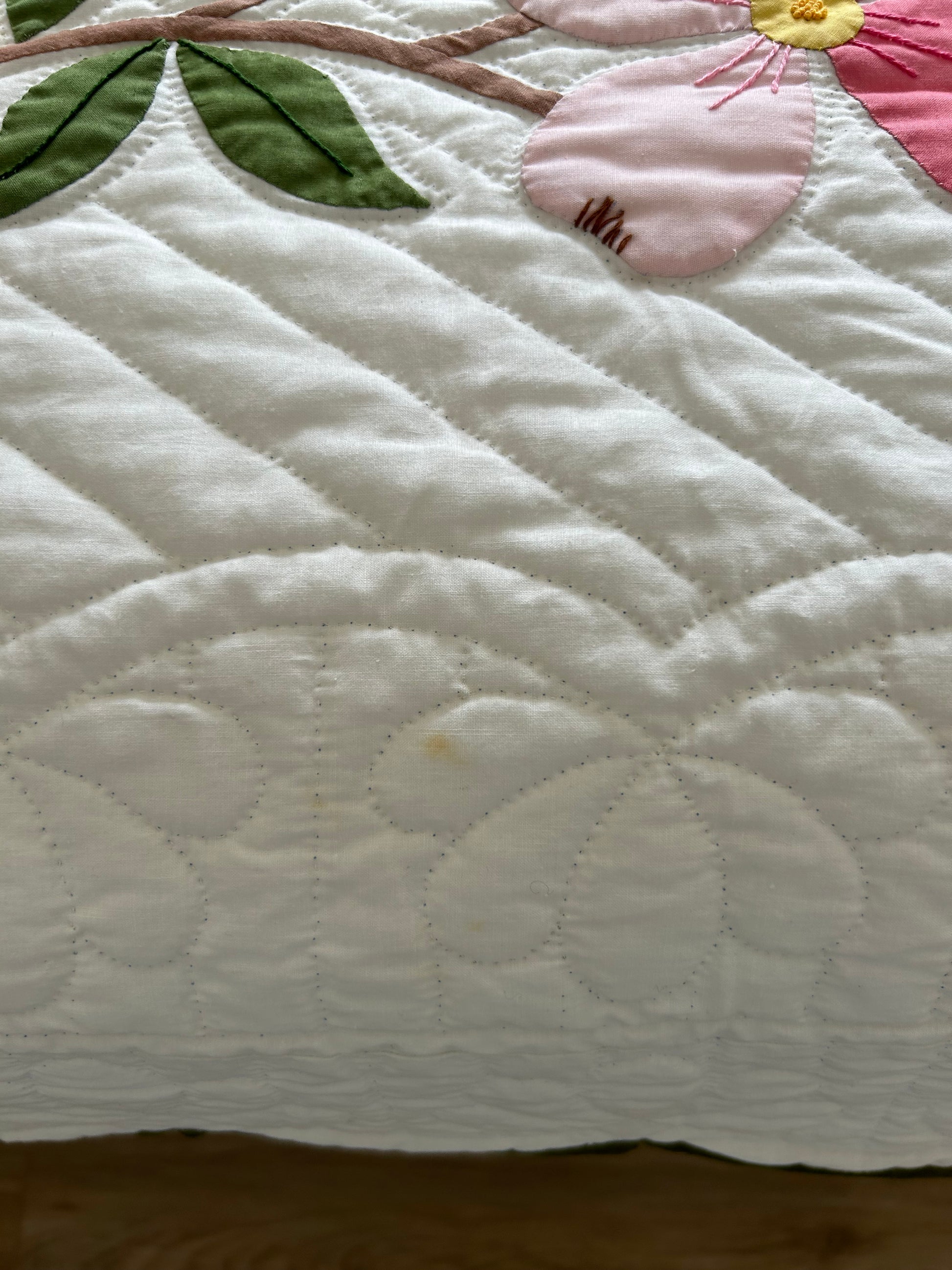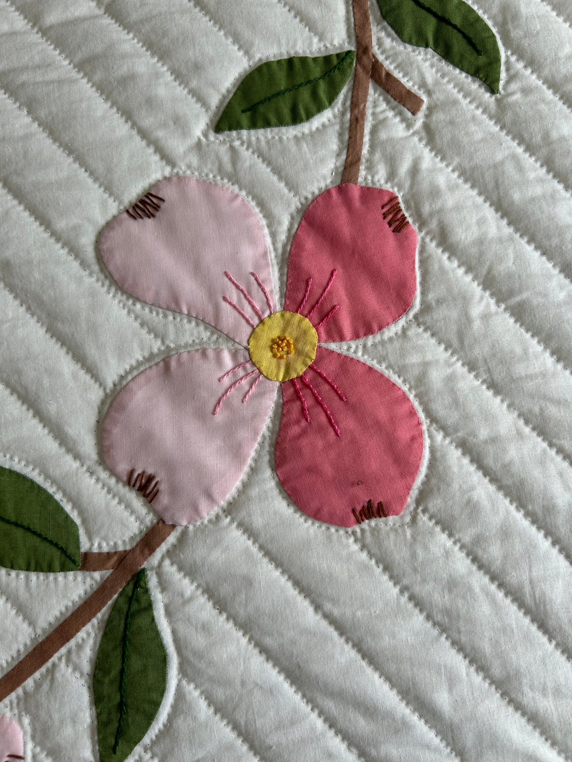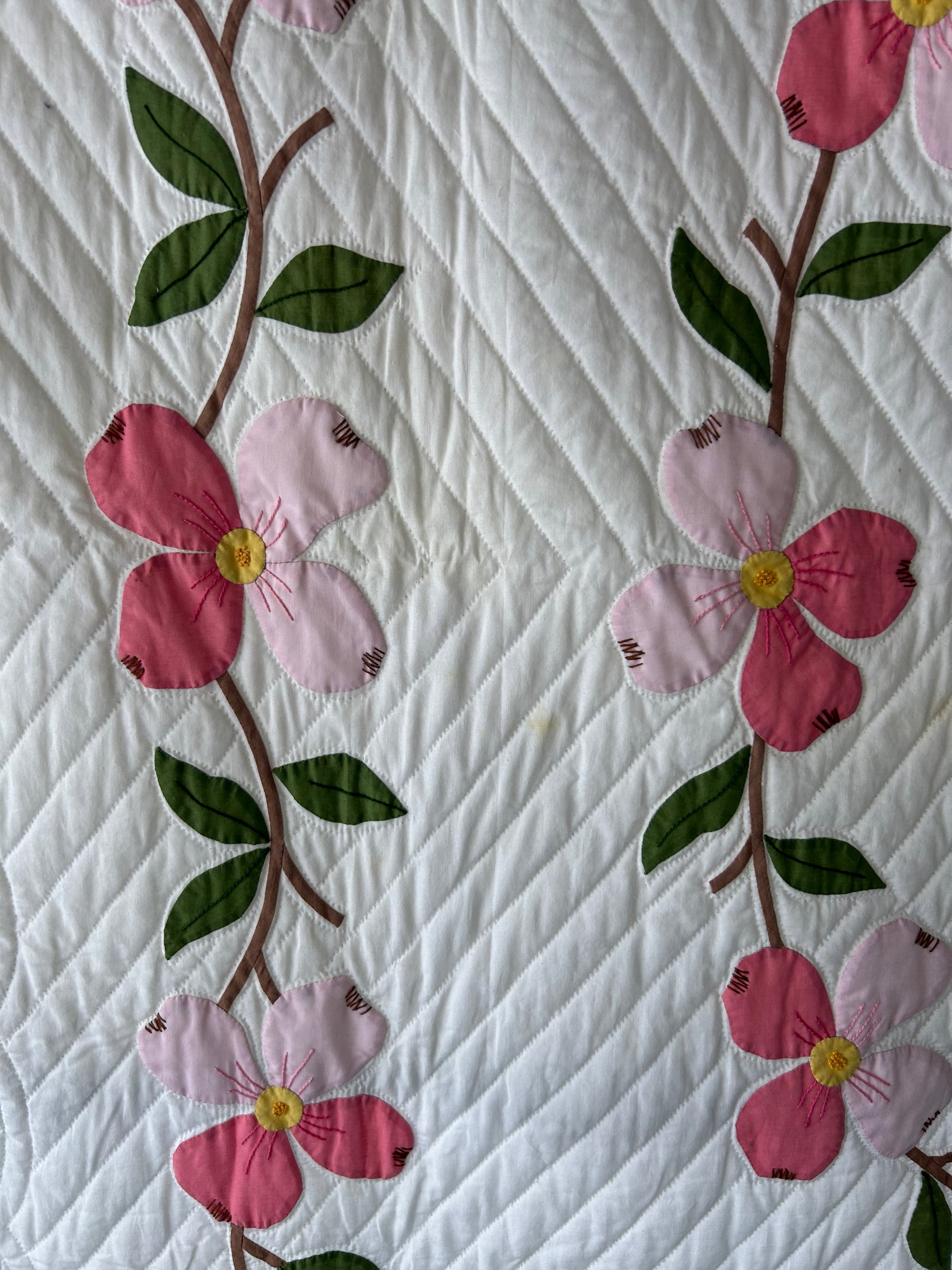 A soft pink and white dogwood appliqué design with hand-stitched details and machine-pieced craftsmanship. This light, unused quilt is beautifully preserved, with pencil marks from quilting still visible, and a green scalloped binding for a sweet finish.