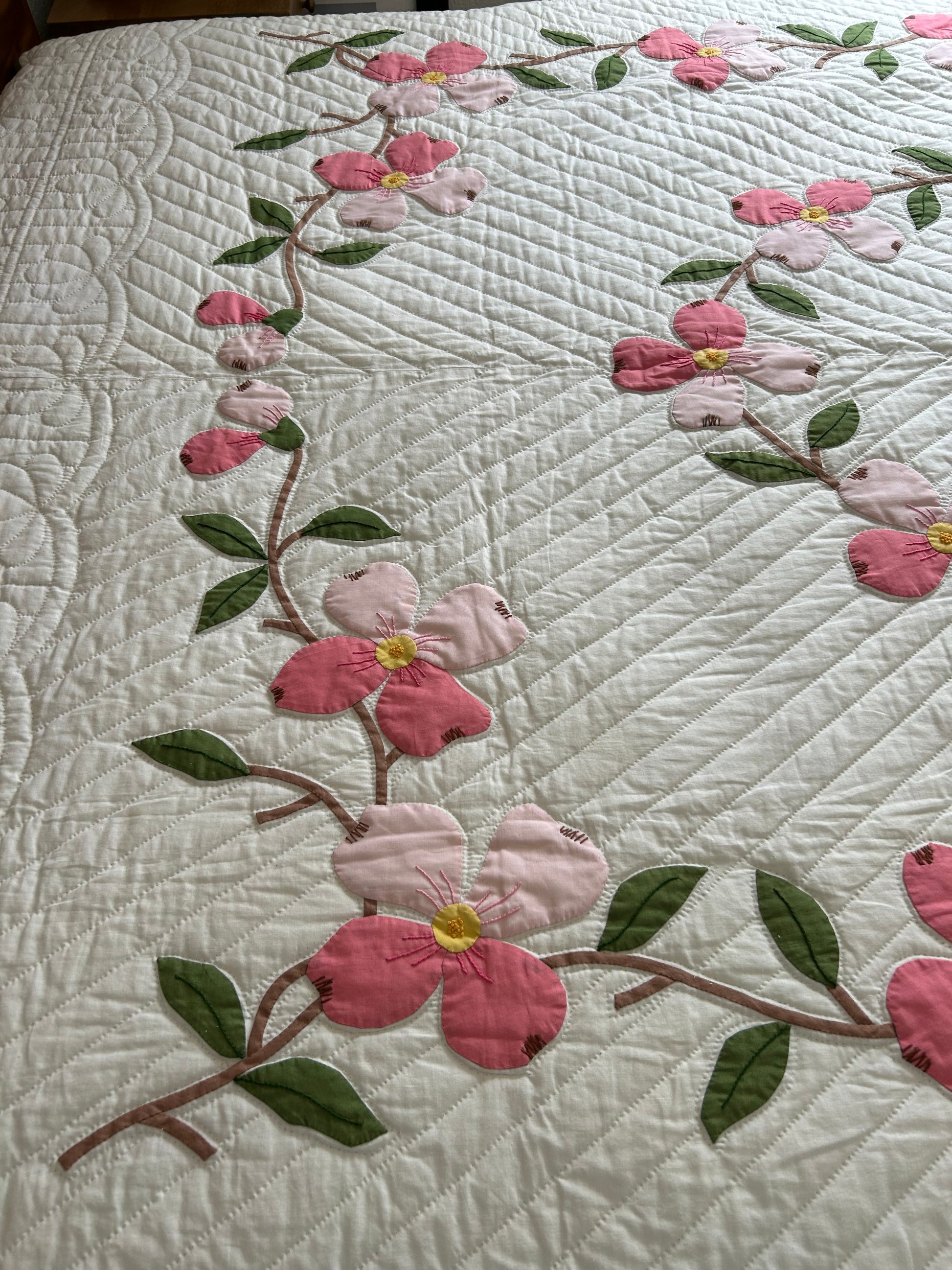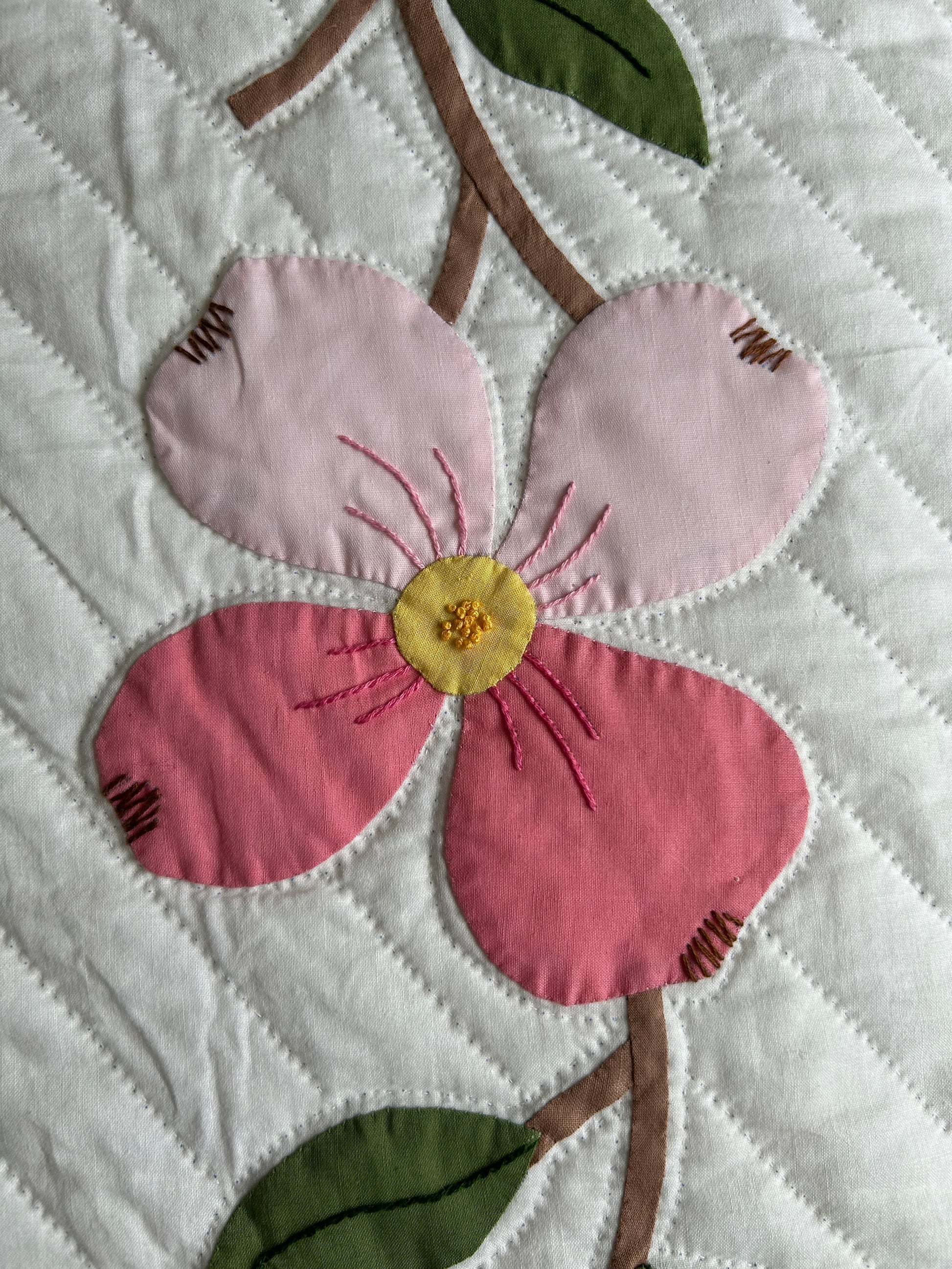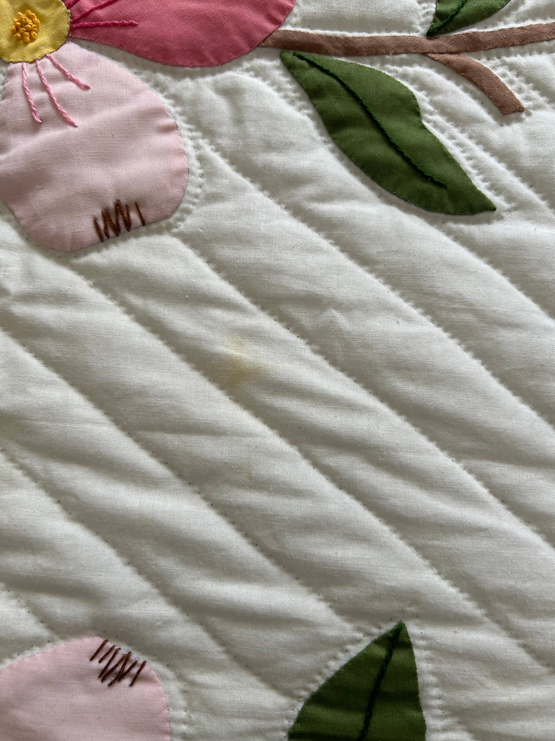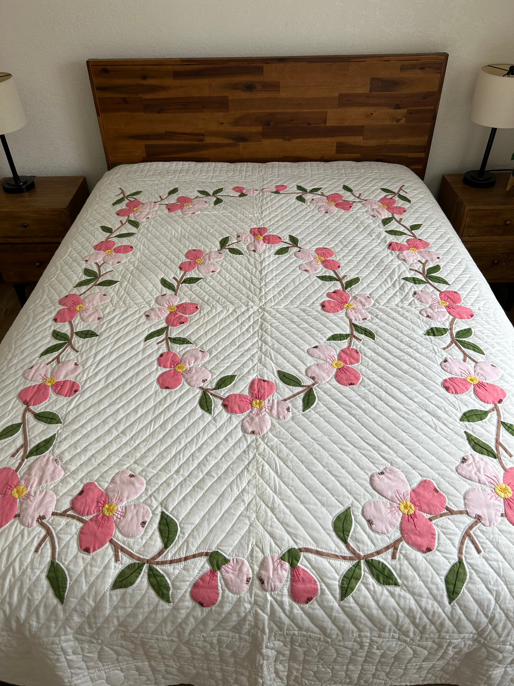 A soft pink and white dogwood appliqué design with hand-stitched details and machine-pieced craftsmanship. This light, unused quilt is beautifully preserved, with pencil marks from quilting still visible, and a green scalloped binding for a sweet finish.