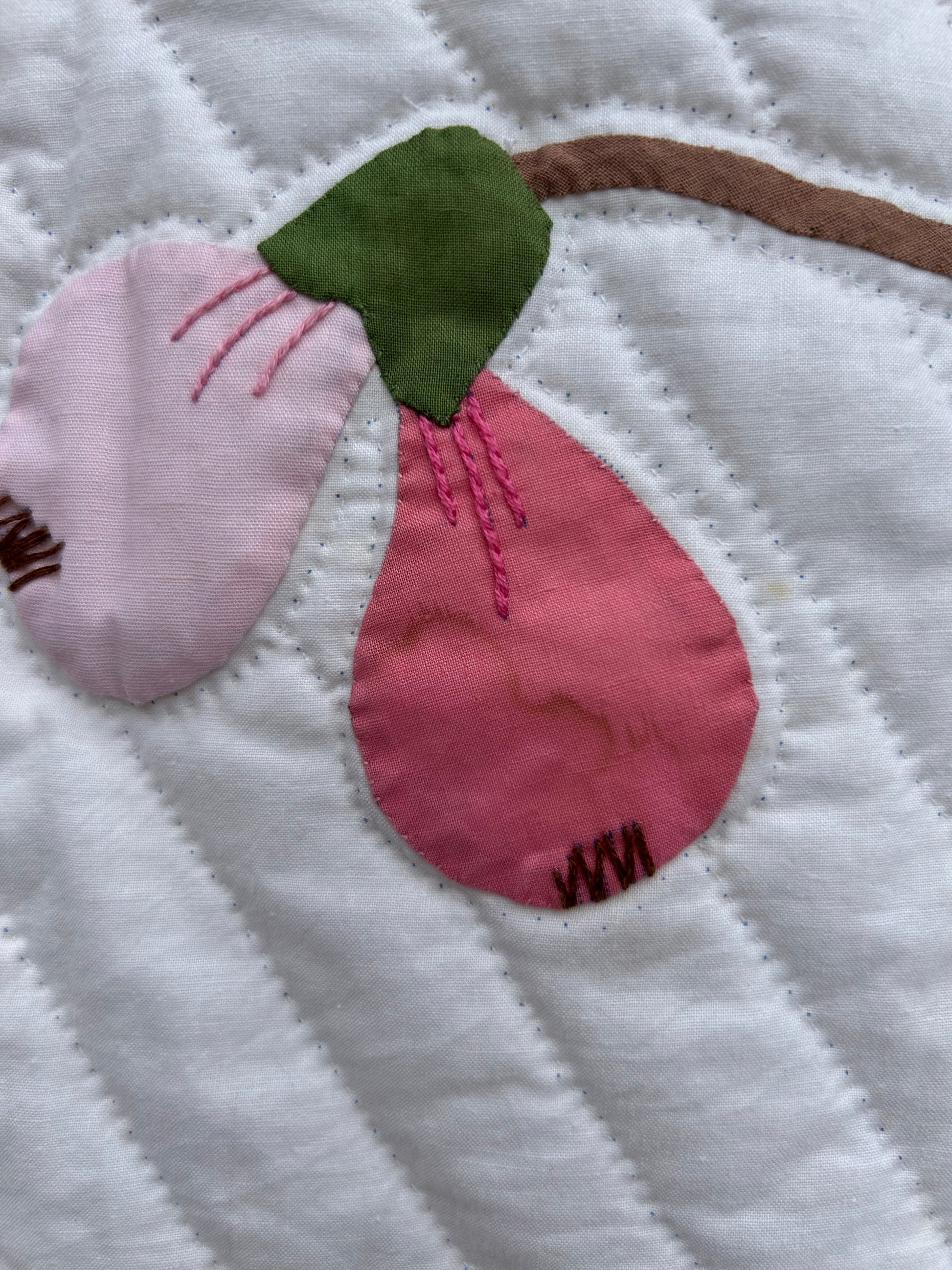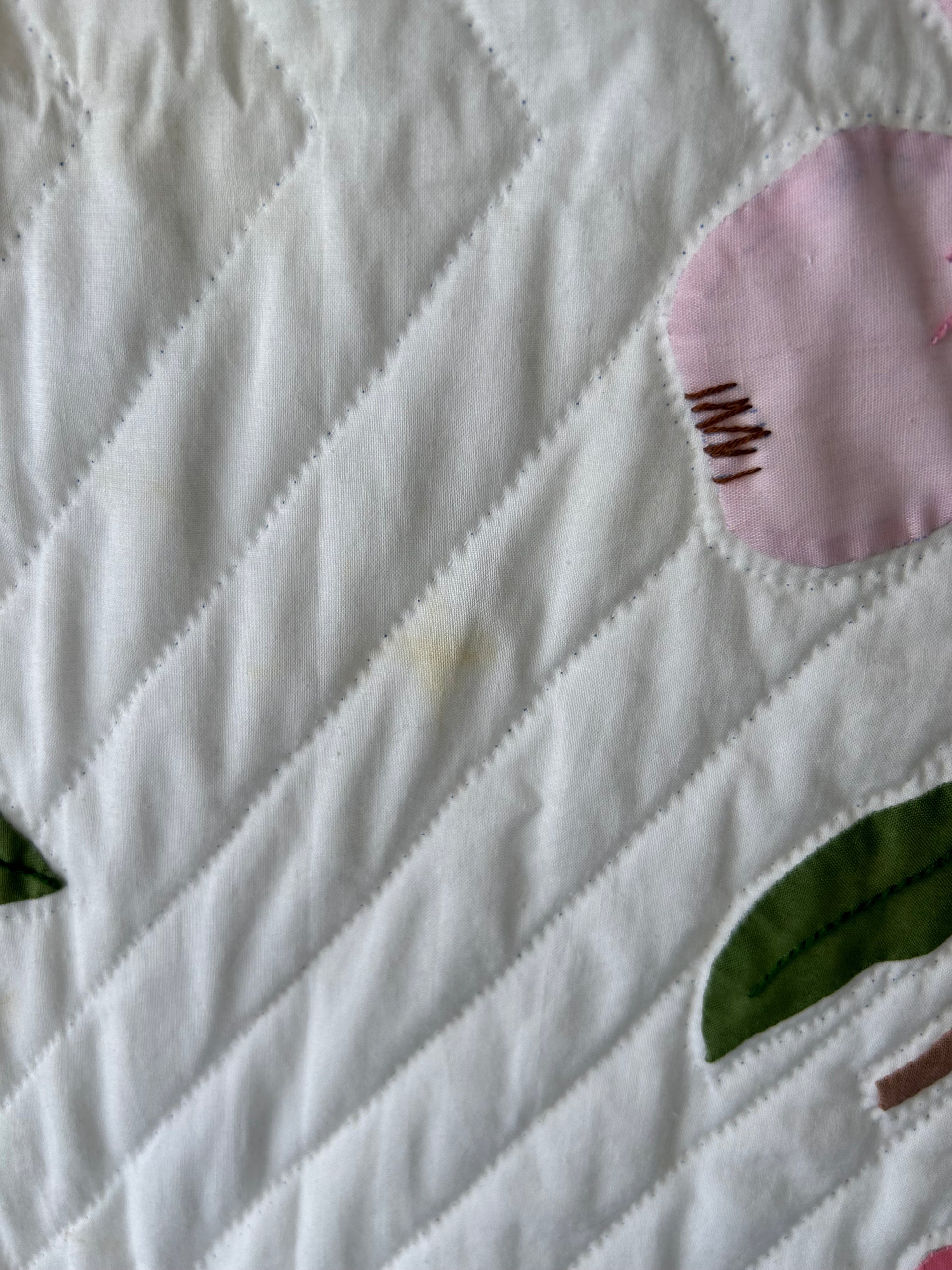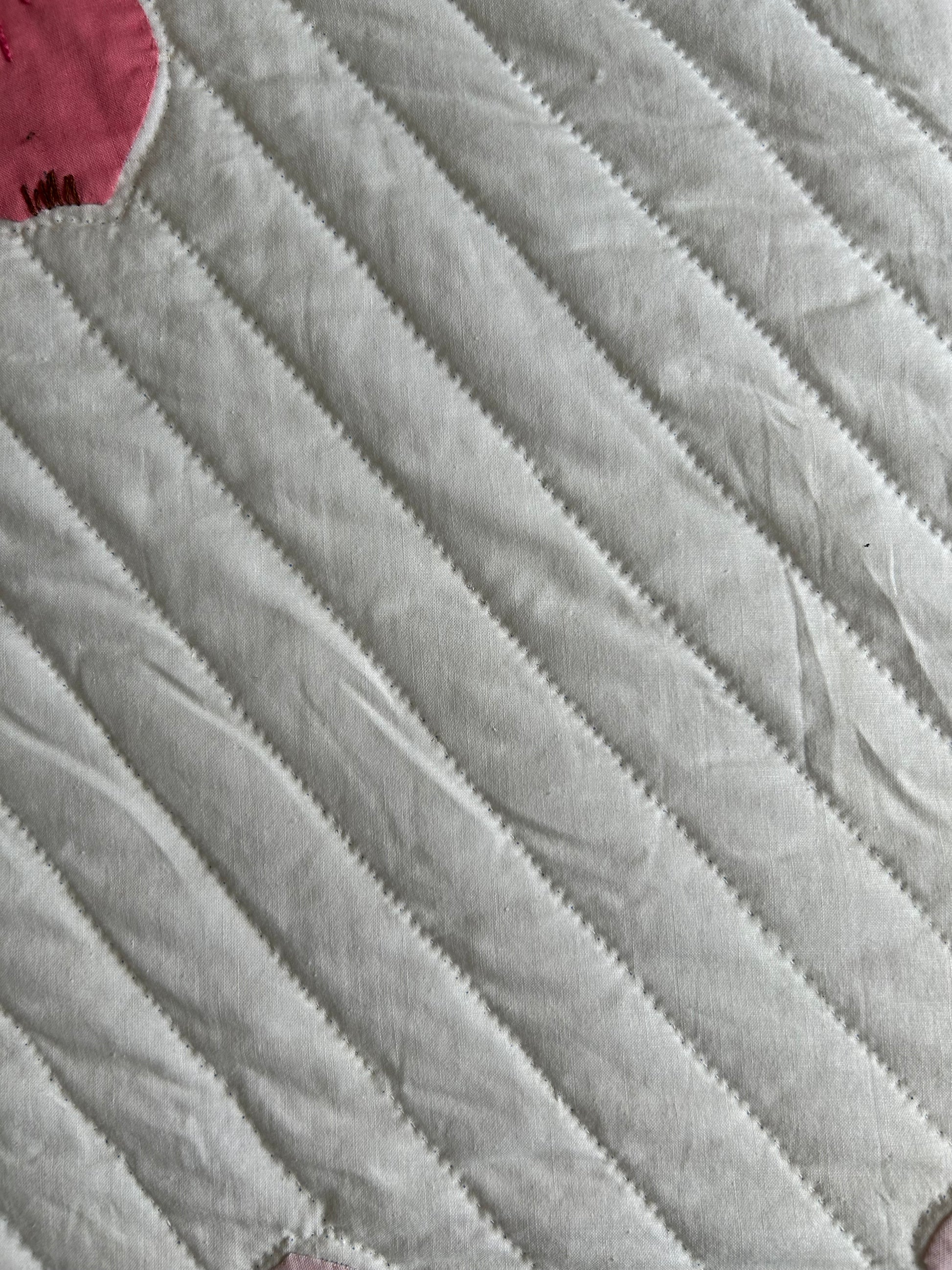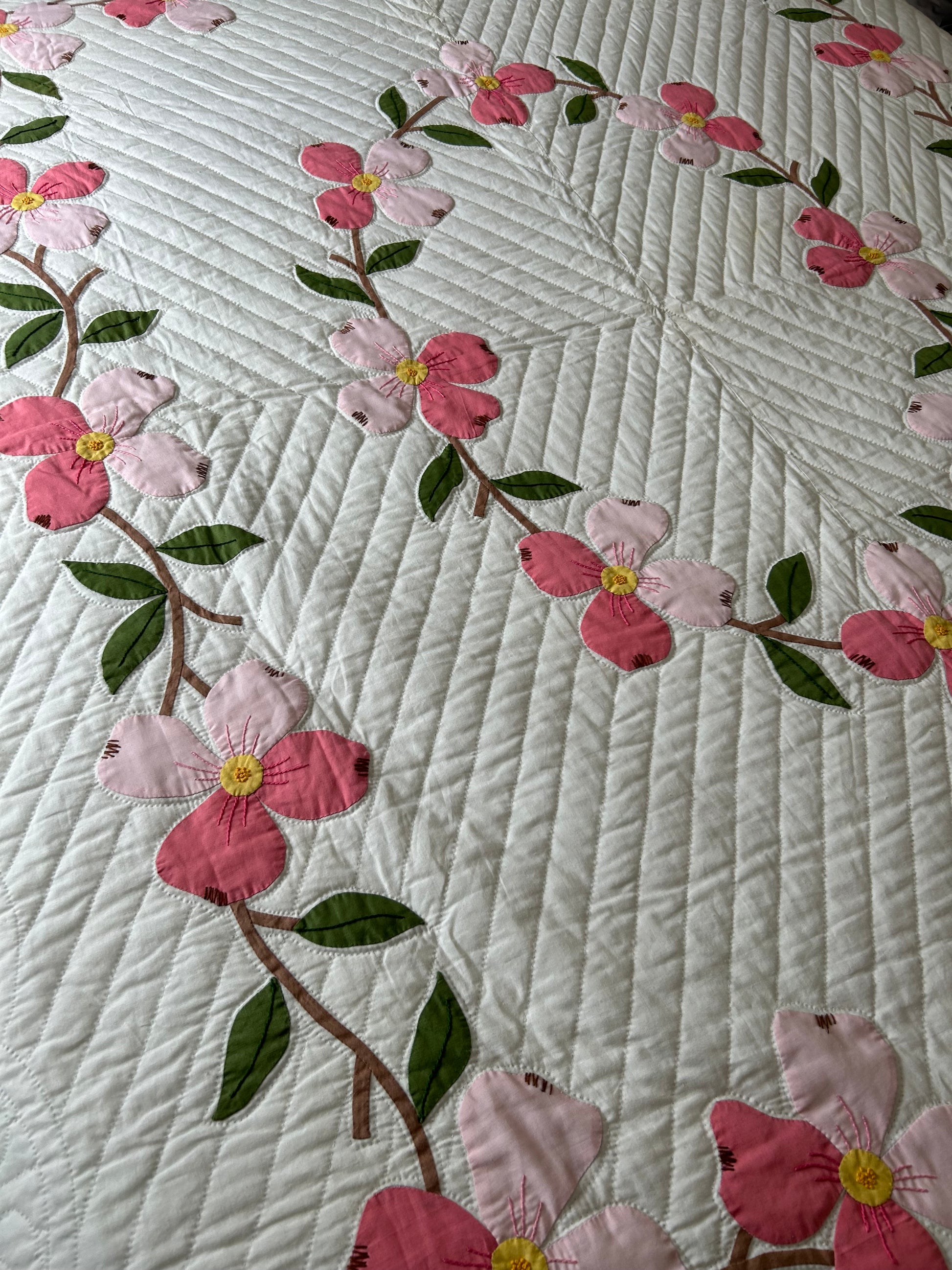 A soft pink and white dogwood appliqué design with hand-stitched details and machine-pieced craftsmanship. This light, unused quilt is beautifully preserved, with pencil marks from quilting still visible, and a green scalloped binding for a sweet finish.