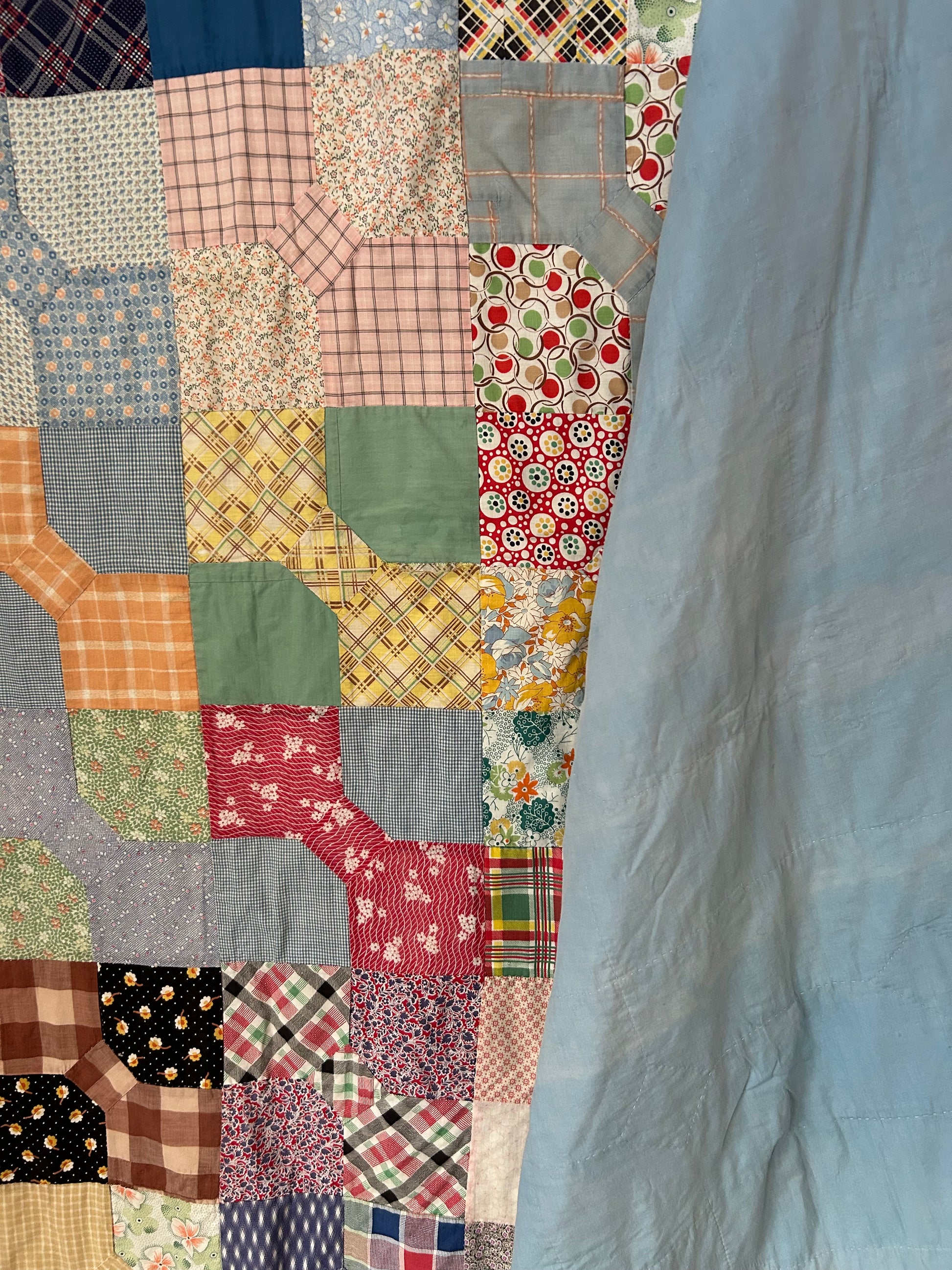 This 1950s Feedsack Bow Tie Quilt features a classic Bow Tie pattern with a variety of vintage fabrics and a charming blue binding. Two different blue fabrics are used on the back, adding a unique touch. Some fading, holes, and tears are present, consistent with its age, but it remains a nostalgic and cozy piece full of vintage character.
