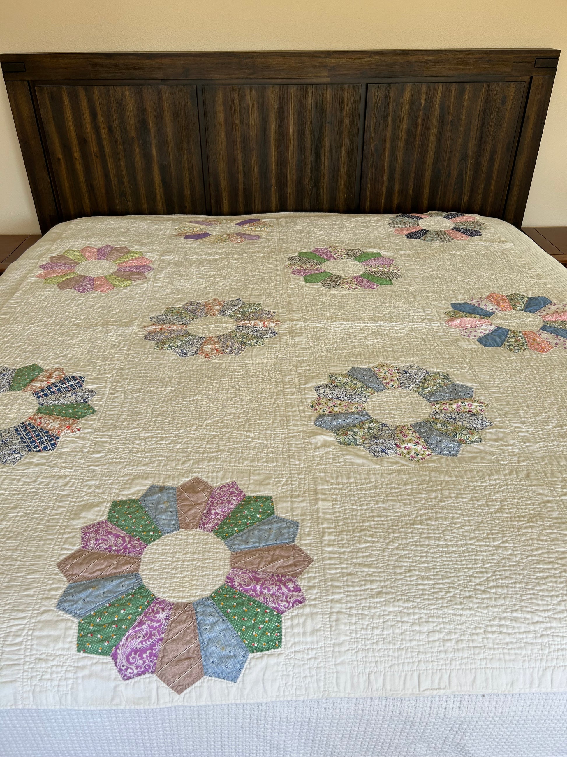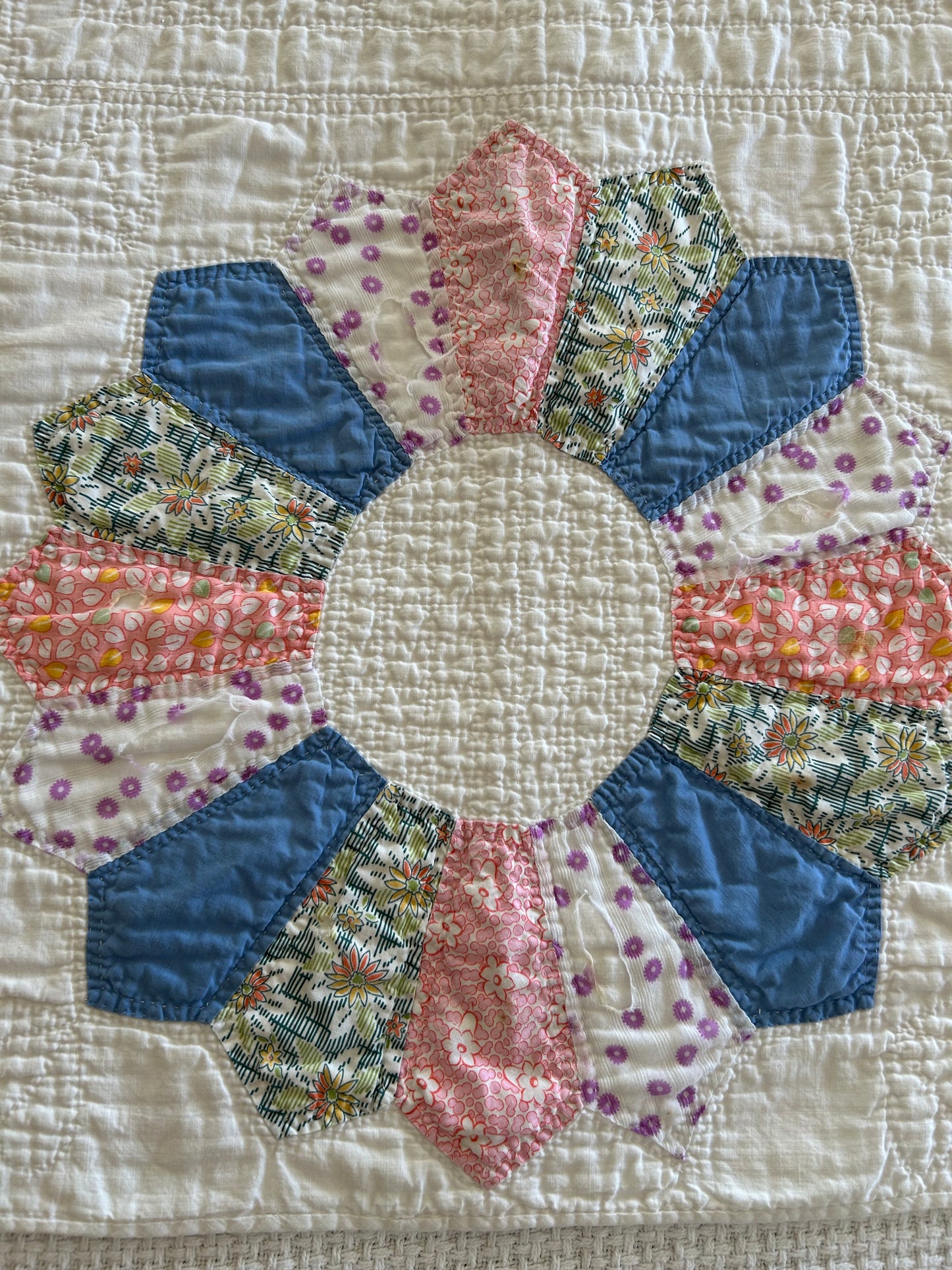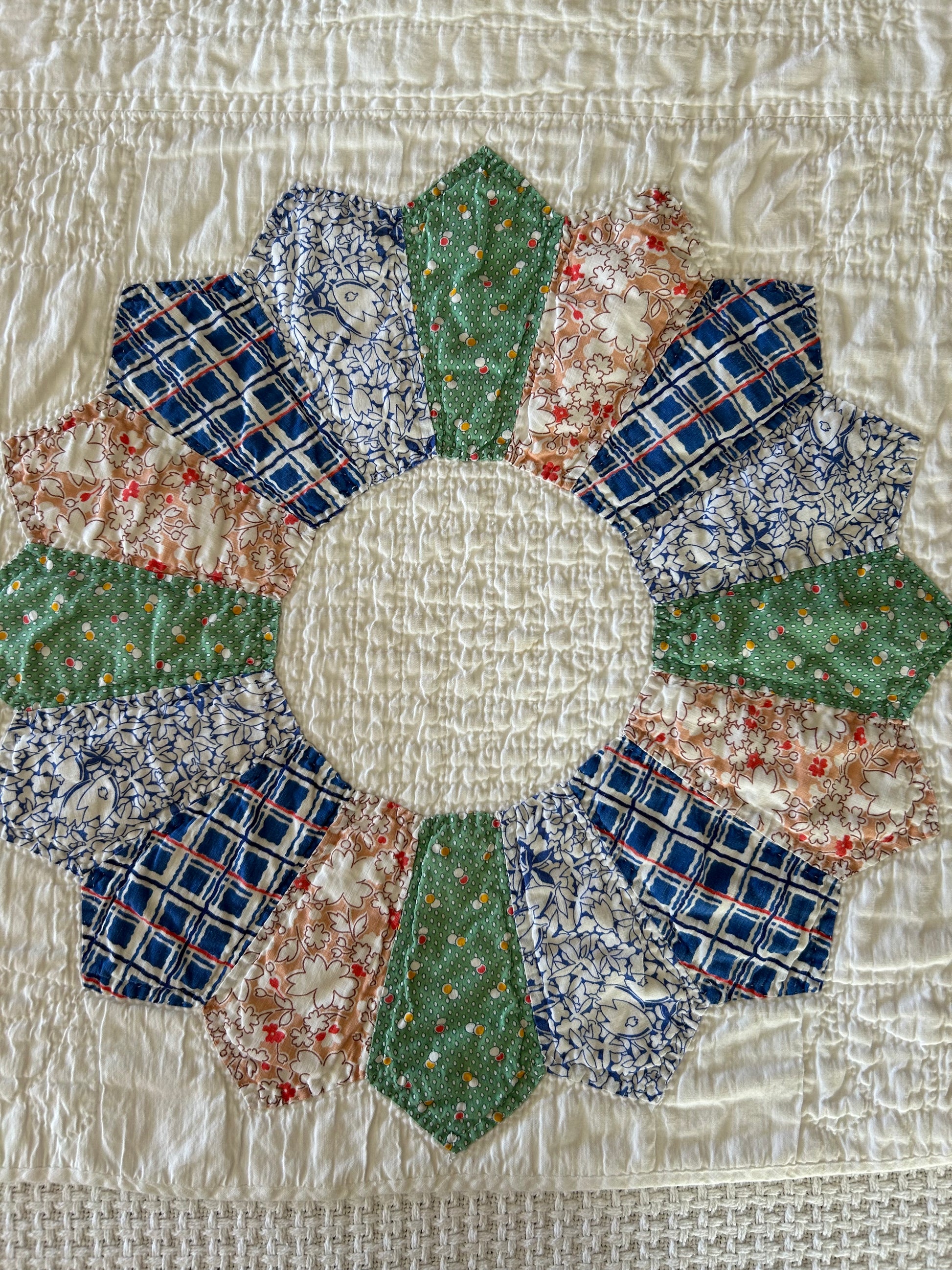 This beautiful Vintage Feedsack Dresden Plate Quilt features a classic Dresden Plate design on crisp white, made with charming vintage feedsack fabrics. Hand quilted and machine pieced, it’s light and airy—perfect for spring and summer.
