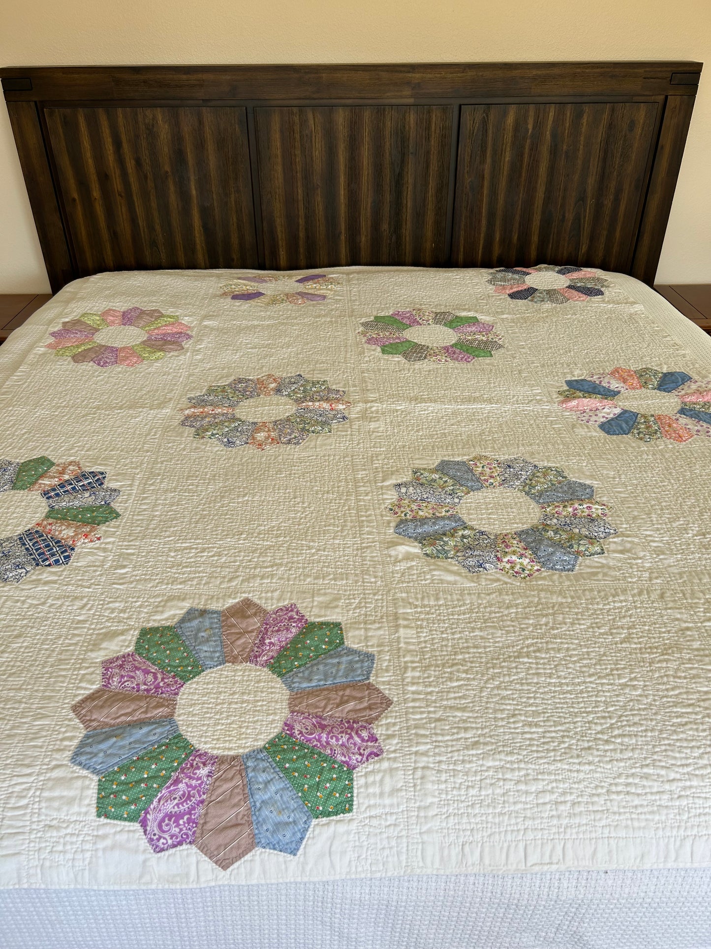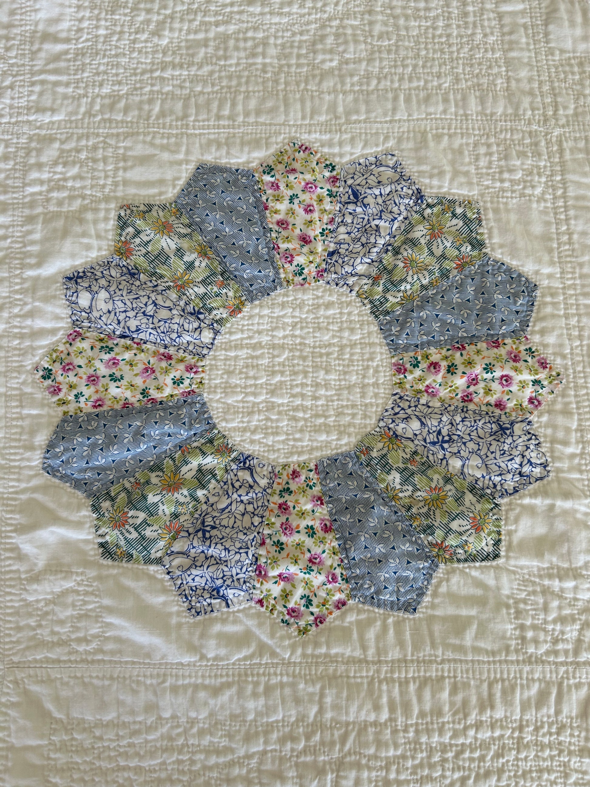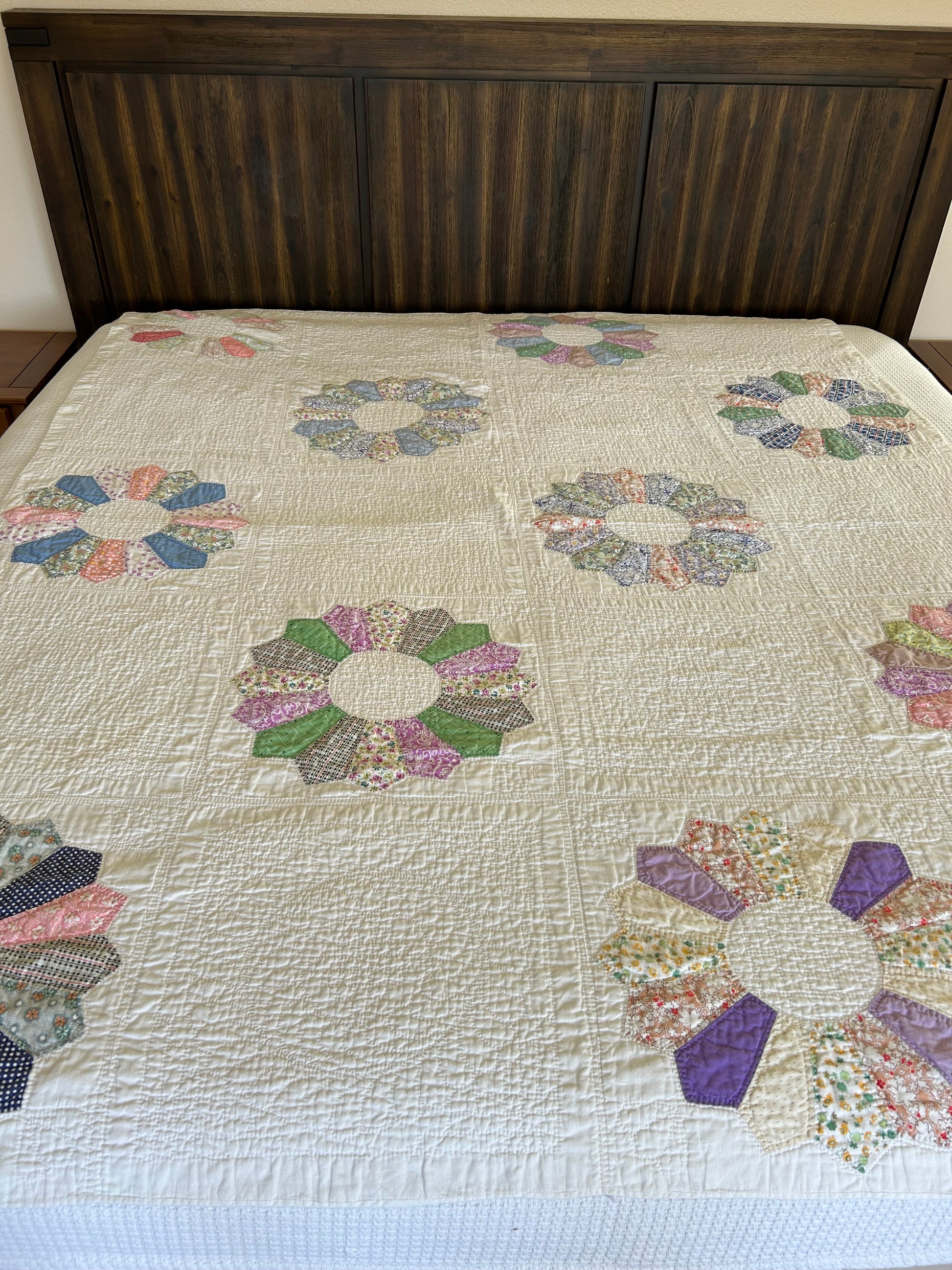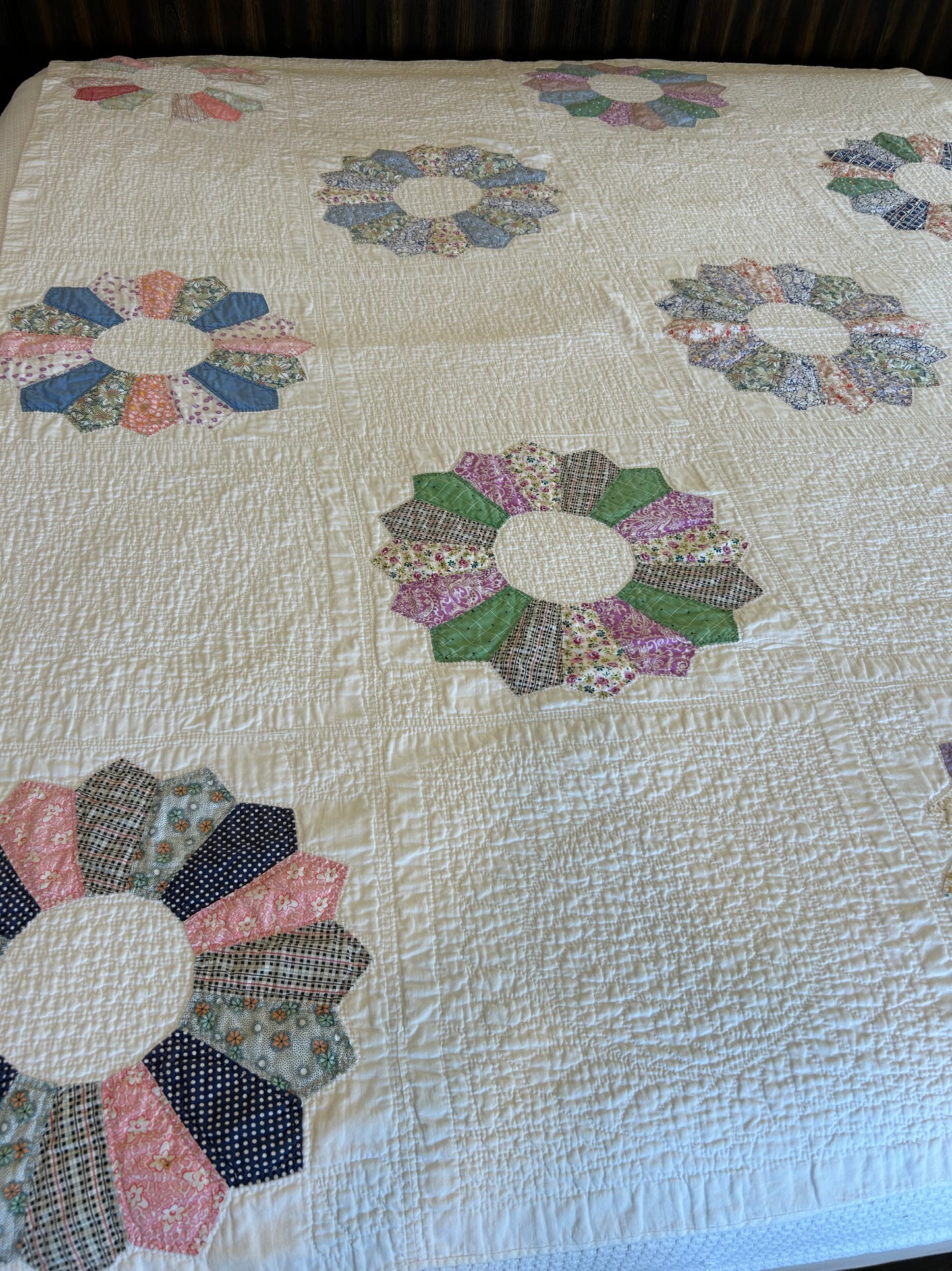 This beautiful Vintage Feedsack Dresden Plate Quilt features a classic Dresden Plate design on crisp white, made with charming vintage feedsack fabrics. Hand quilted and machine pieced, it’s light and airy—perfect for spring and summer.