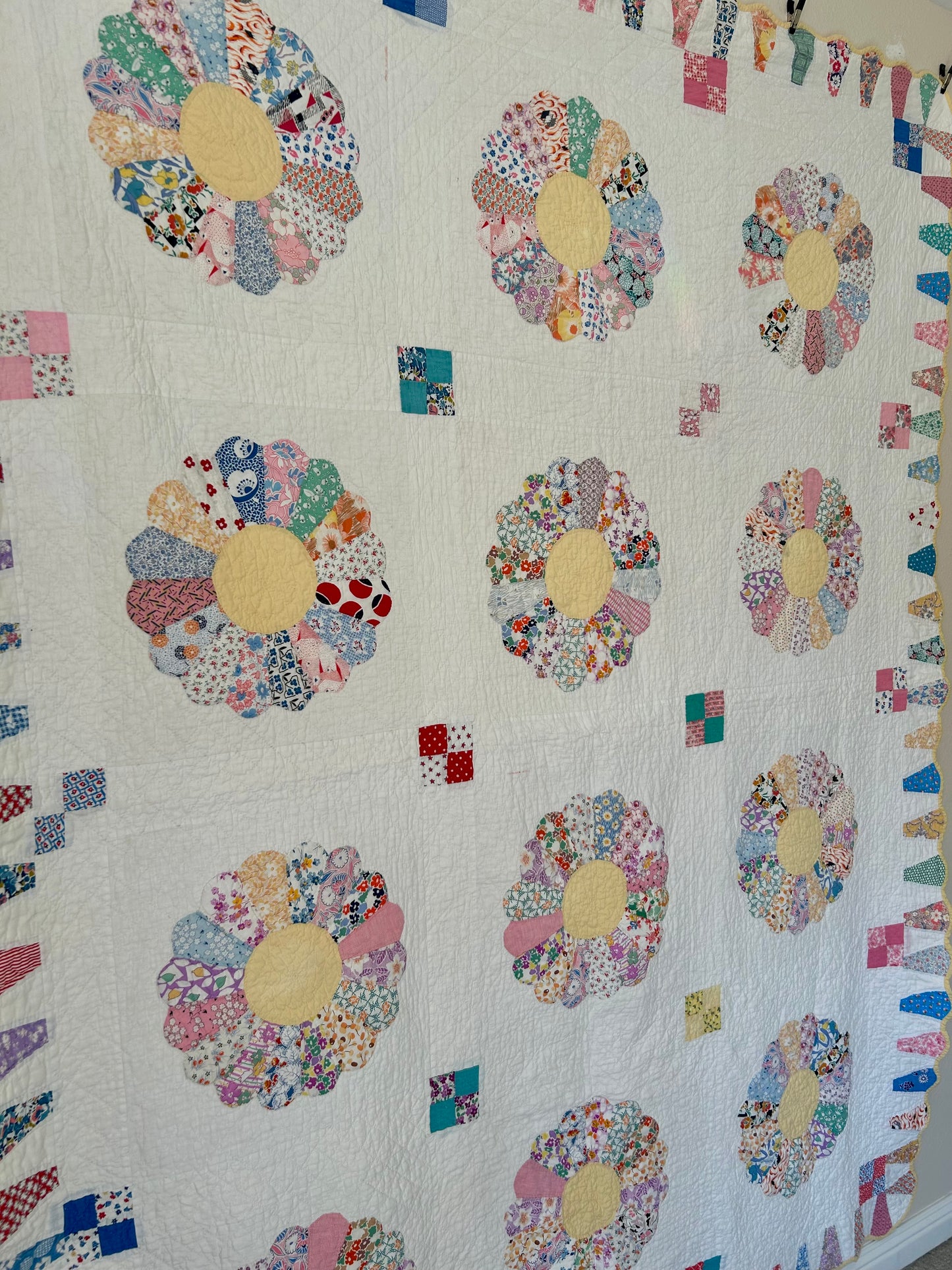 This 1940s Feedsack Dresden Plate Quilt features hand-pieced, appliquéd, and hand-quilted details at 8 stitches per inch. The quilt has a charming ice cream cone border, scalloped edges, and cute 4-patch accents throughout. Yellow backing completes the piece. There are some faint spots, but it remains a delightful vintage quilt, perfect for gentle use or display.