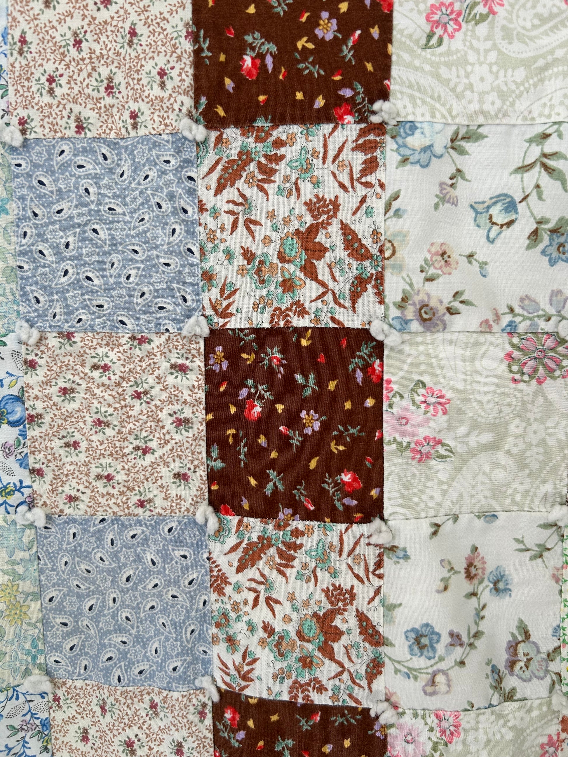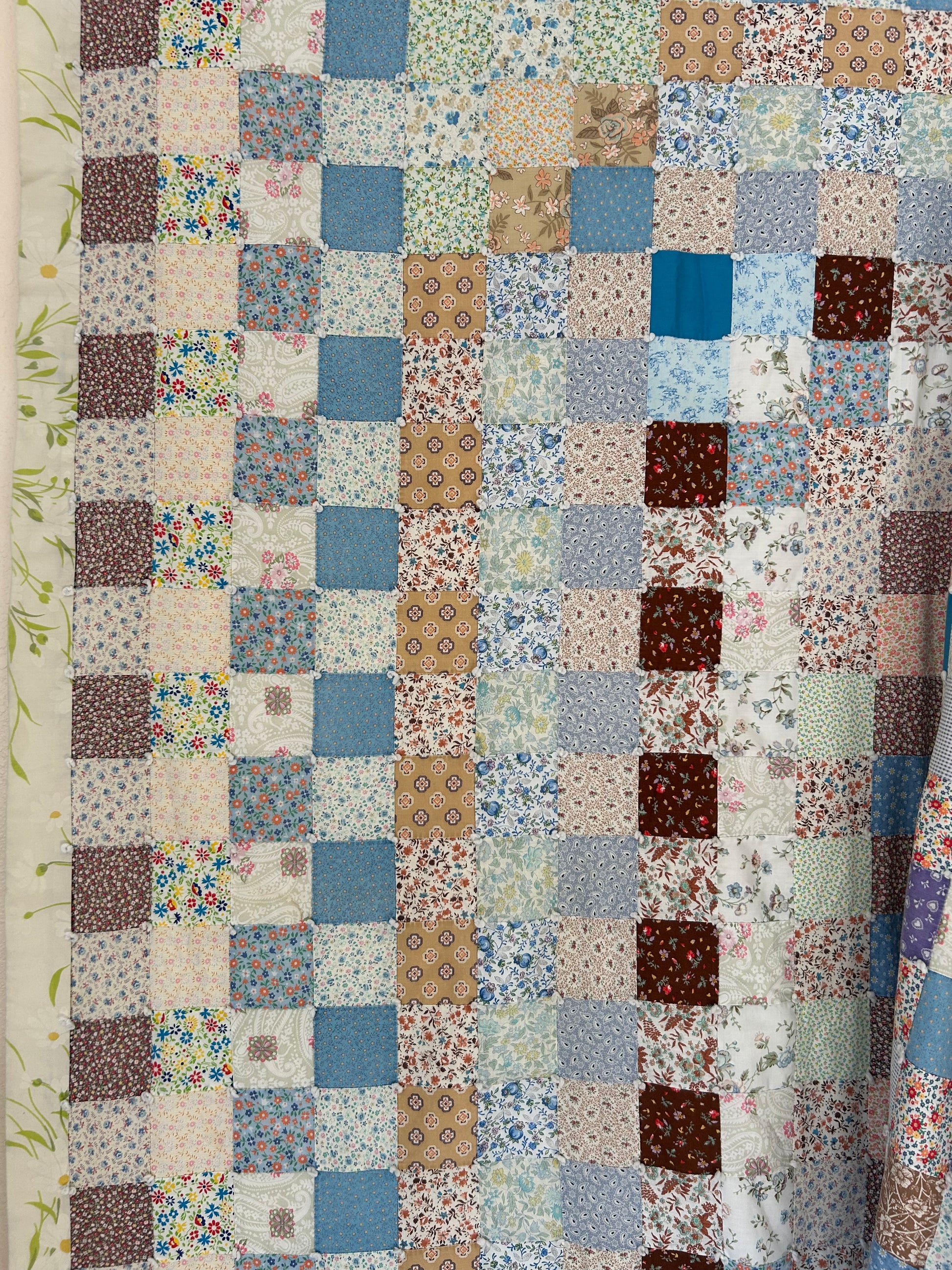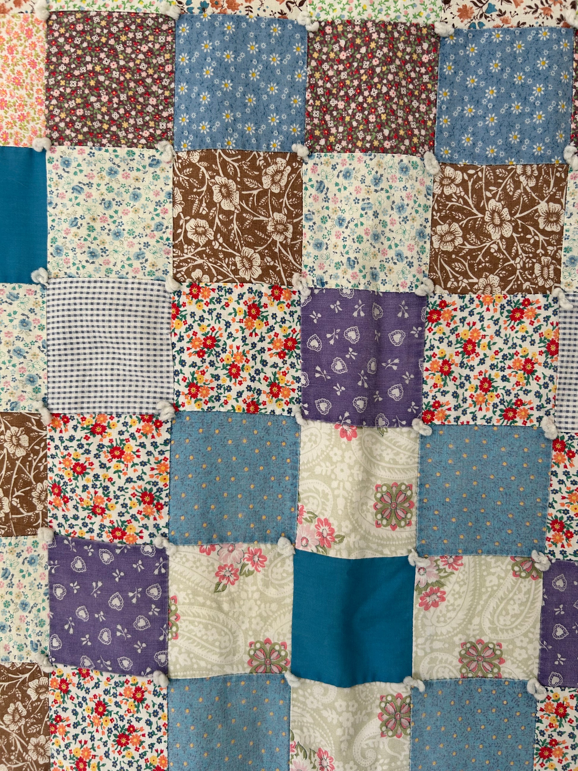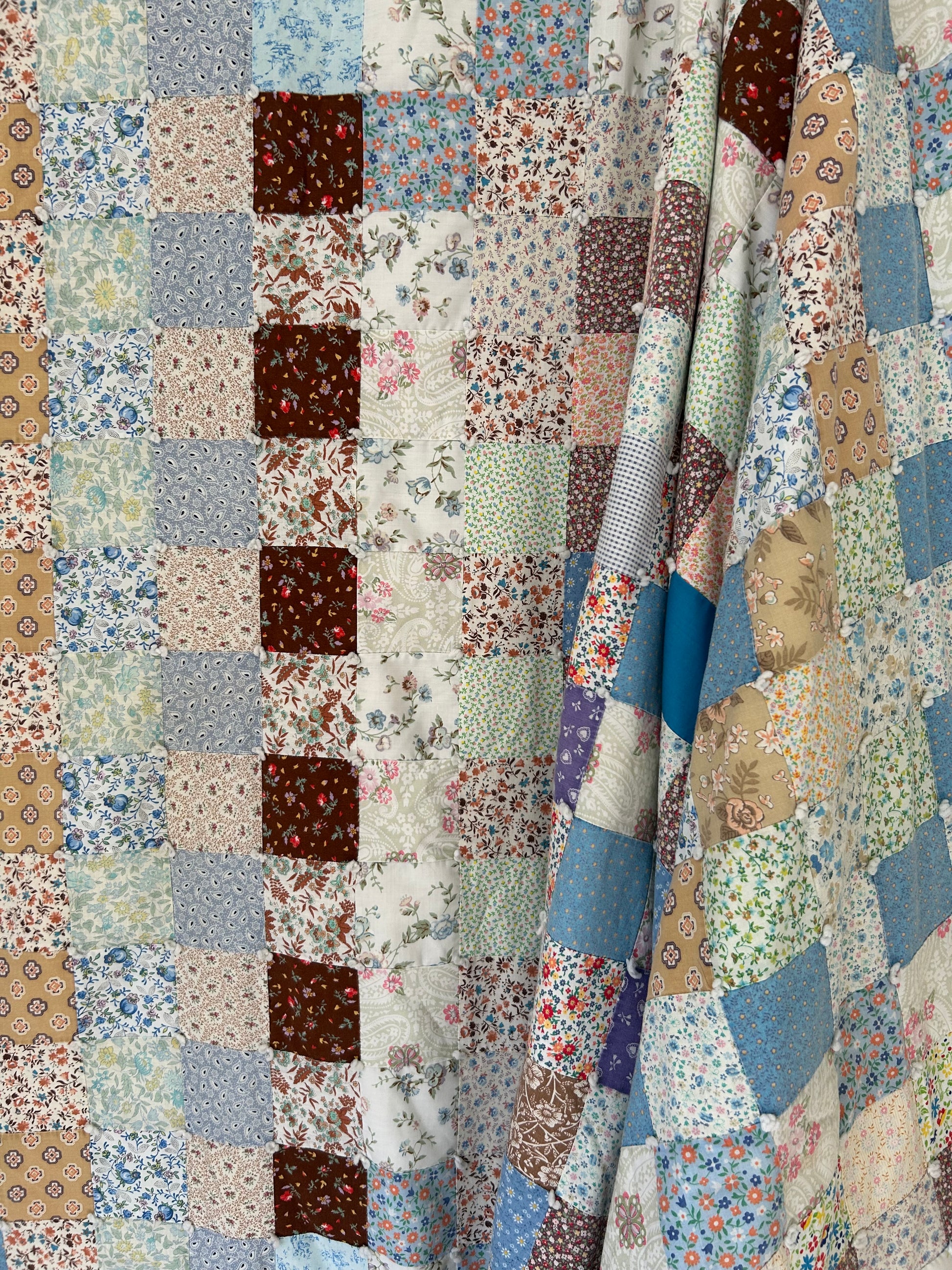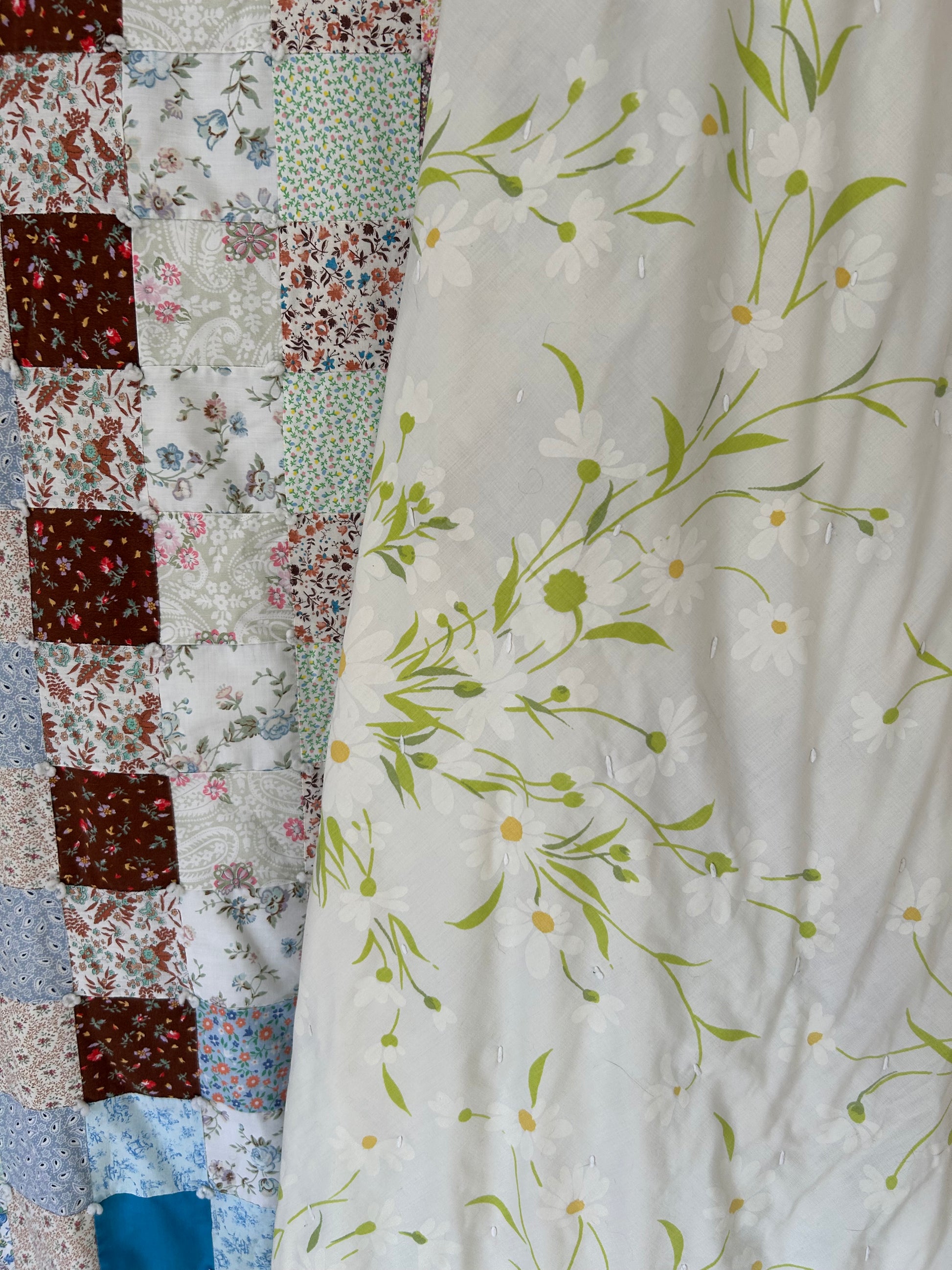 This vintage 1970s Patchwork Quilt features beautiful blue multi fabrics with sweet floral prints throughout. The backing and binding are made from a bedsheet, making it especially smooth and soft, with a pretty floral backing. Hand tied and light to medium weight, it’s a cozy and charming quilt with a relaxed vintage feel.