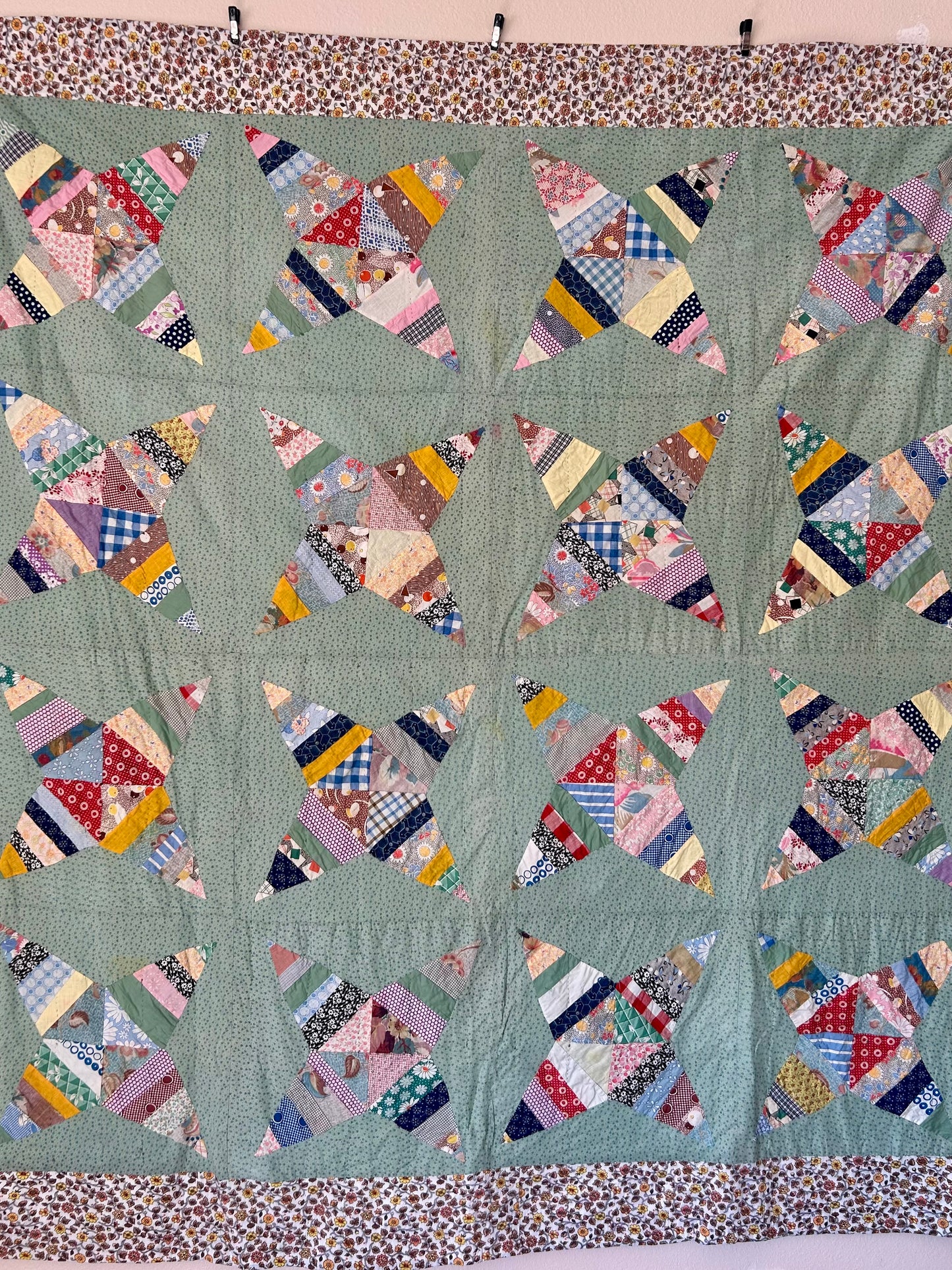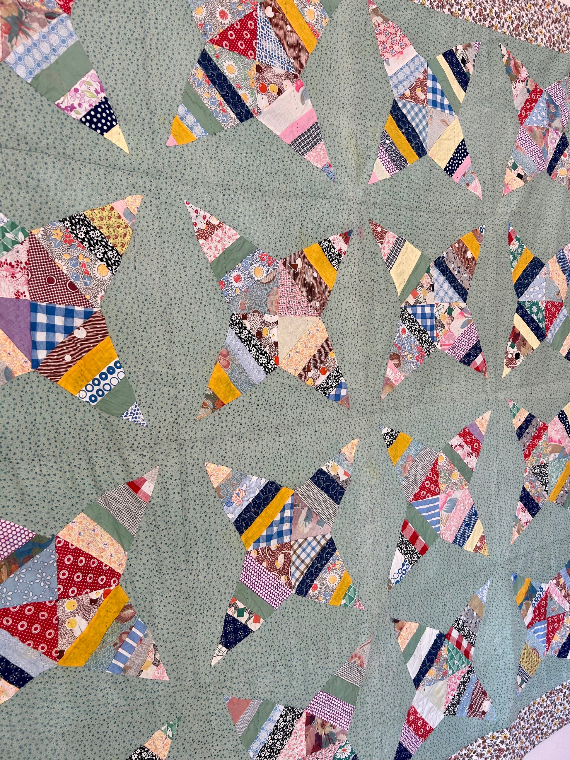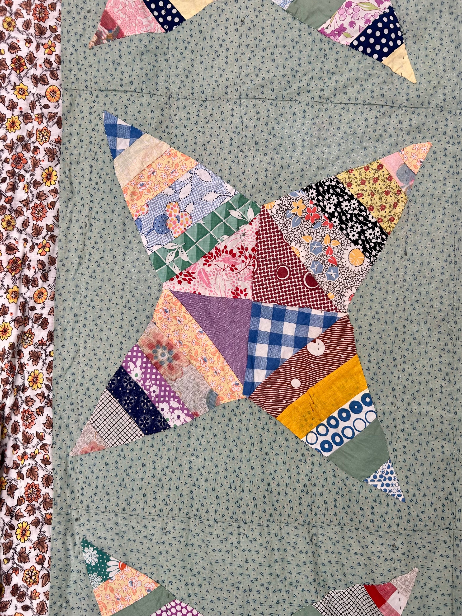 This 1970 Green Rocky Road to Kansas Quilt comes from a Virginia collector and features a classic Rocky Road to Kansas pattern. Machine pieced, hand appliquéd, and minimally hand quilted, it is lightweight and charming. Some feedsacks were used, with slight discolorations. Brown floral edges and a bright blue backing add extra charm. Fabric sleeves on the back allow for wall hanging.