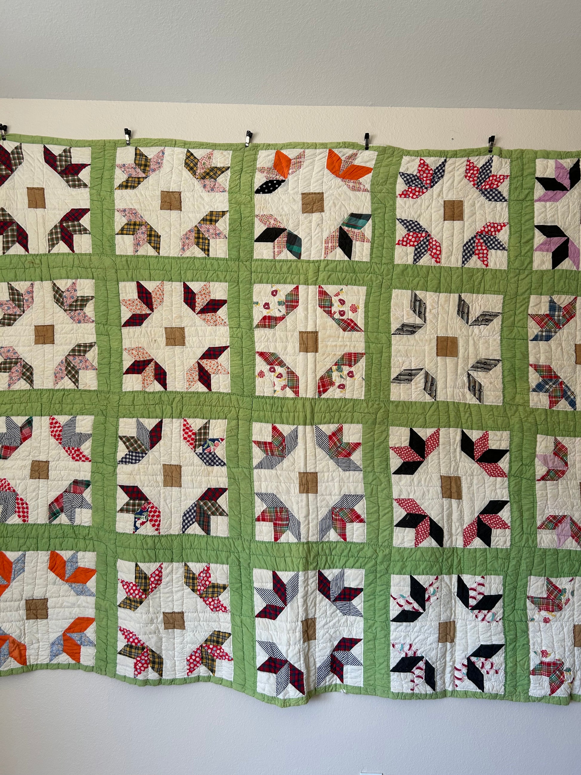 Pattern: Bear Paw with green sashing and plaid, floral, and gingham fabrics