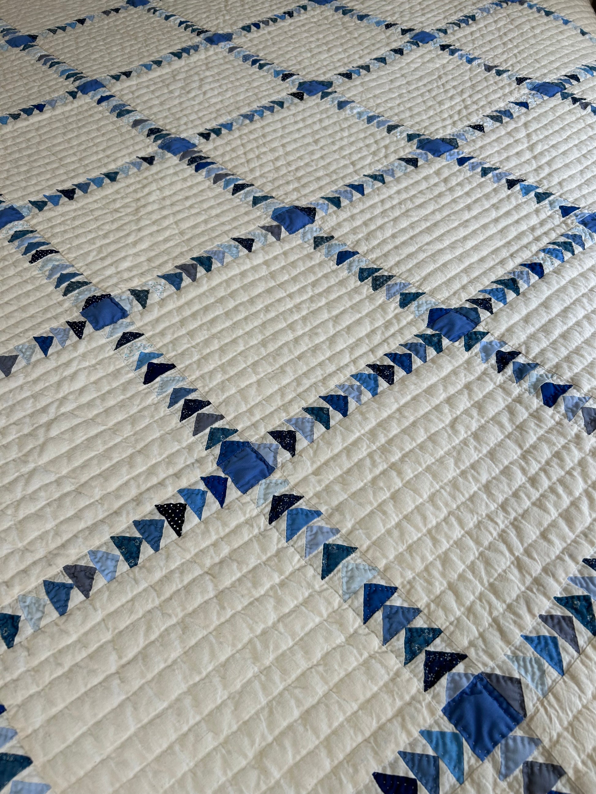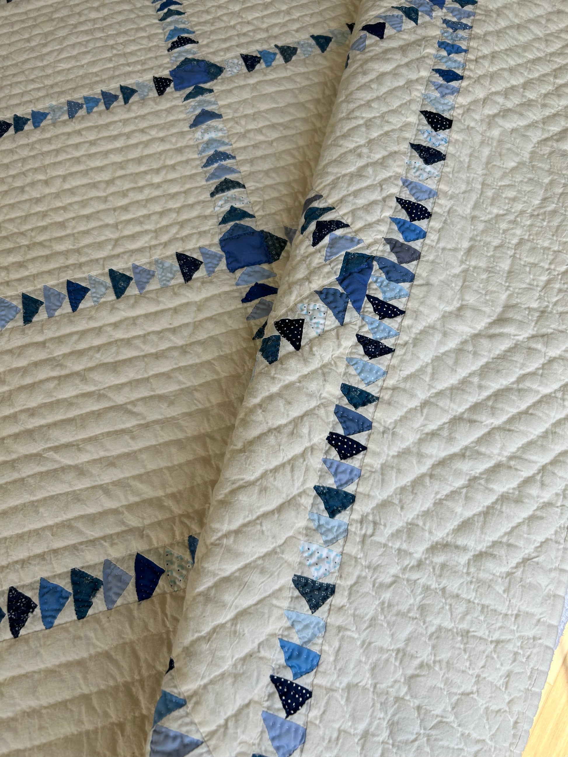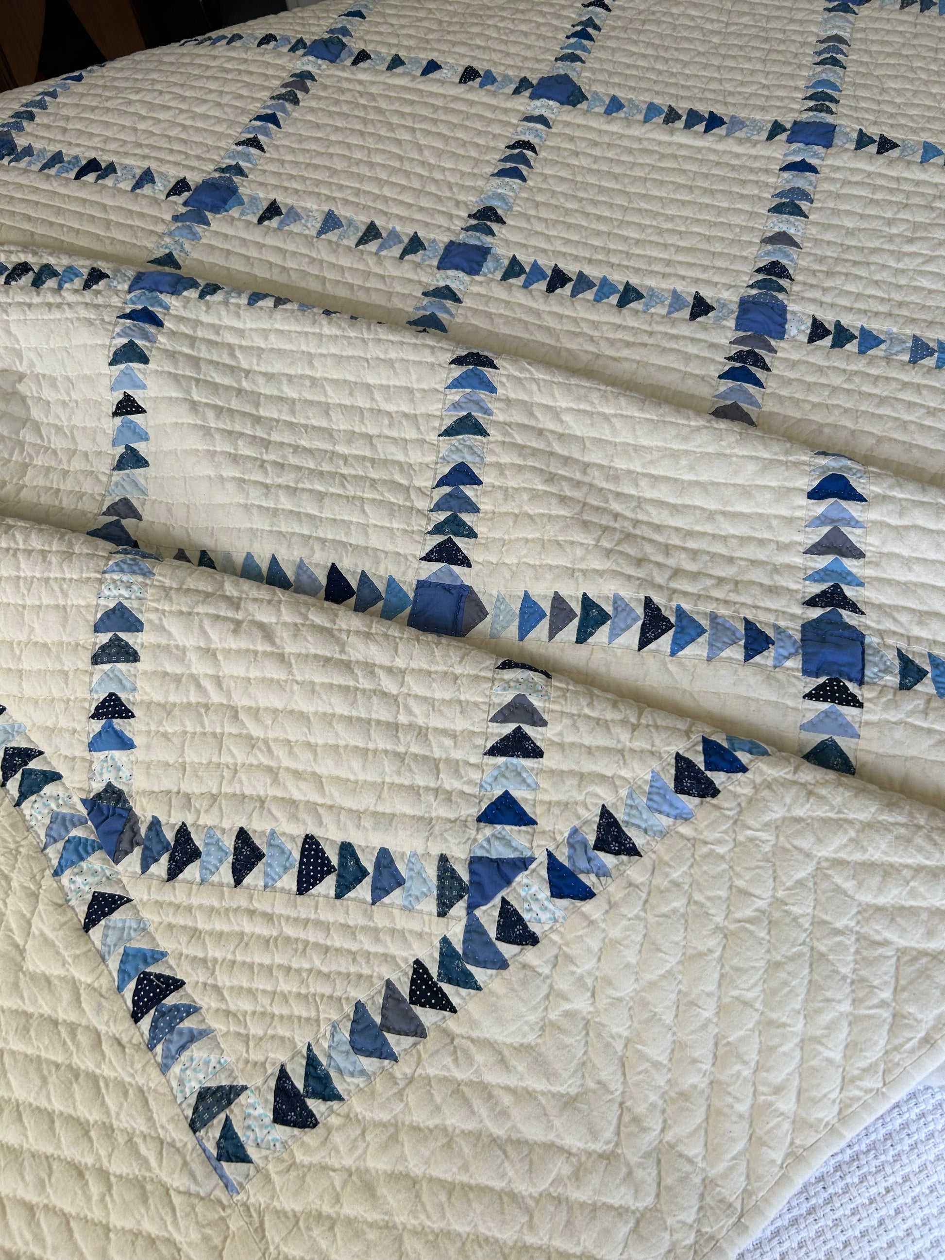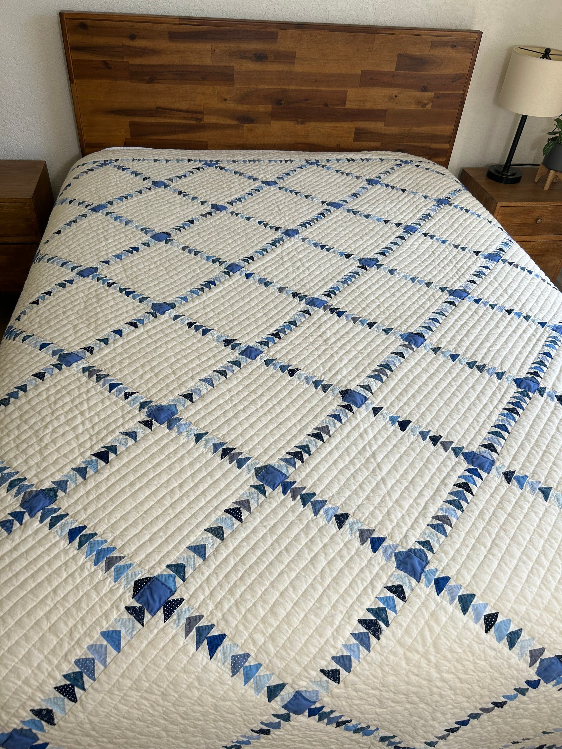 This striking Wild Goose Chase quilt features a crisp blue and white color palette with bold piecing throughout. It’s medium weight—cozy, substantial, and ready to be loved.