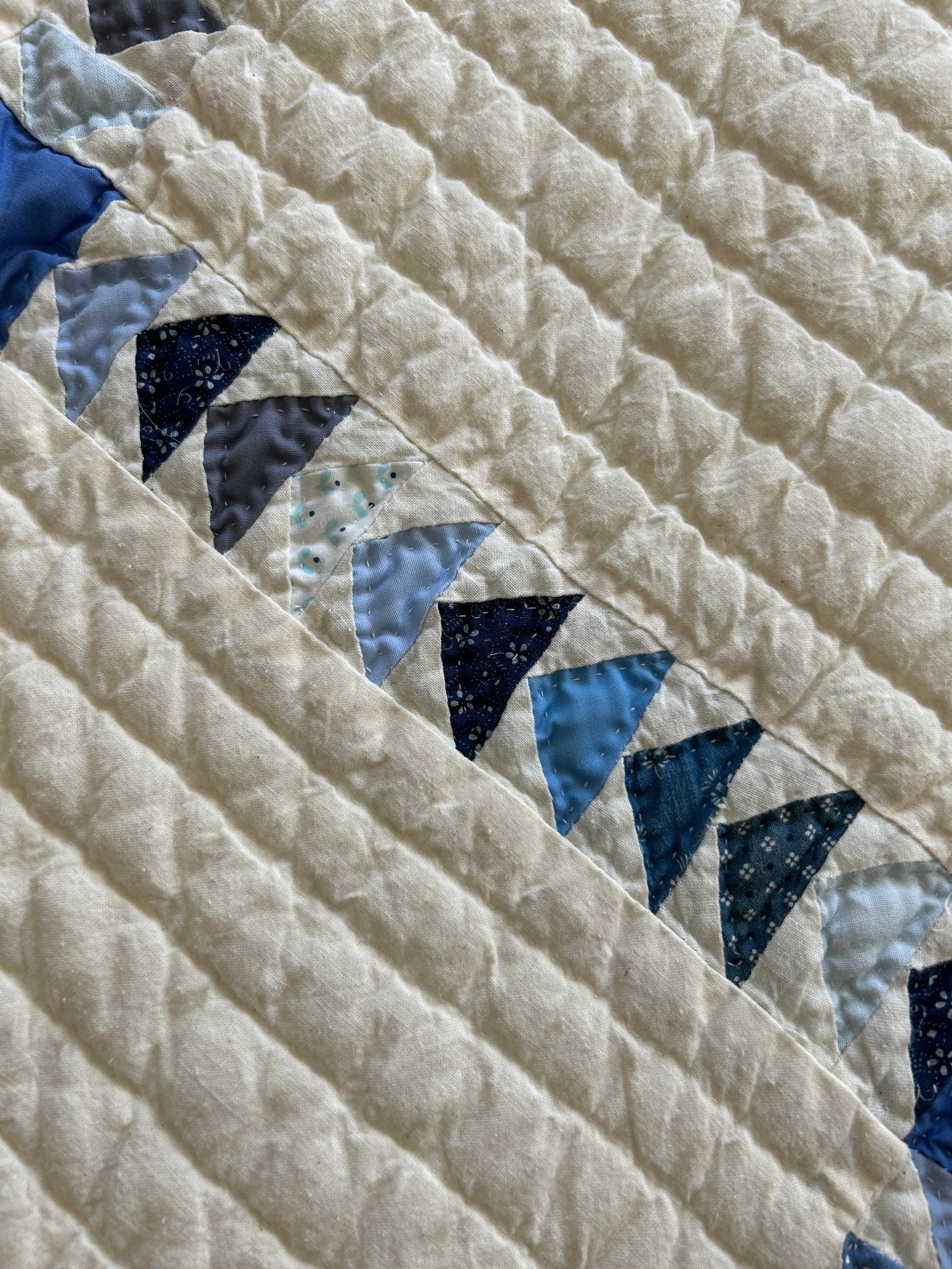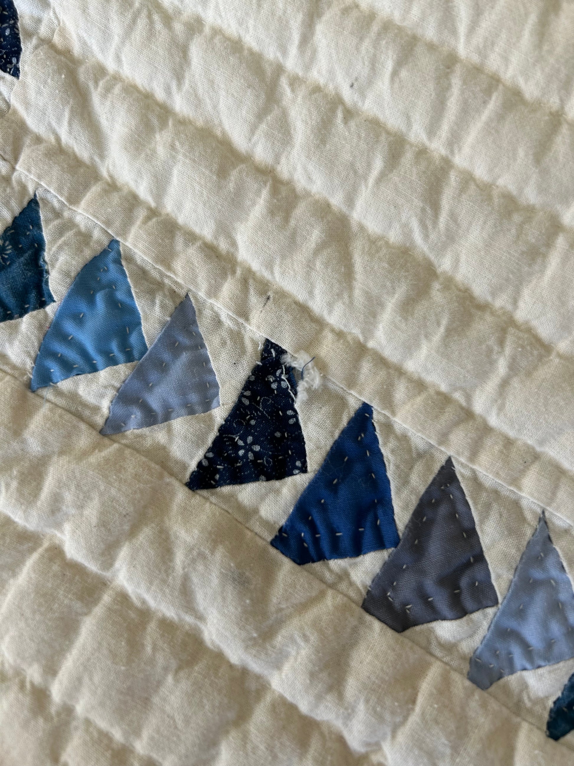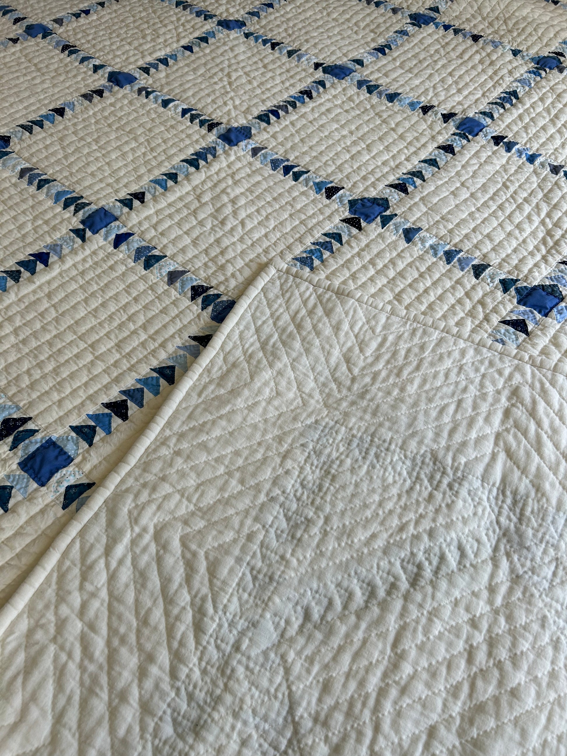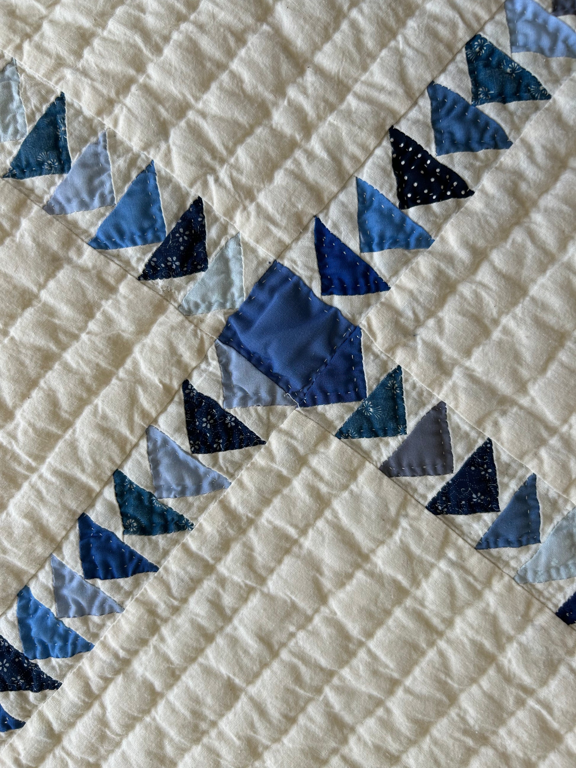 This striking Wild Goose Chase quilt features a crisp blue and white color palette with bold piecing throughout. It’s medium weight—cozy, substantial, and ready to be loved.