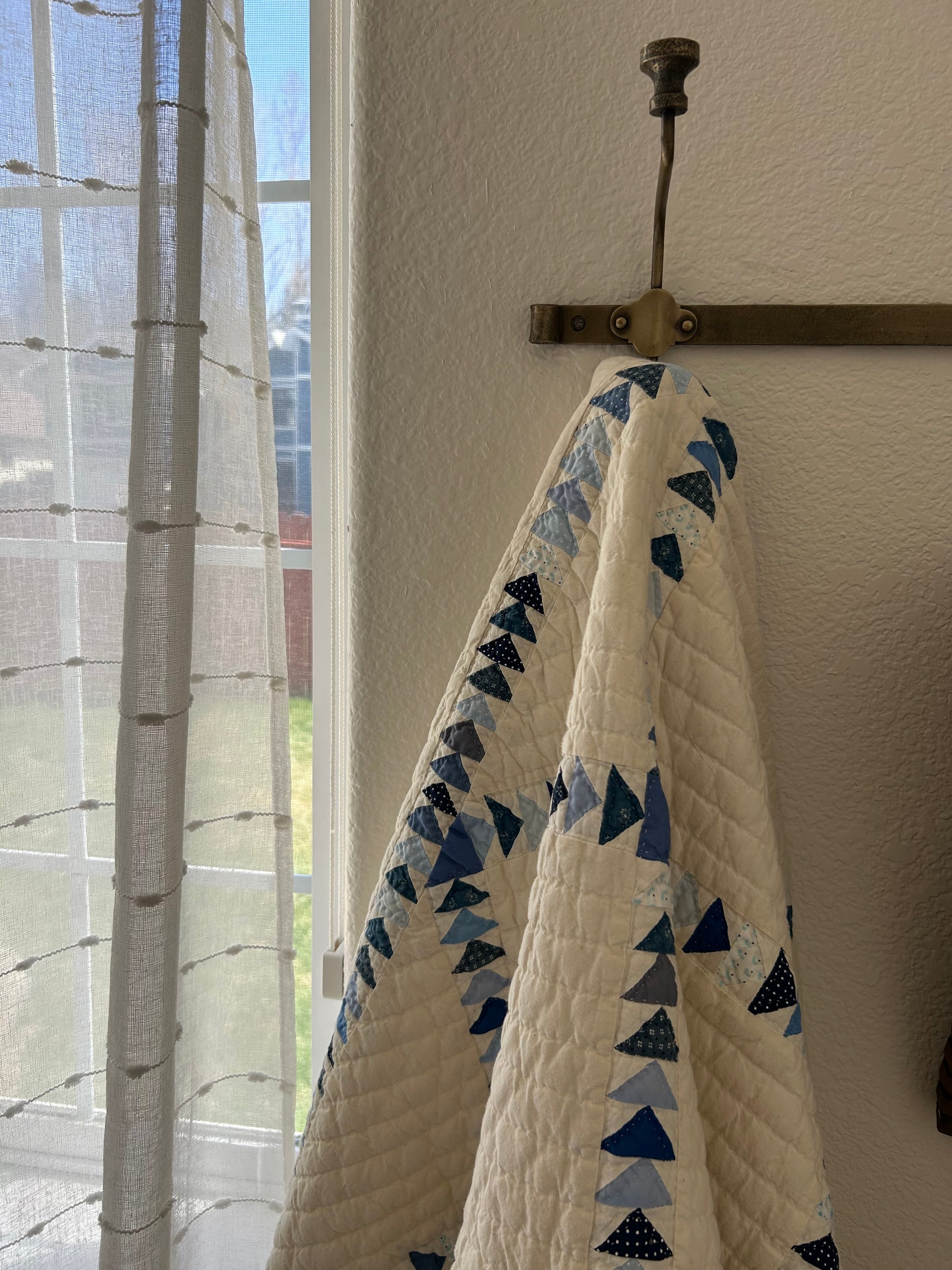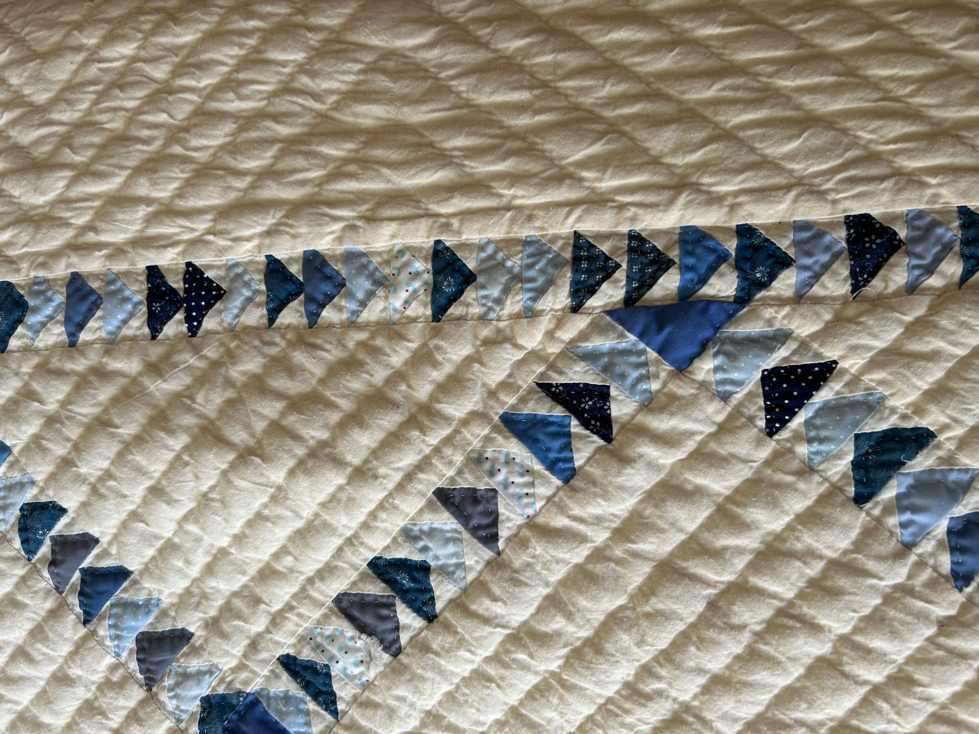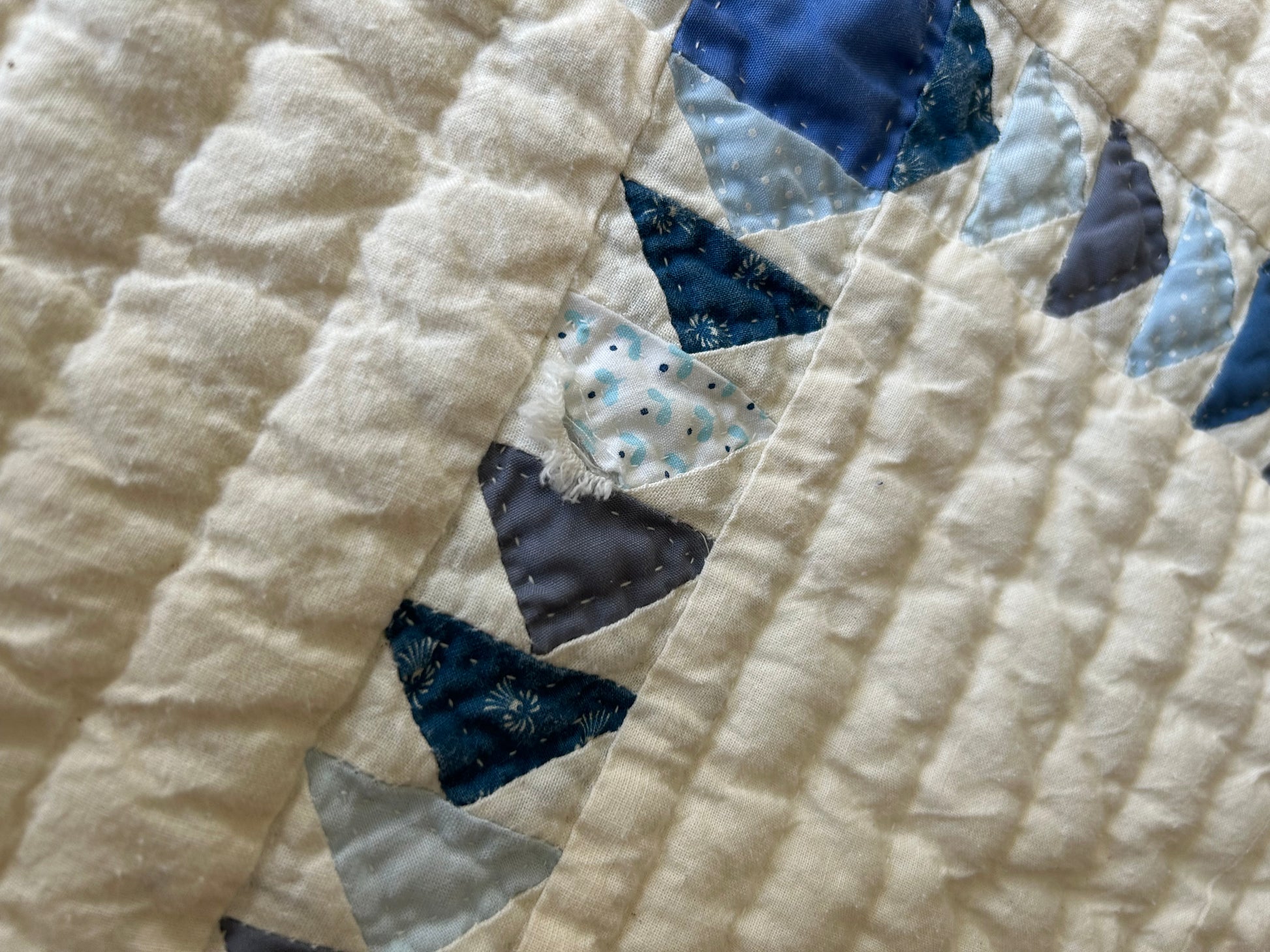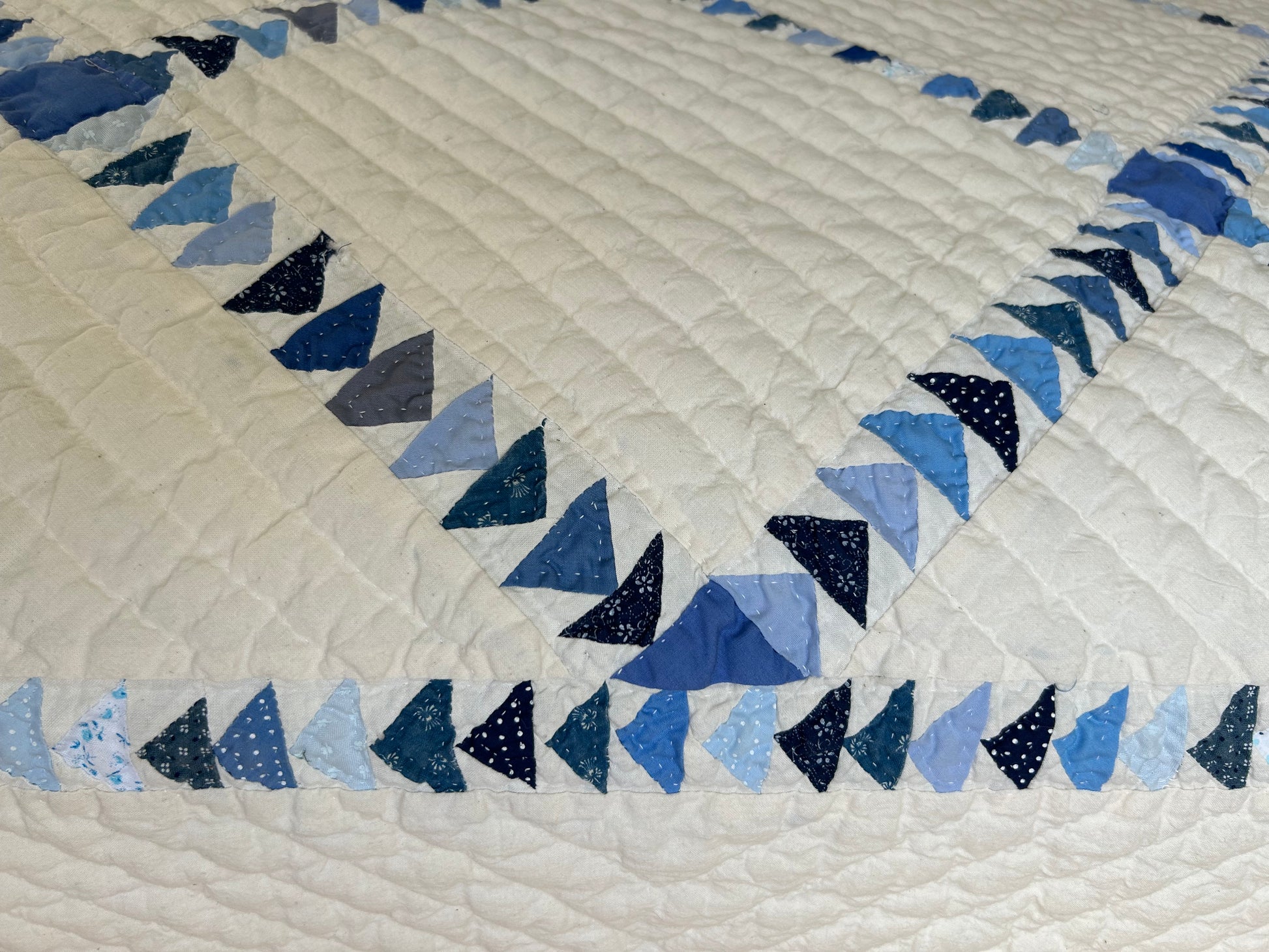 This striking Wild Goose Chase quilt features a crisp blue and white color palette with bold piecing throughout. It’s medium weight—cozy, substantial, and ready to be loved.