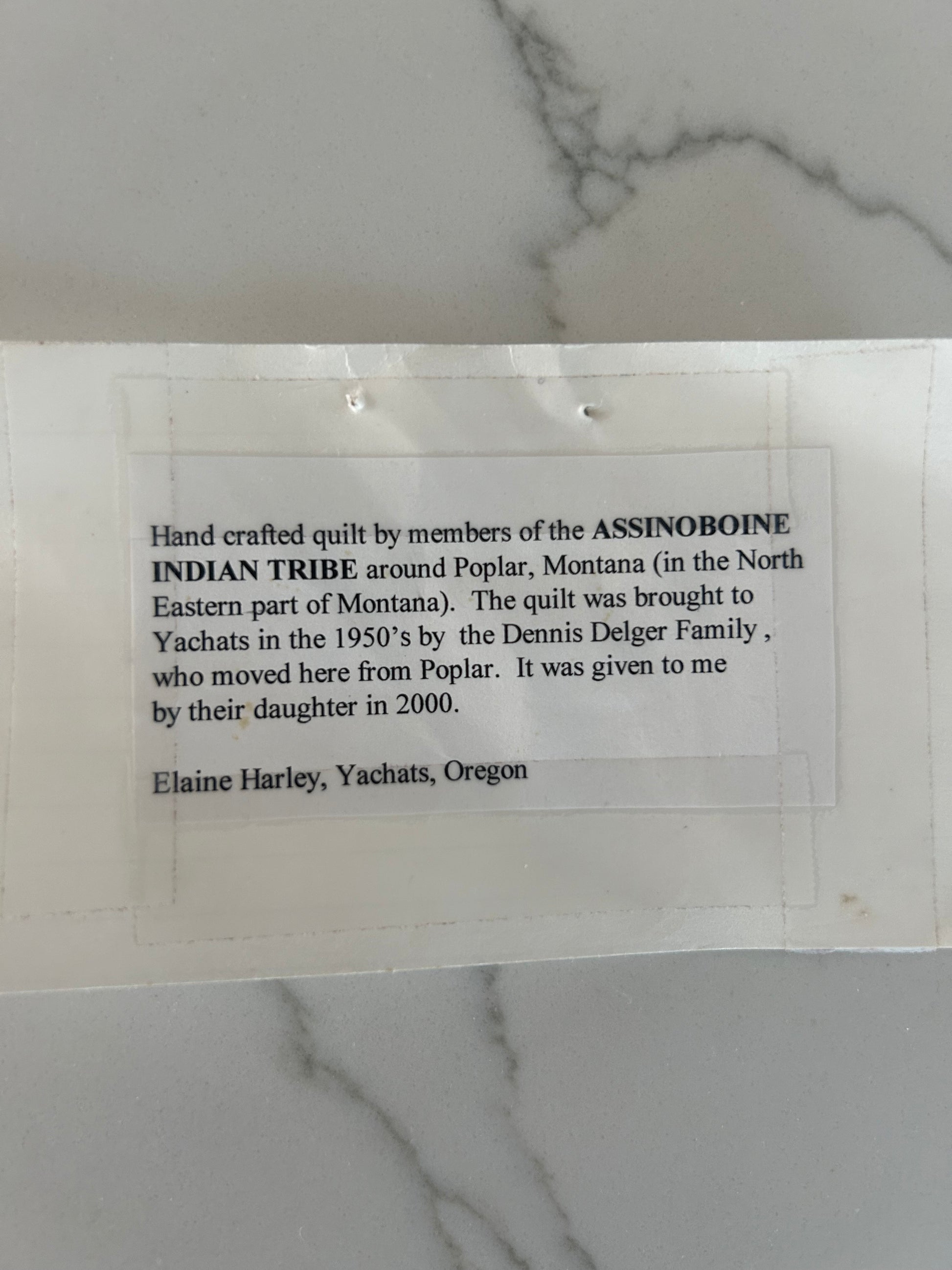 This bold and historically significant Vintage Broken Star Quilt was made by a member of the Assiniboine Indian Tribe from Poplar, Montana, in the 1950s. Featuring a powerful Broken Star pattern and classic Baptist fan quilting on the back, it’s a striking blend of cultural significance and vintage artistry.