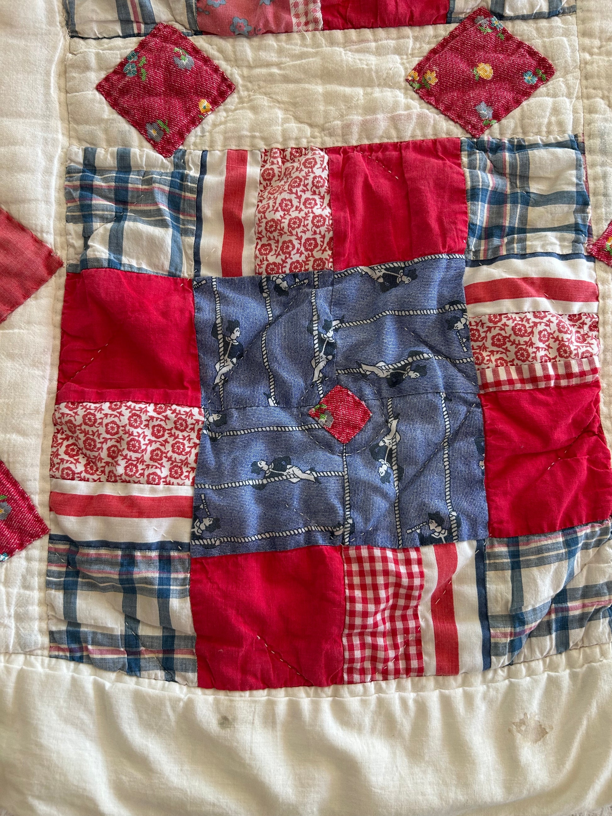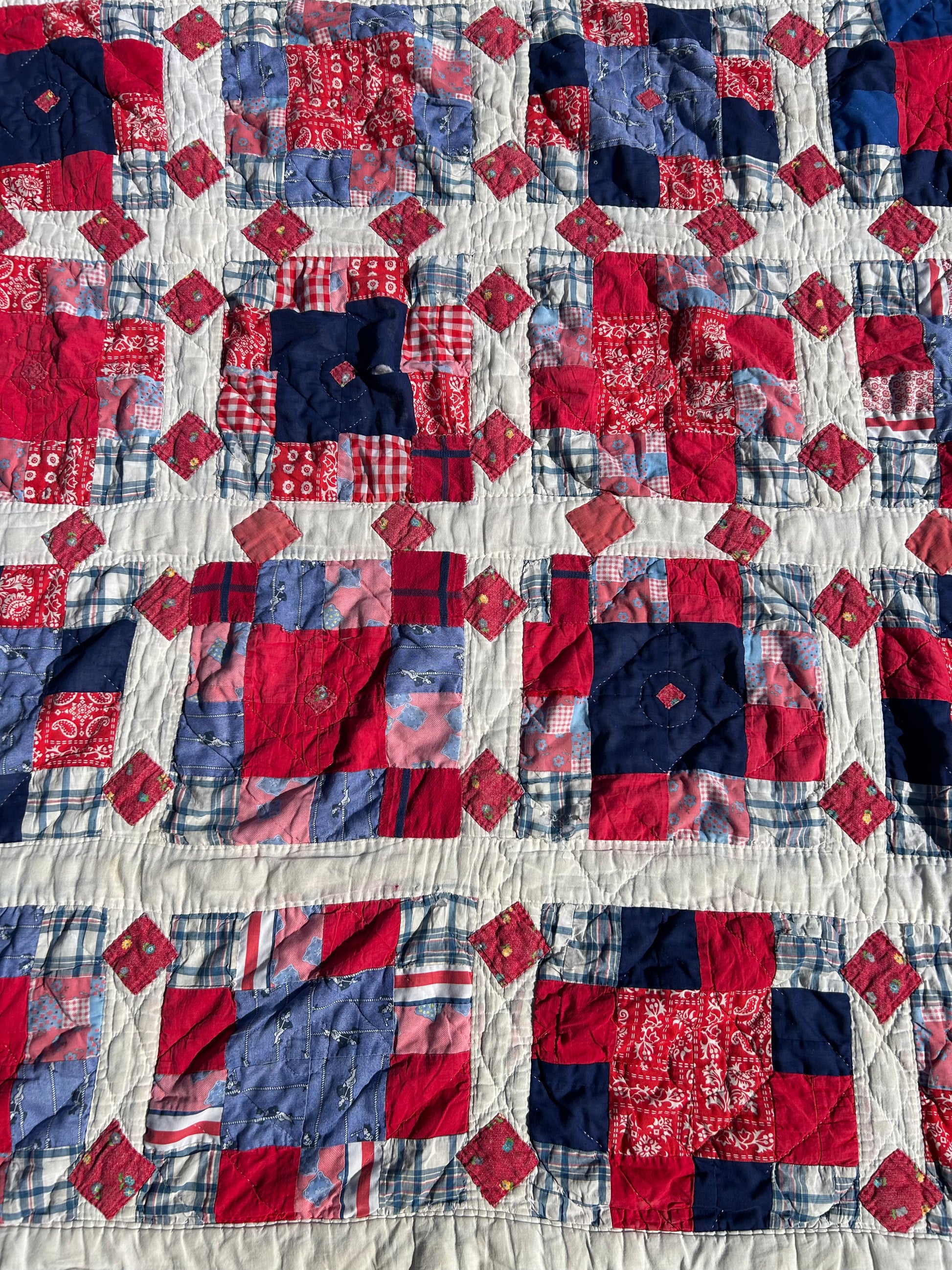 This Patriotic Picnic Patchwork Quilt in red, white, and blue is perfect for outdoor picnics or as a cozy throw. It’s super soft and well-loved, with some minor tears and a couple of spots, adding to its charming character. The quilt features cute patterns, including gingham and plaid, making it both functional and stylish.