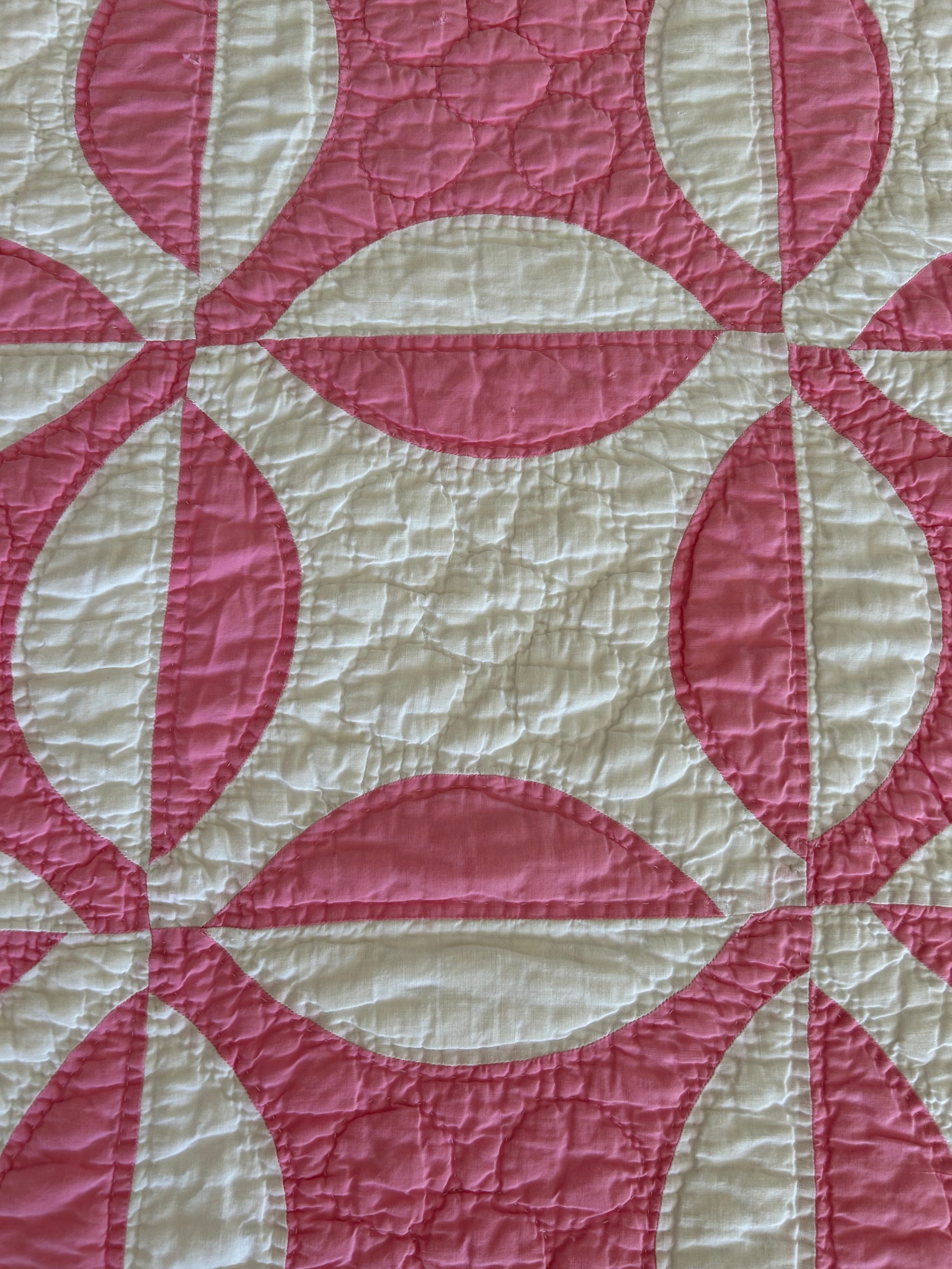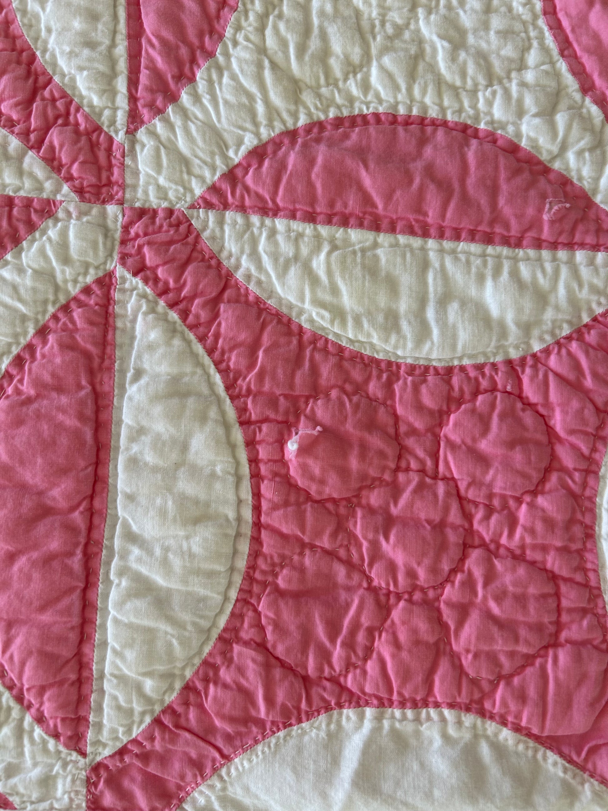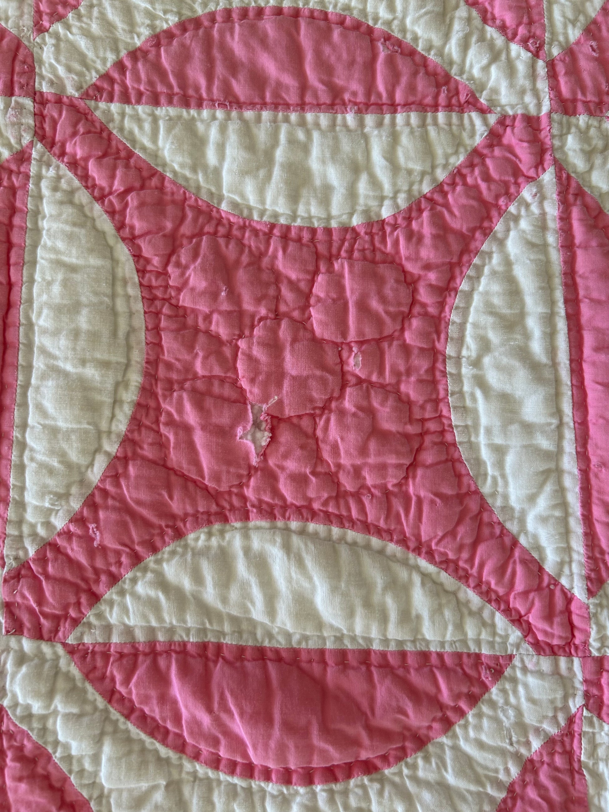 This vibrant Barbie Pink and White Quilt features the Robbing Peter to Pay Paul pattern in pink and white. It’s super soft, with hand quilting and machine pieced for a charming, vintage look. Despite some fraying, a couple of holes, and a yellow spot, this quilt remains bright, cheerful, and full of personality.