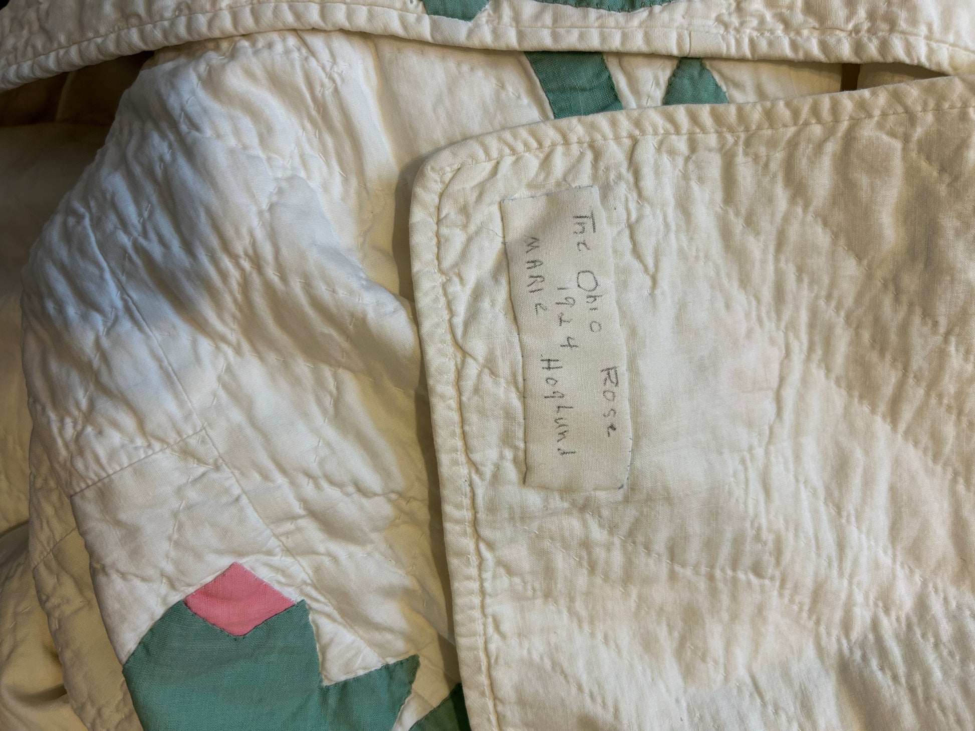 This 1924 Pink Rose of Sharon Quilt features a delicate pink and white design, hand and machine stitched, with a light and drapey feel. A fabric sleeve on the back allows for wall hanging. There are a couple of yellow spots, and the quilt is signed 1924 by Marie Hoglund, making it a charming collectible piece.