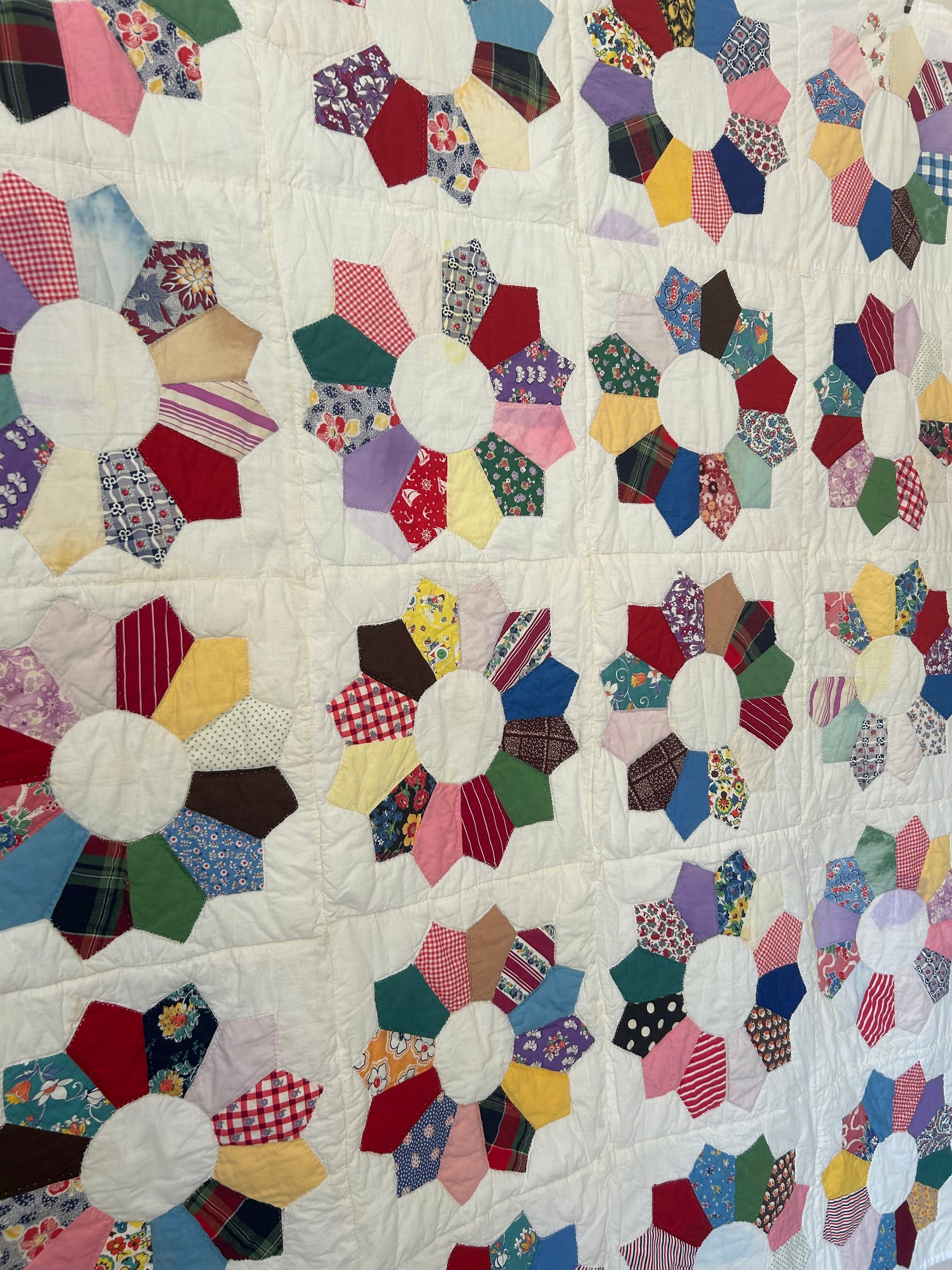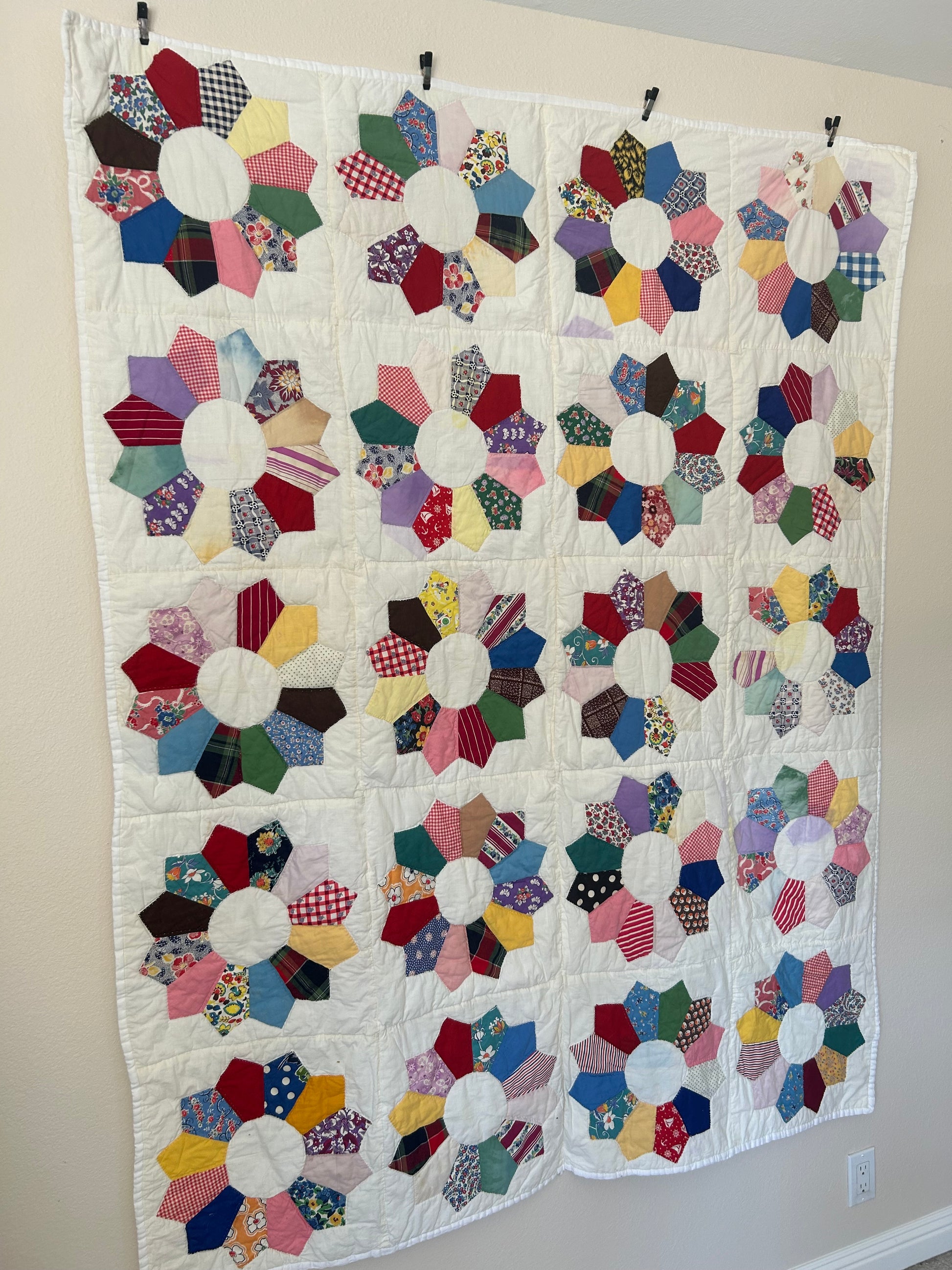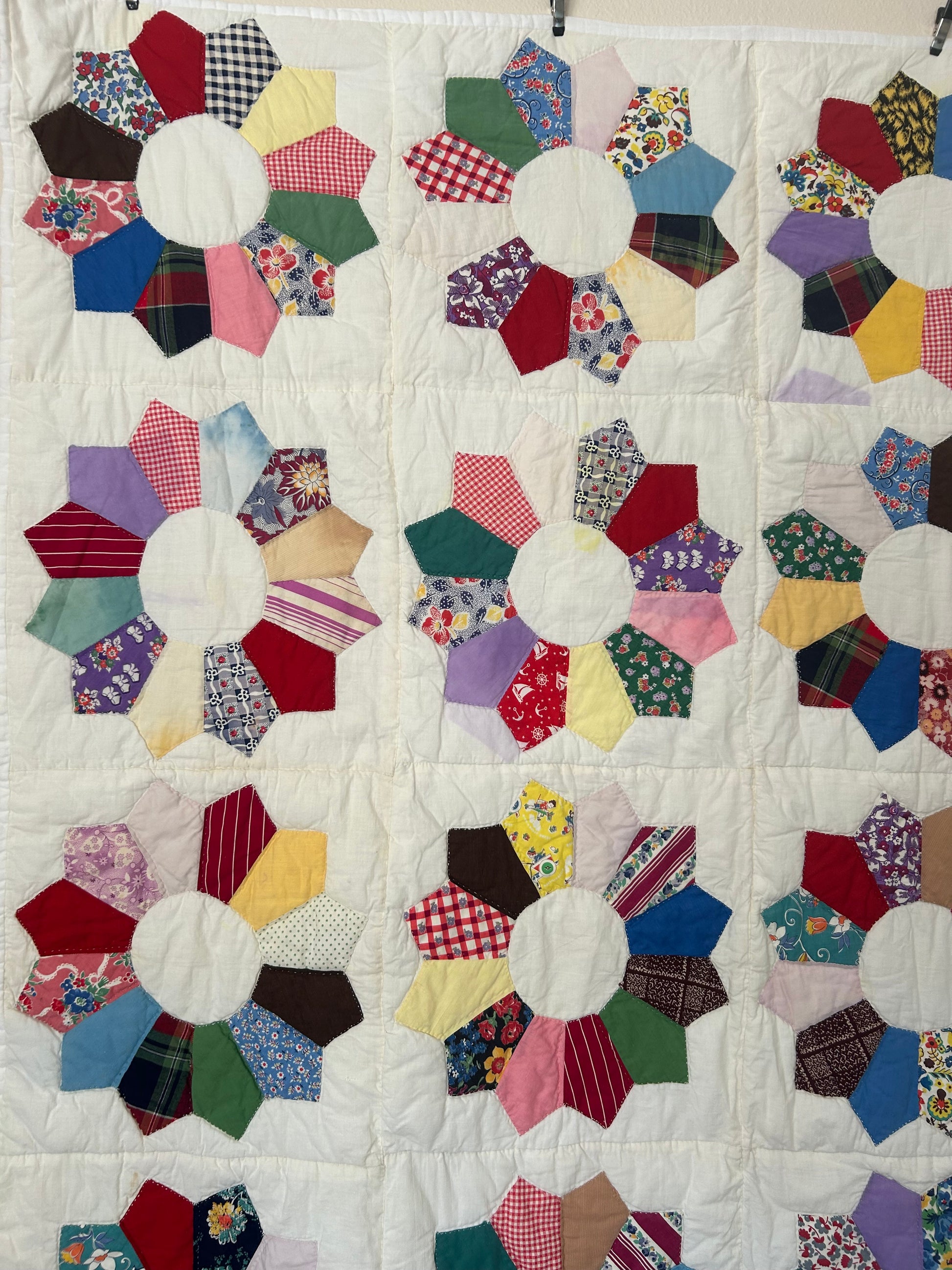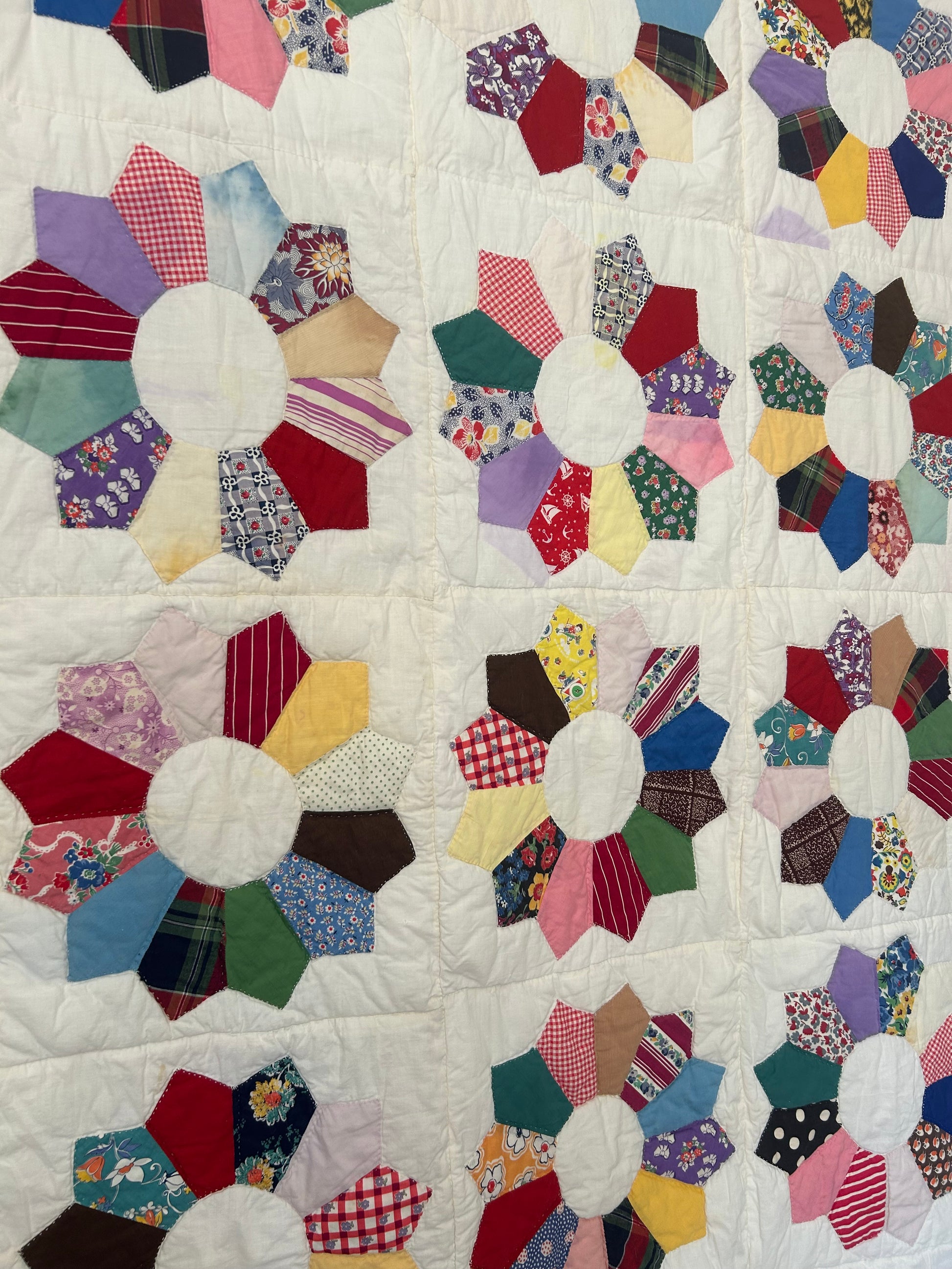 This colorful Playful Dresden Quilt features vibrant Dresden Plate patterns with floral and gingham prints. Hand-stitched and machine pieced, it’s soft and fluffy, making it perfect for cozying up. It does have some color transfer and stains, but it remains a charming, playful quilt.
