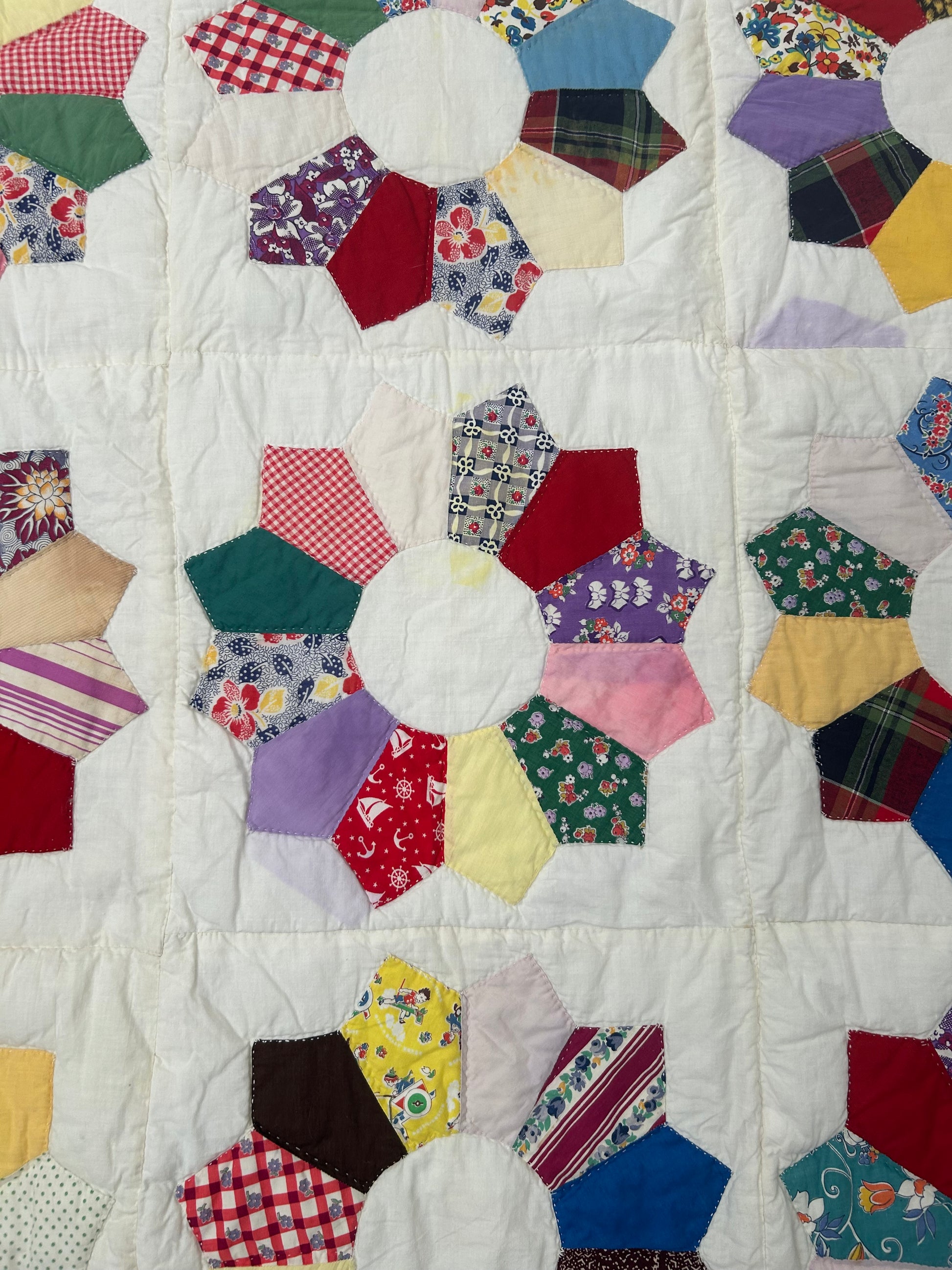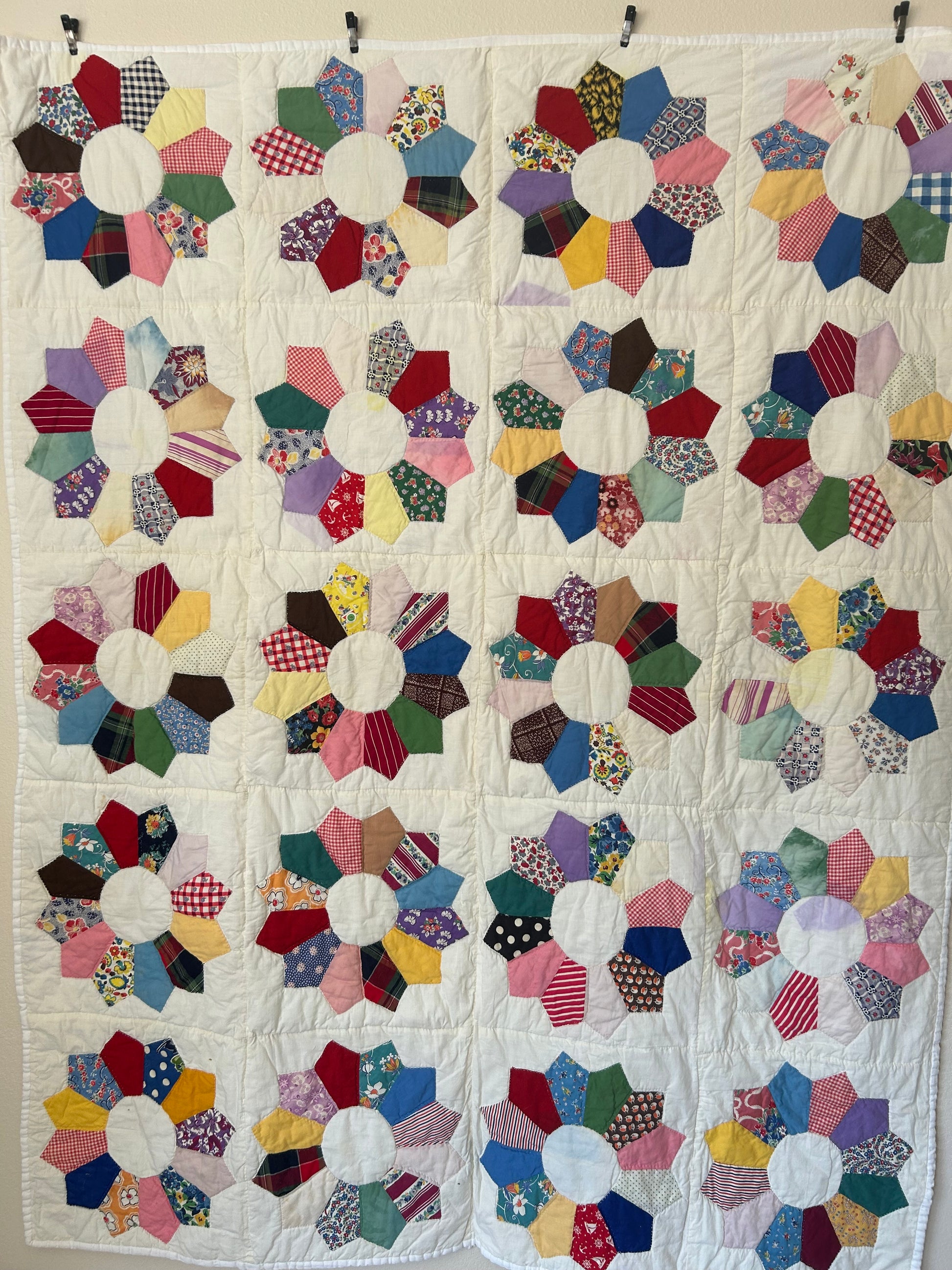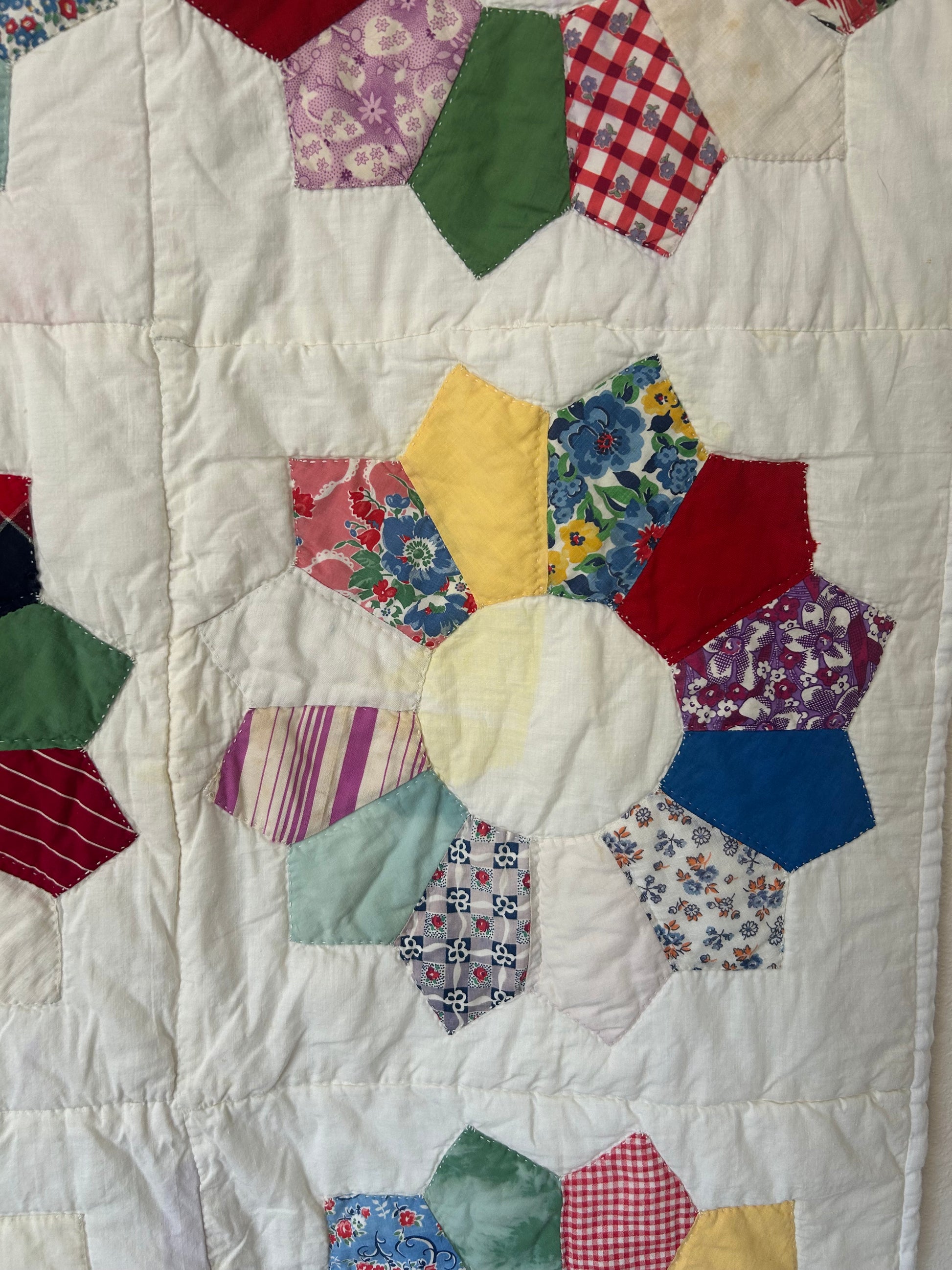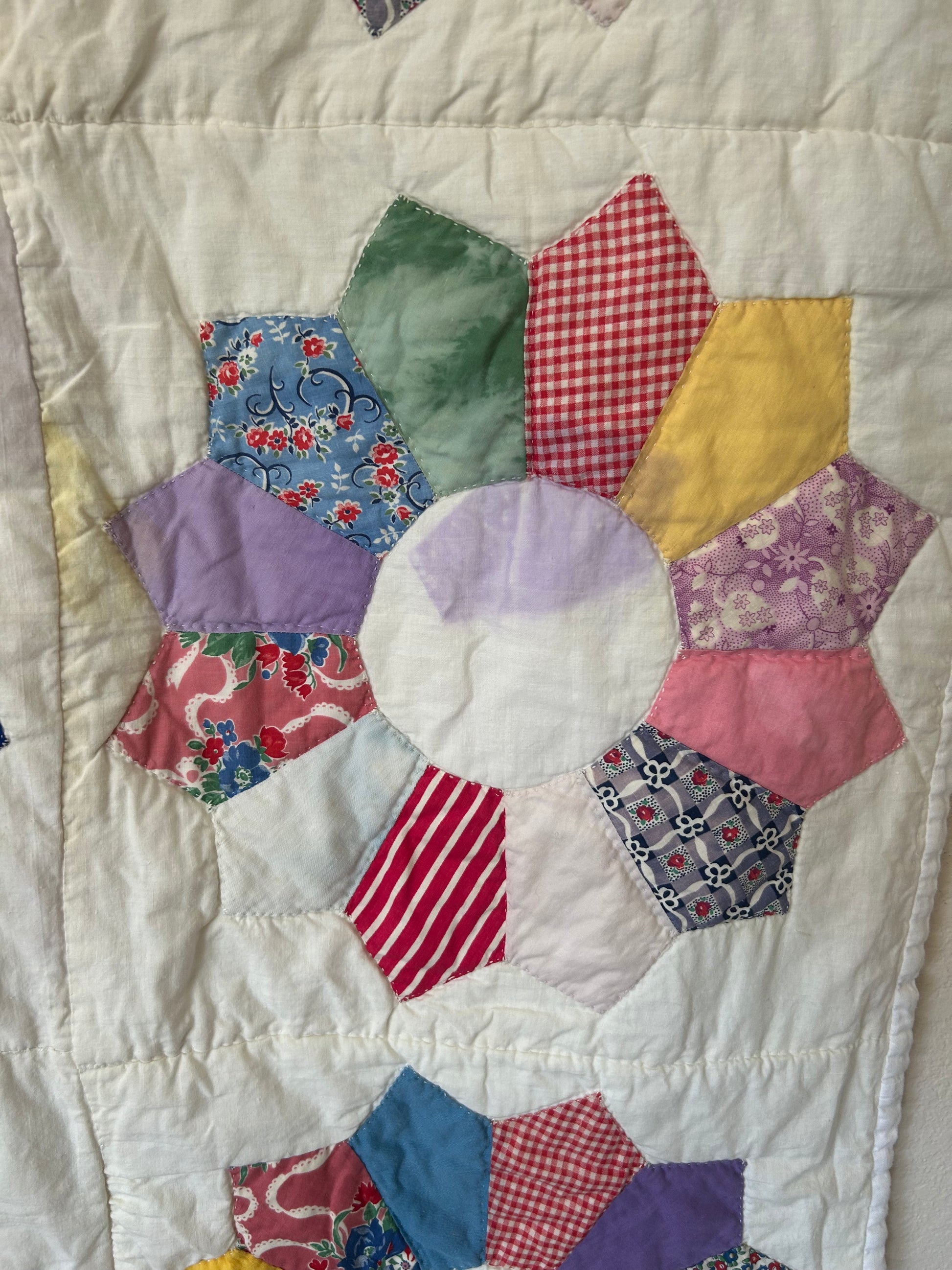 This colorful Playful Dresden Quilt features vibrant Dresden Plate patterns with floral and gingham prints. Hand-stitched and machine pieced, it’s soft and fluffy, making it perfect for cozying up. It does have some color transfer and stains, but it remains a charming, playful quilt.