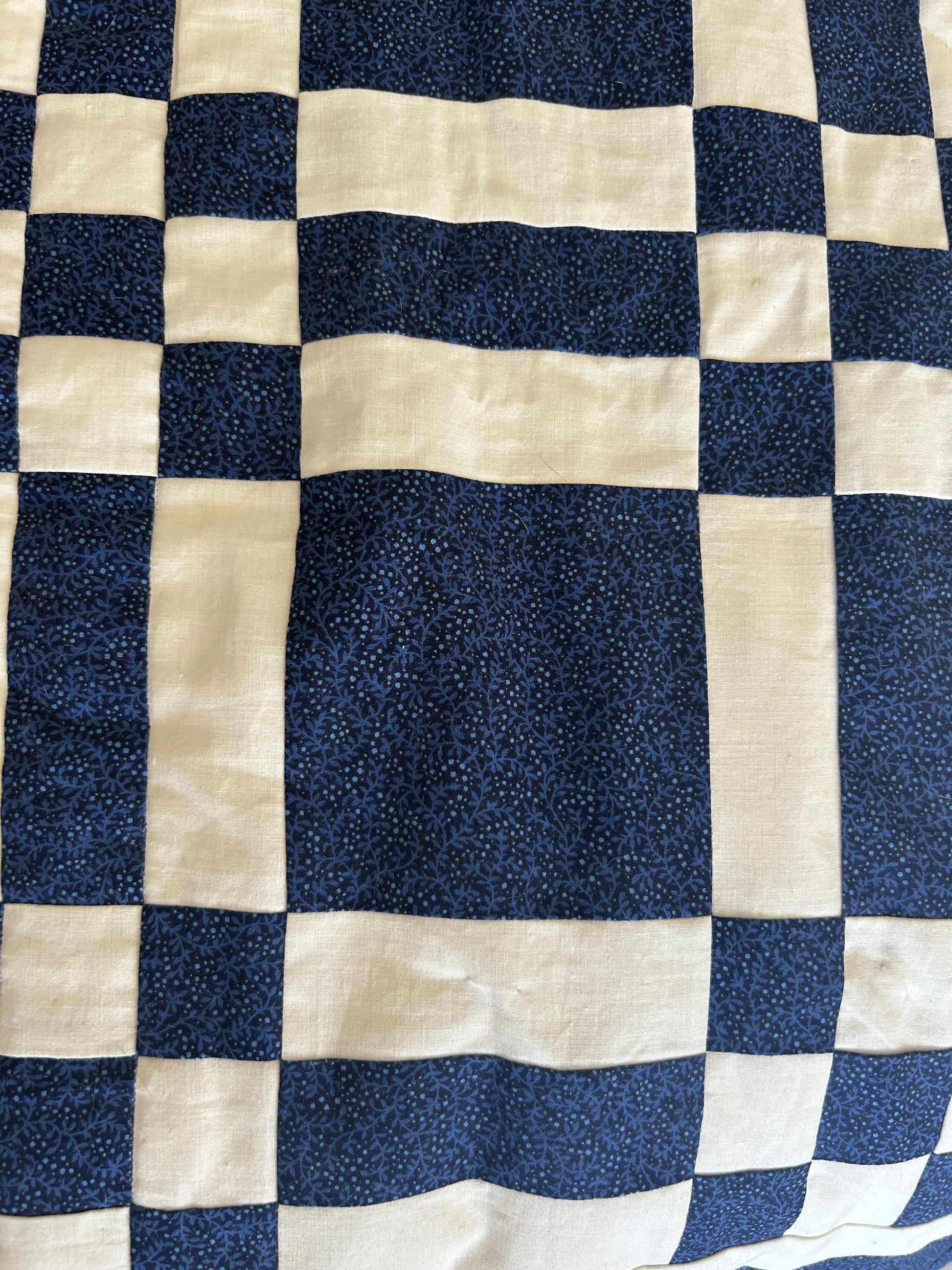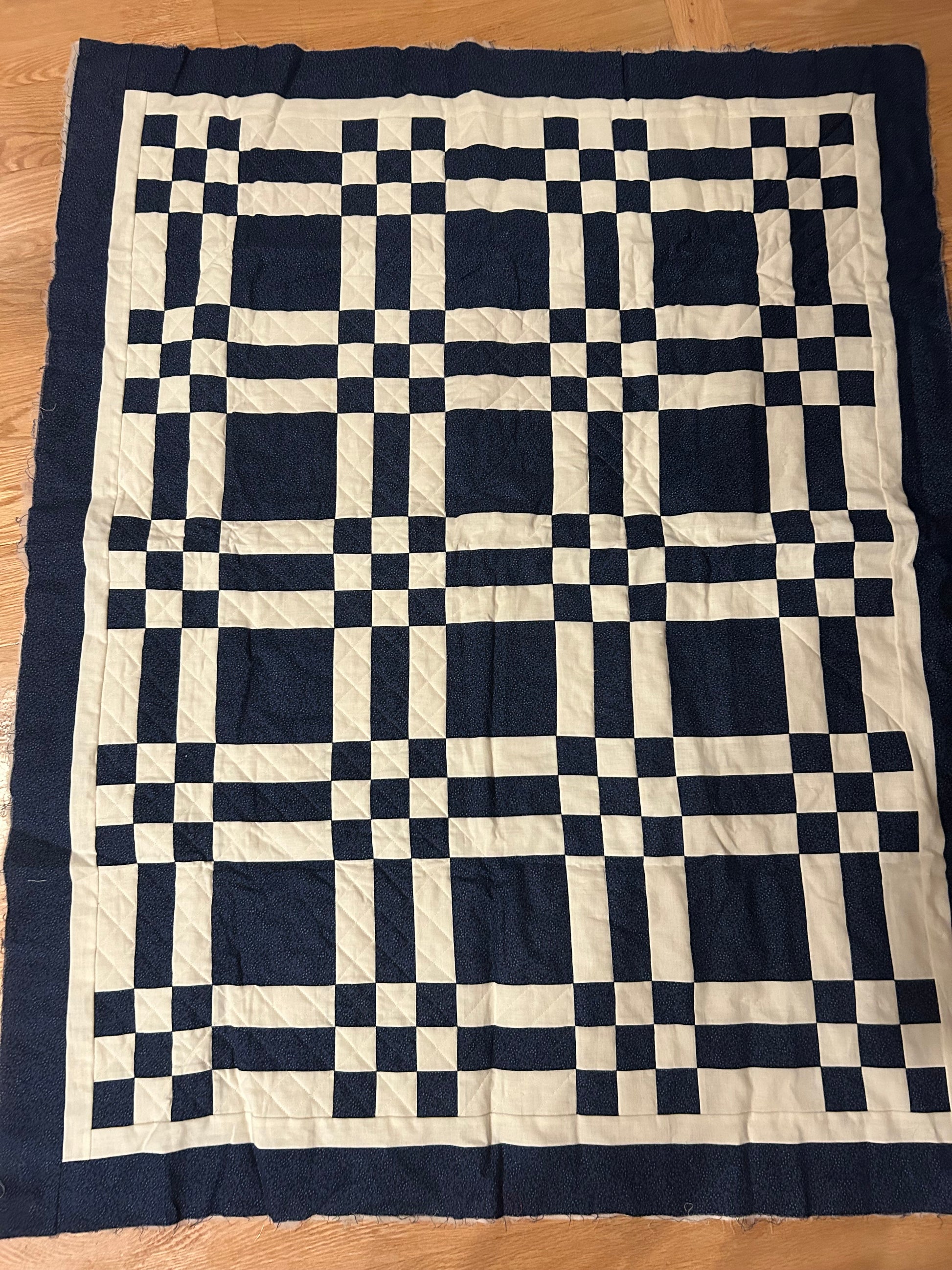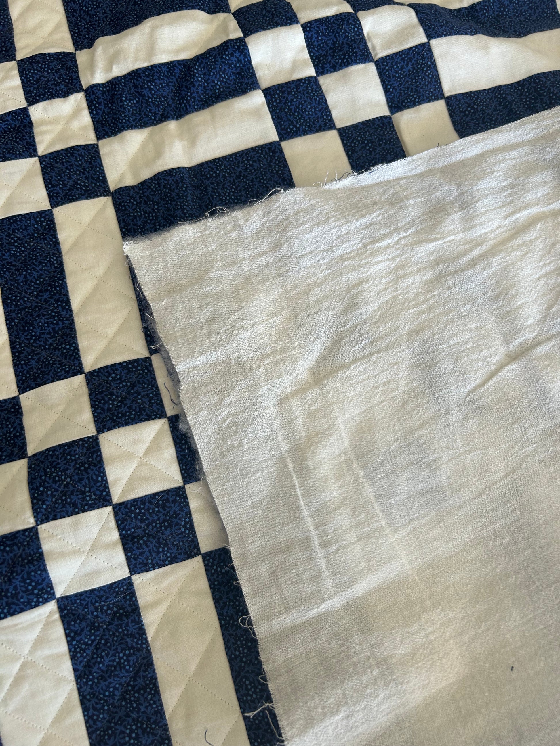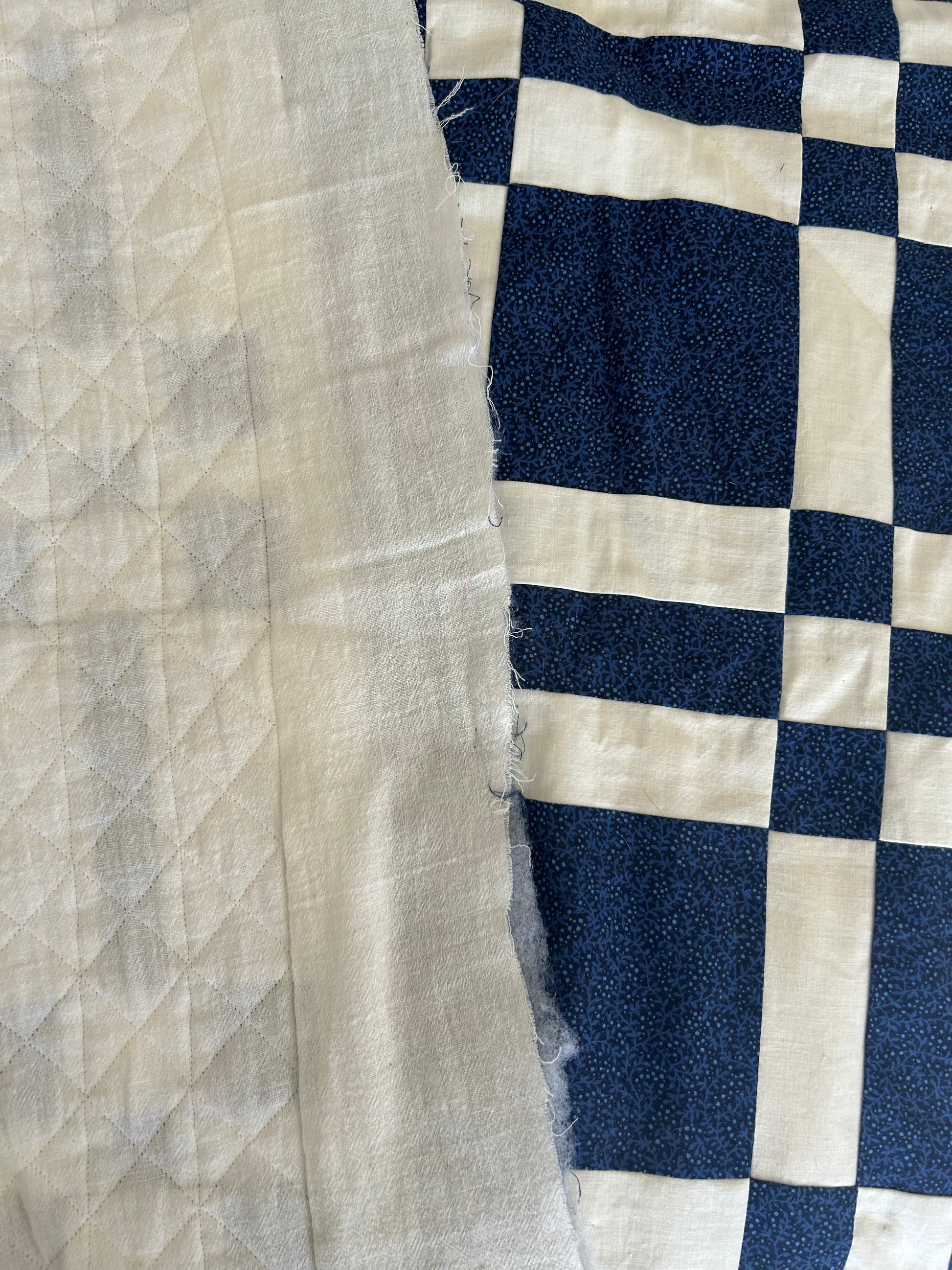 This quilt piece features a beautiful blue and white design with sweet little indigo florals. The quilt top is backed with cotton muslin and includes batting, all ready to be assembled into a finished quilt.