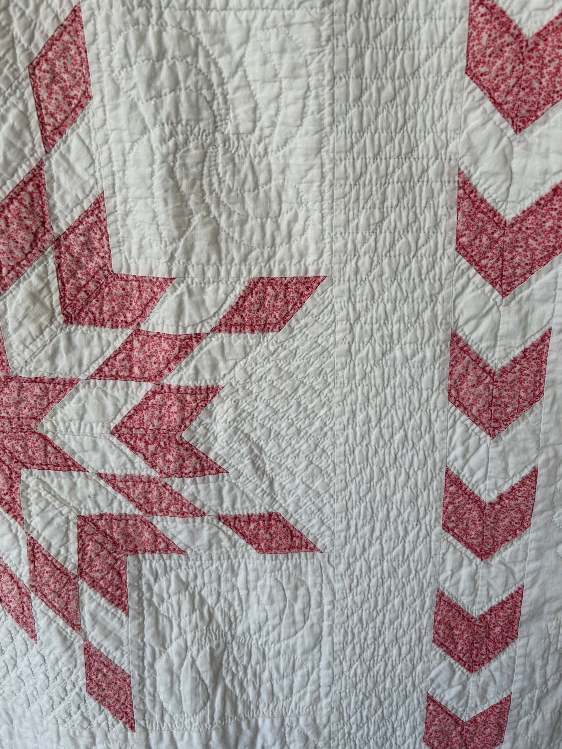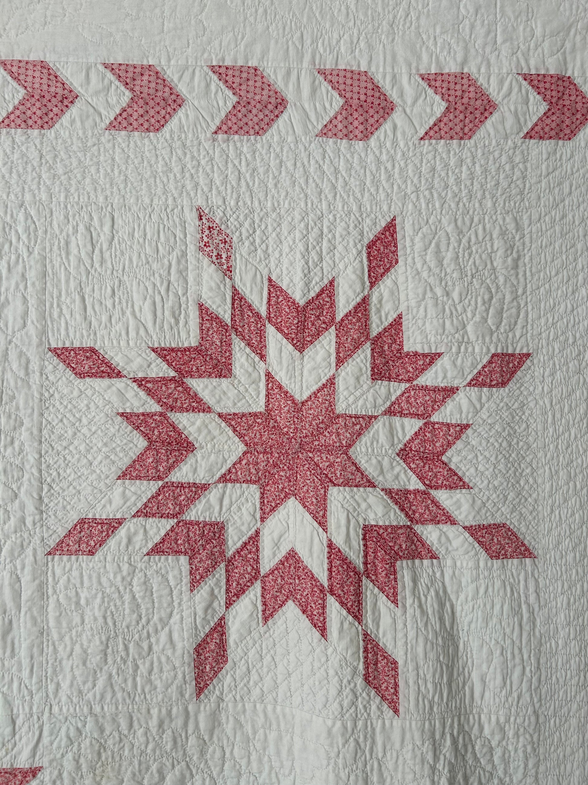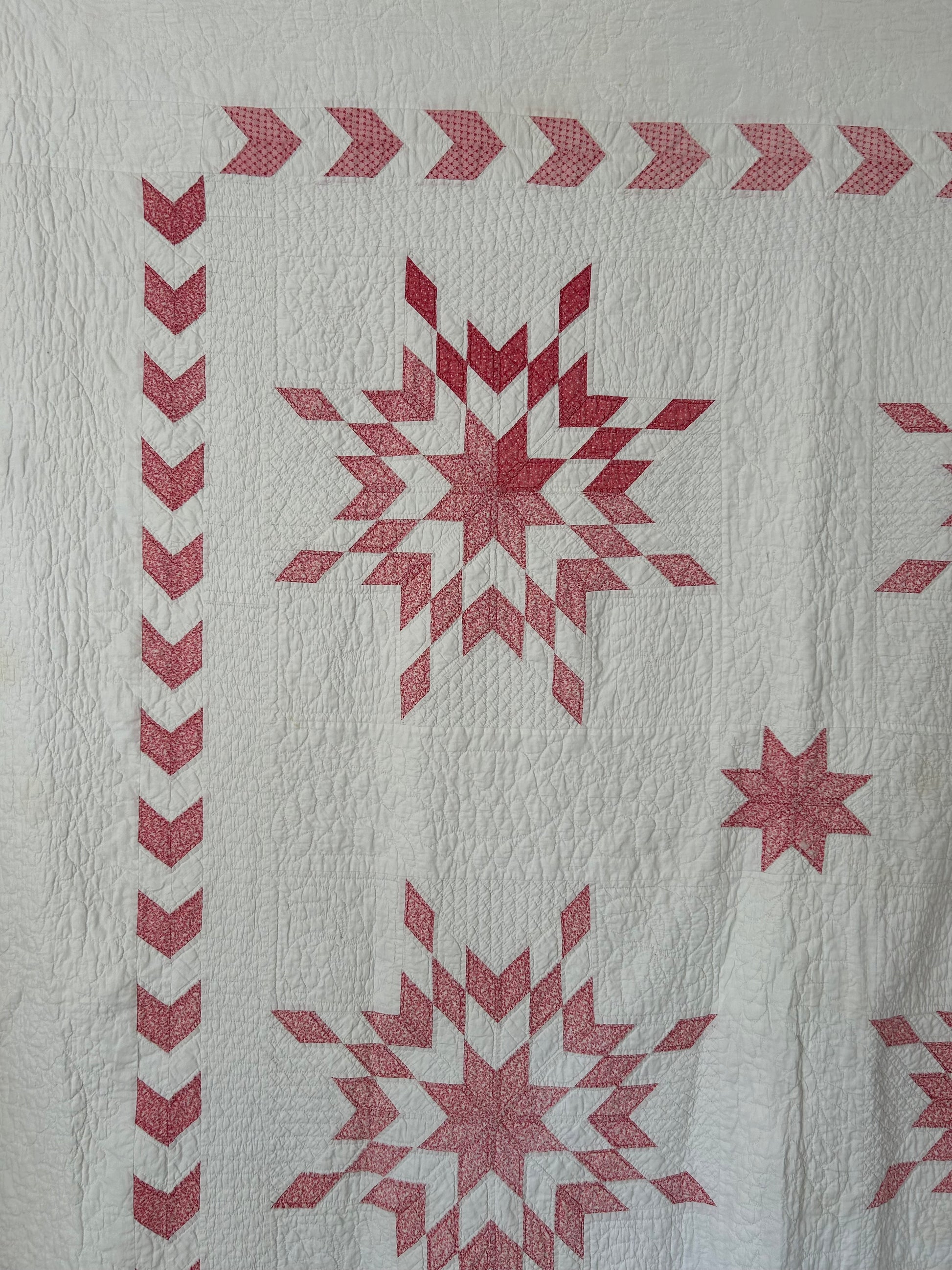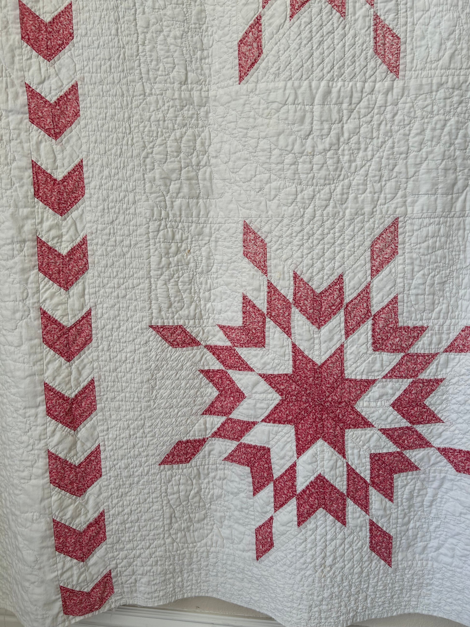This early 1900s Red Starburst Quilt features a stunning starburst (or prairie star) pattern in red and white, with fun arrow borders on three sides. Hand and machine stitched, it has a few different shades of red, a teeny bit of yellowing, and light fraying on one edge. Drapey, soft, and full of vintage charm.