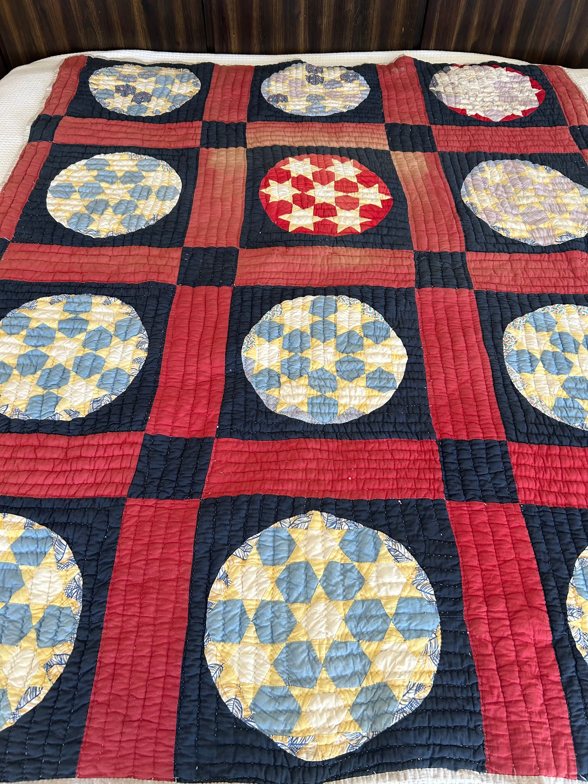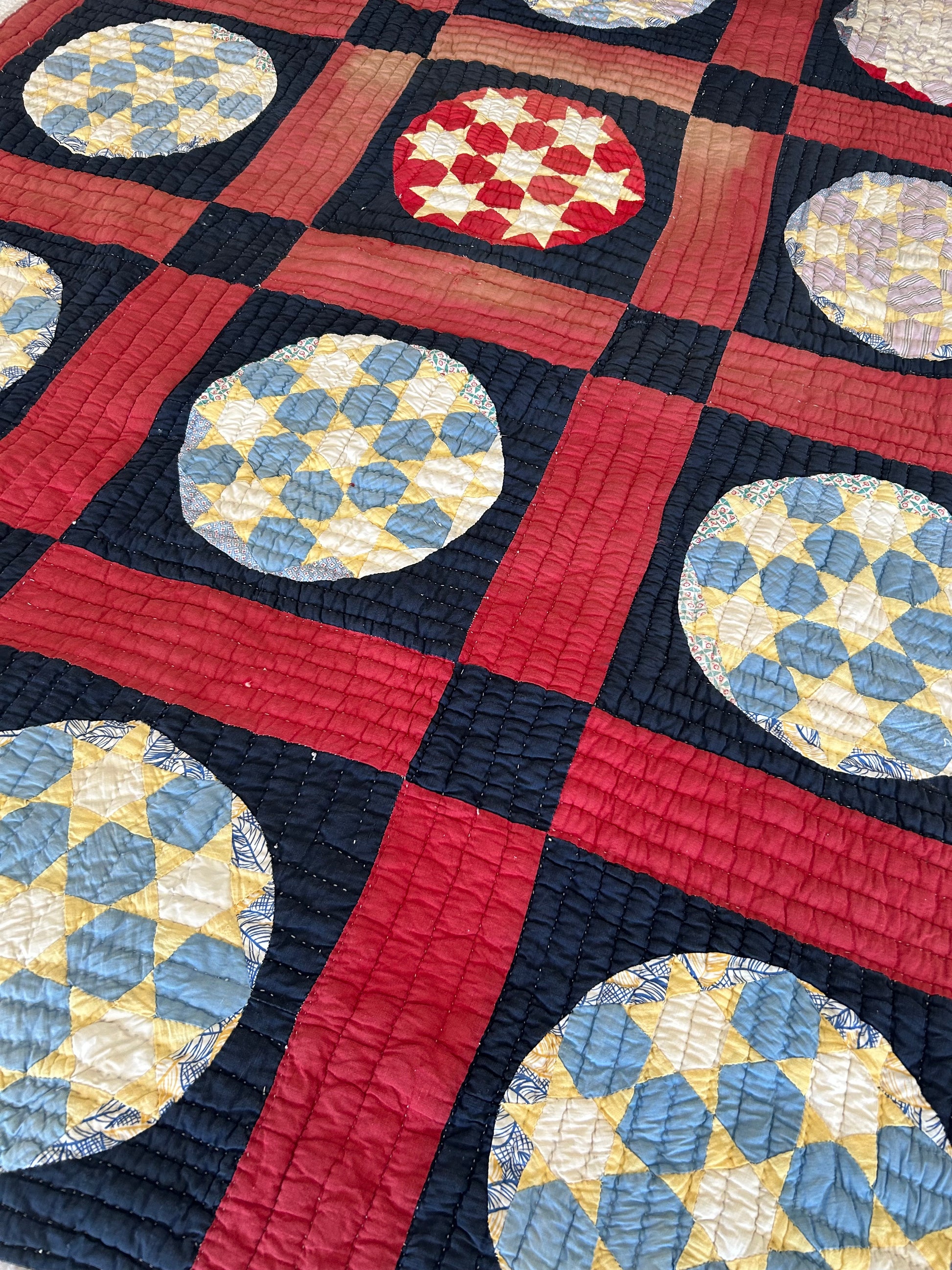 This antique Seven Sisters Quilt from the early 1900s features vibrant red, blue, and yellow tones, capturing a beautiful Americana feel. It is hand-stitched and has some visible damages, including fading, discoloration, and tearing, making it a perfect choice for the worn quilt lover.