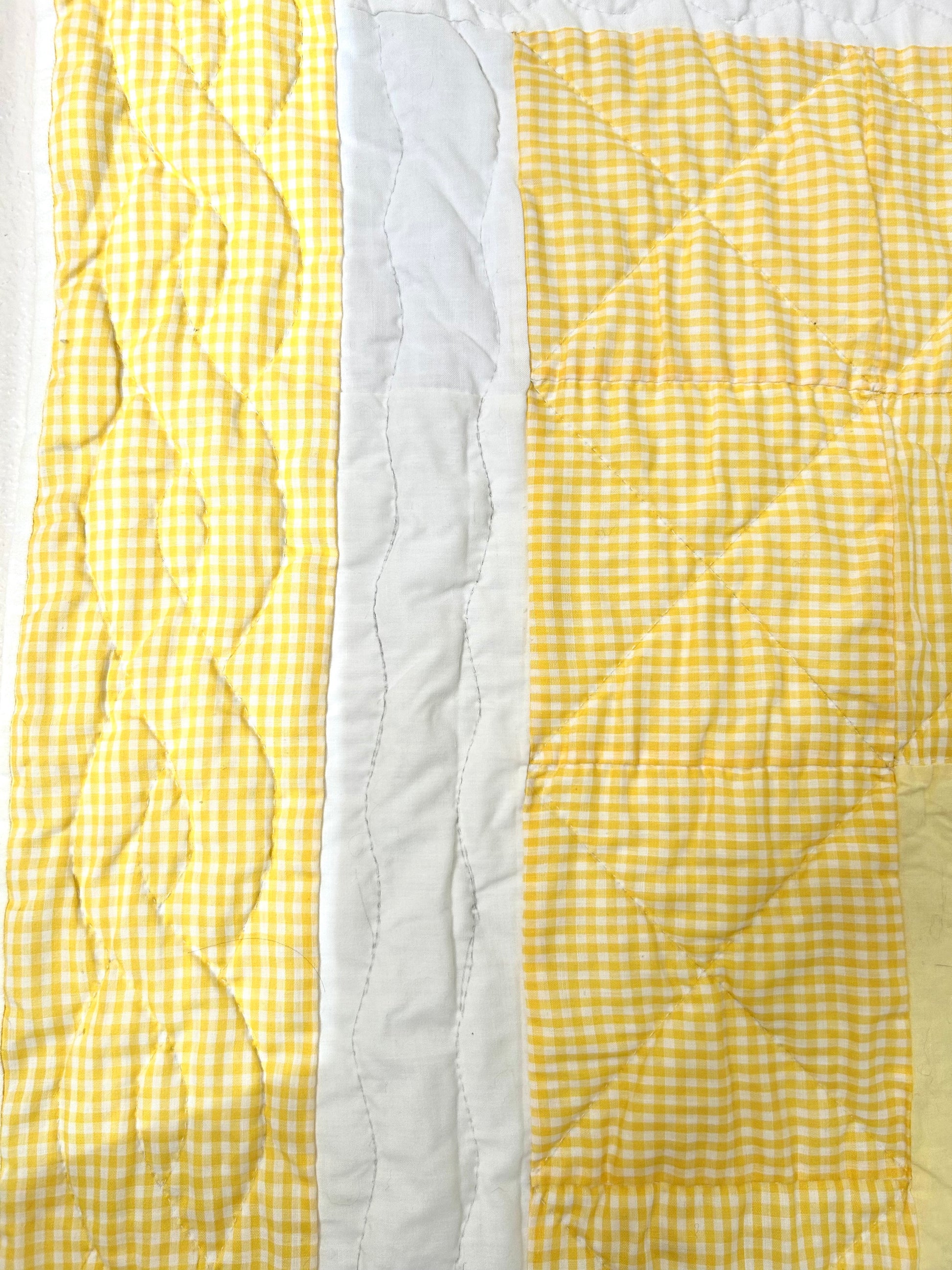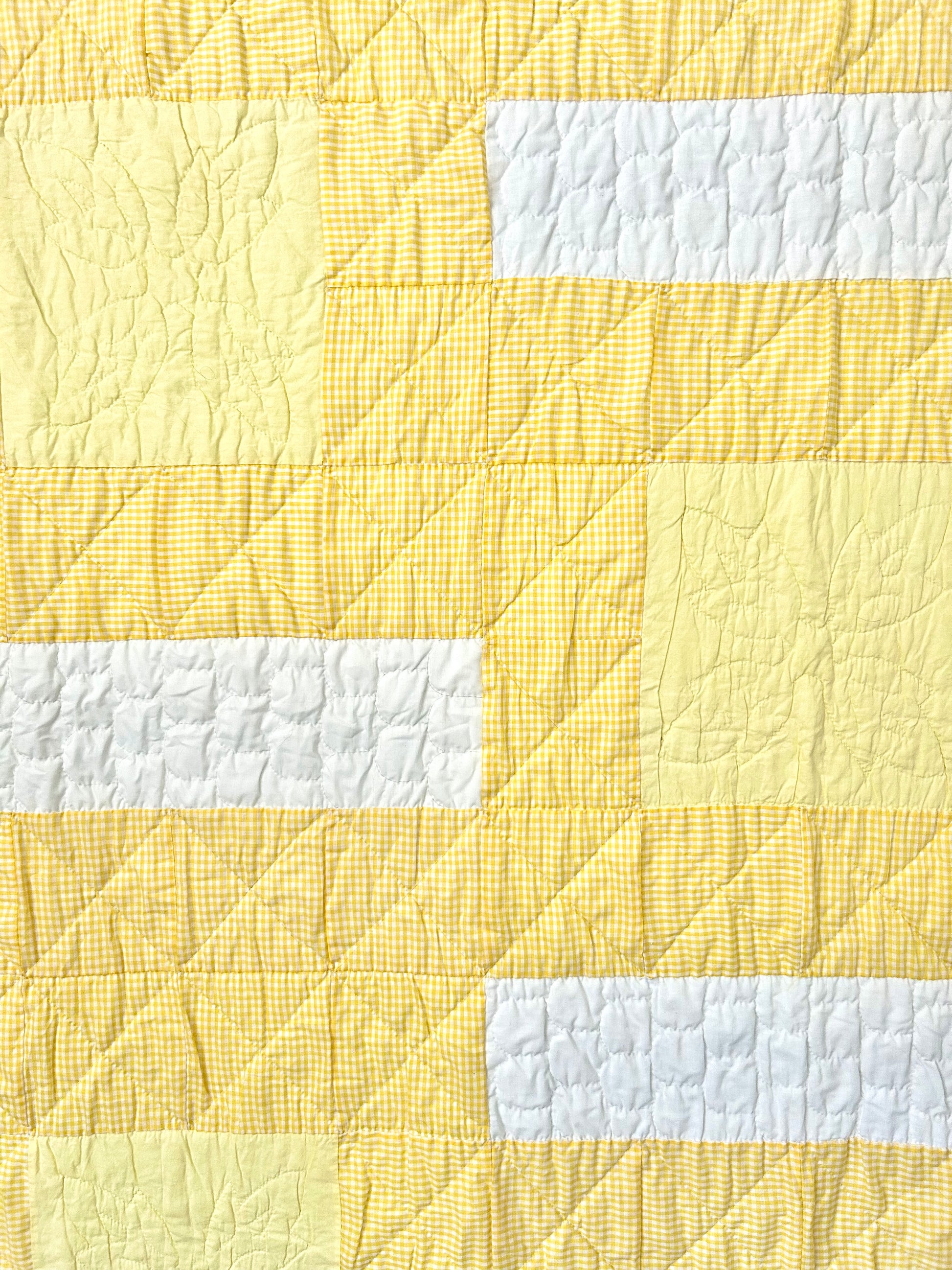 This 1960s Sunshine Quilt features cheerful yellow and white gingham. Hand-stitched and machine-pieced, it’s lightweight, bright, and perfect for adding a sunny touch to any room. The front is pristine, while the back has some yellowing and a few black marks, giving it vintage character. White backing completes this charming piece.
