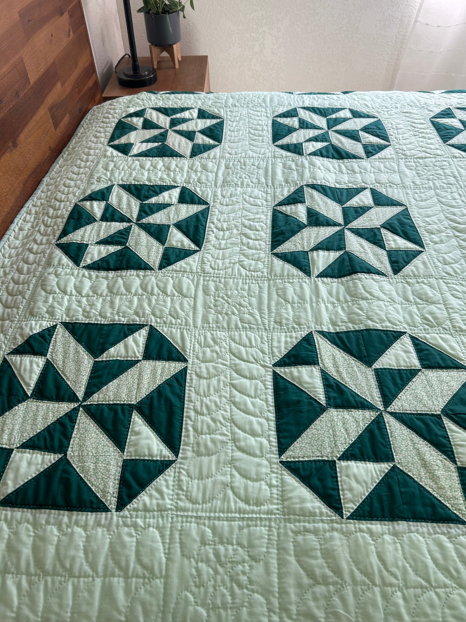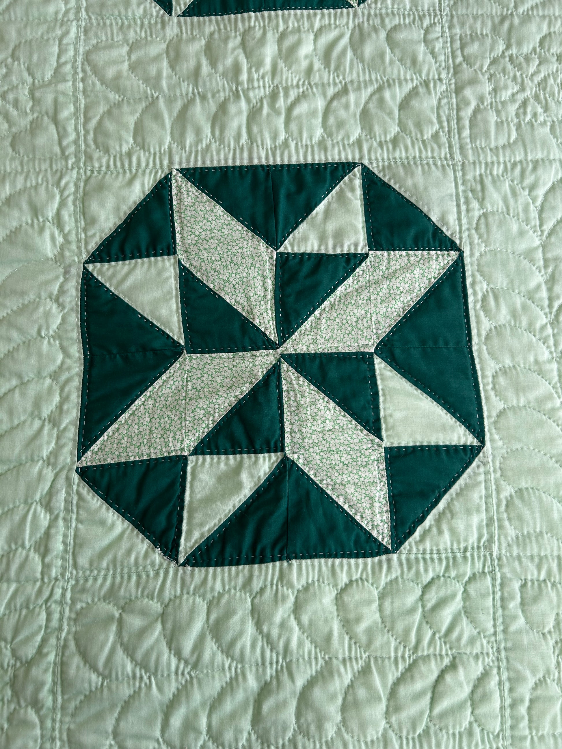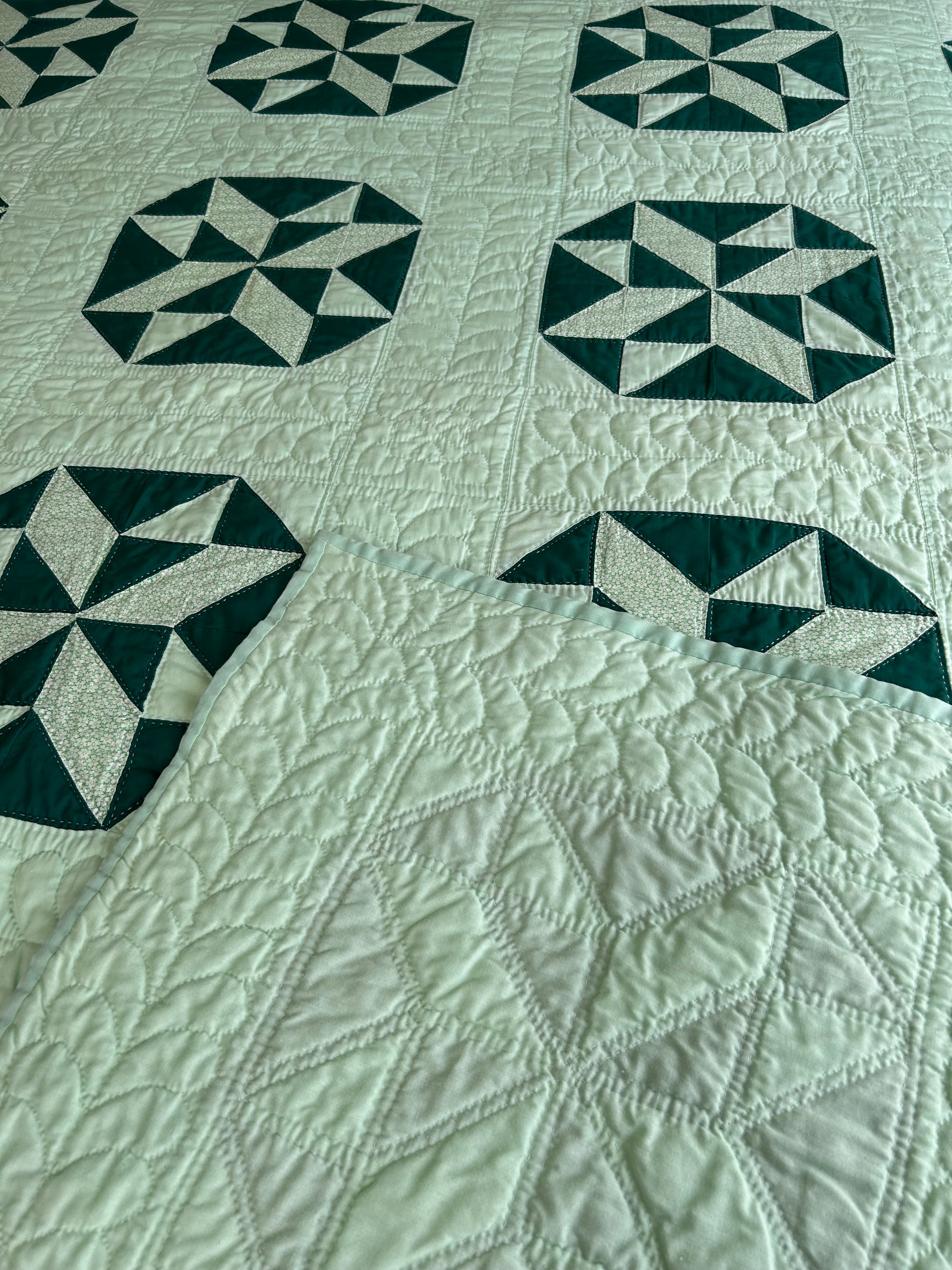 This stunning king-size Amish pinwheel quilt features deep green pinwheel blocks set against a soft mint green background. The hand quilting is precise at 6–8 stitches per inch, showcasing the craftsmanship. The backing fabric matches the front in mint green. Never used and beautifully preserved, with one small mend noted.