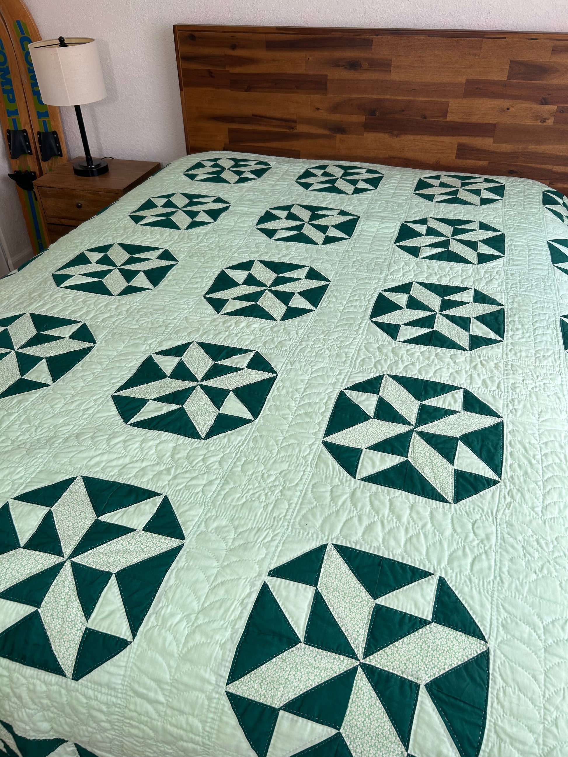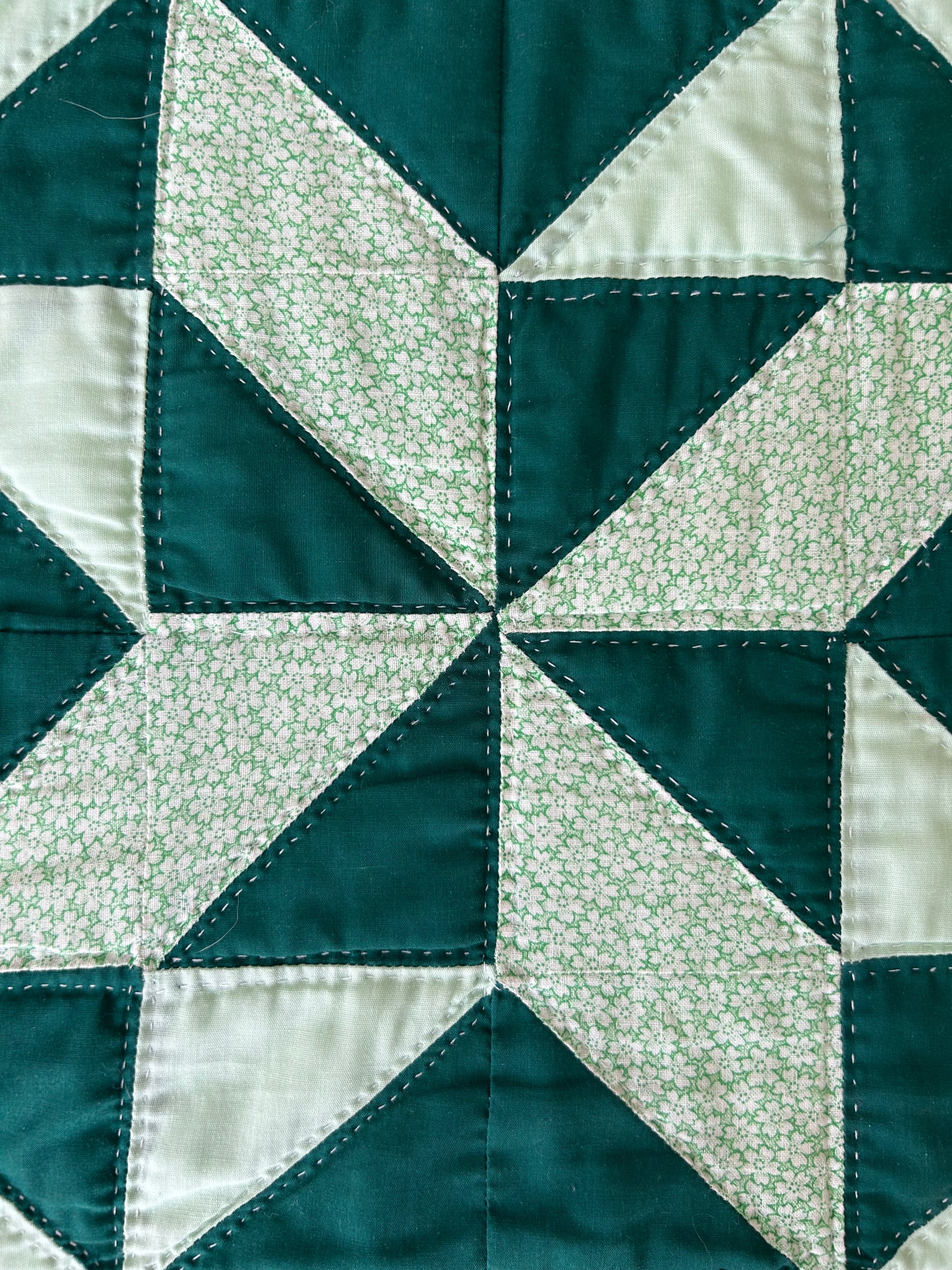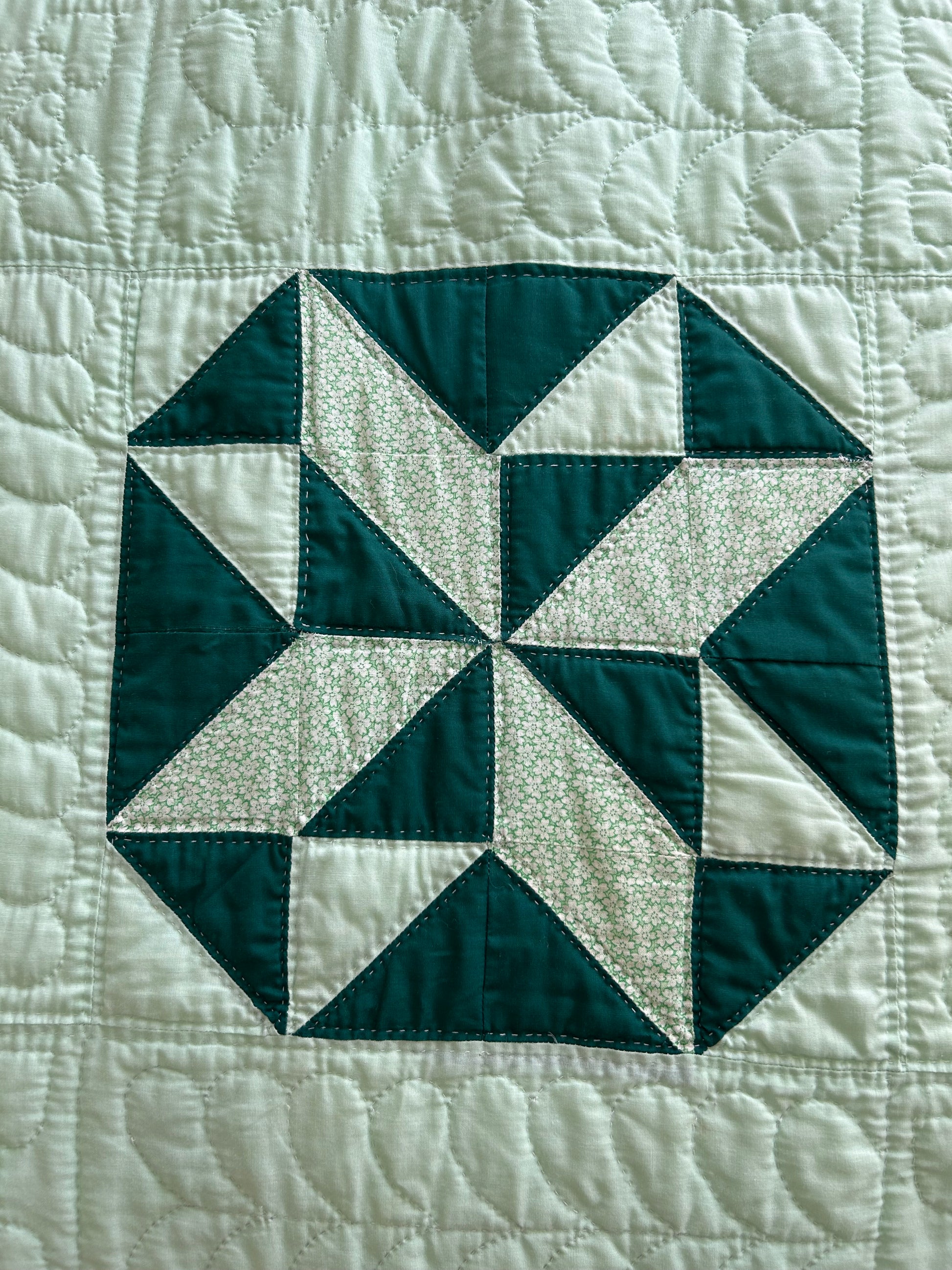 This stunning king-size Amish pinwheel quilt features deep green pinwheel blocks set against a soft mint green background. The hand quilting is precise at 6–8 stitches per inch, showcasing the craftsmanship. The backing fabric matches the front in mint green. Never used and beautifully preserved, with one small mend noted.