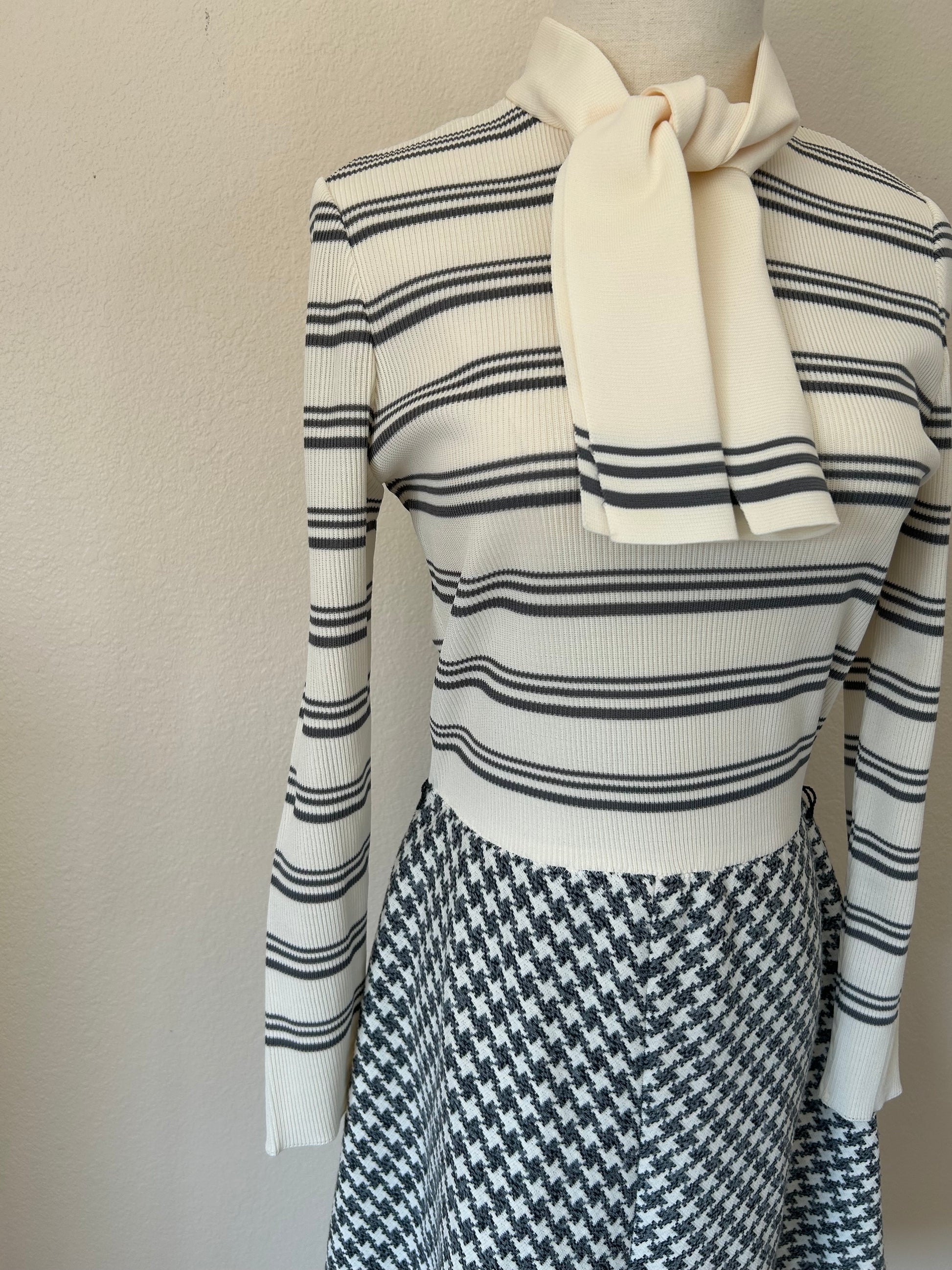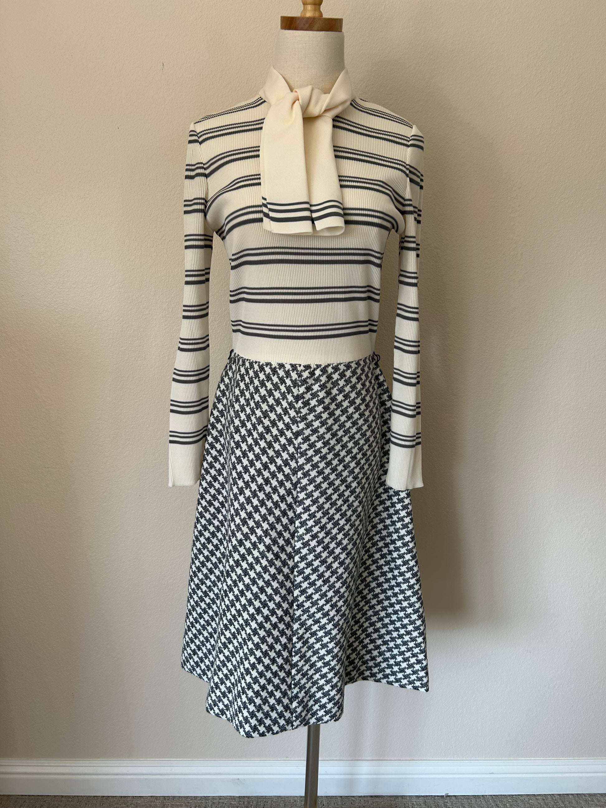 This charming Dalton dress features a cream and gray houndstooth skirt with subtle stripe details and a delicate secretary bow at the neckline. The ribbed body offers a flattering fit, perfect for preppy, vintage-inspired, or back-to-school looks. Zipper closure in the back; missing belt.
