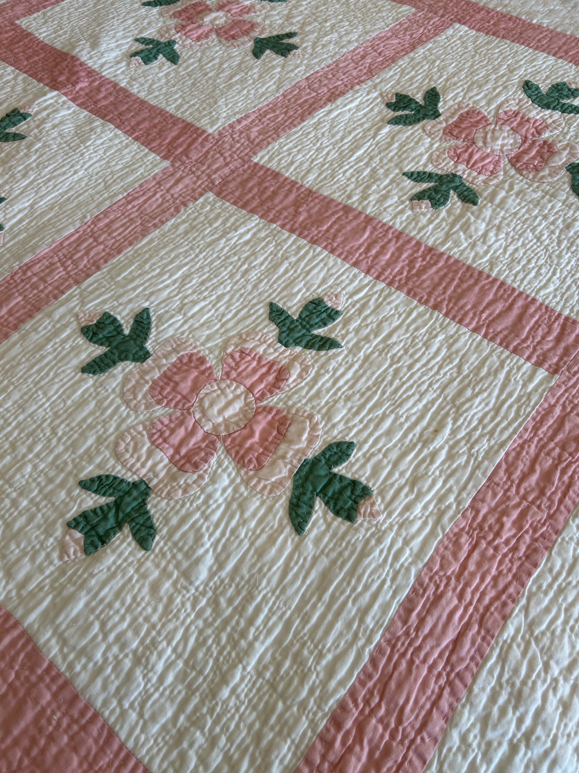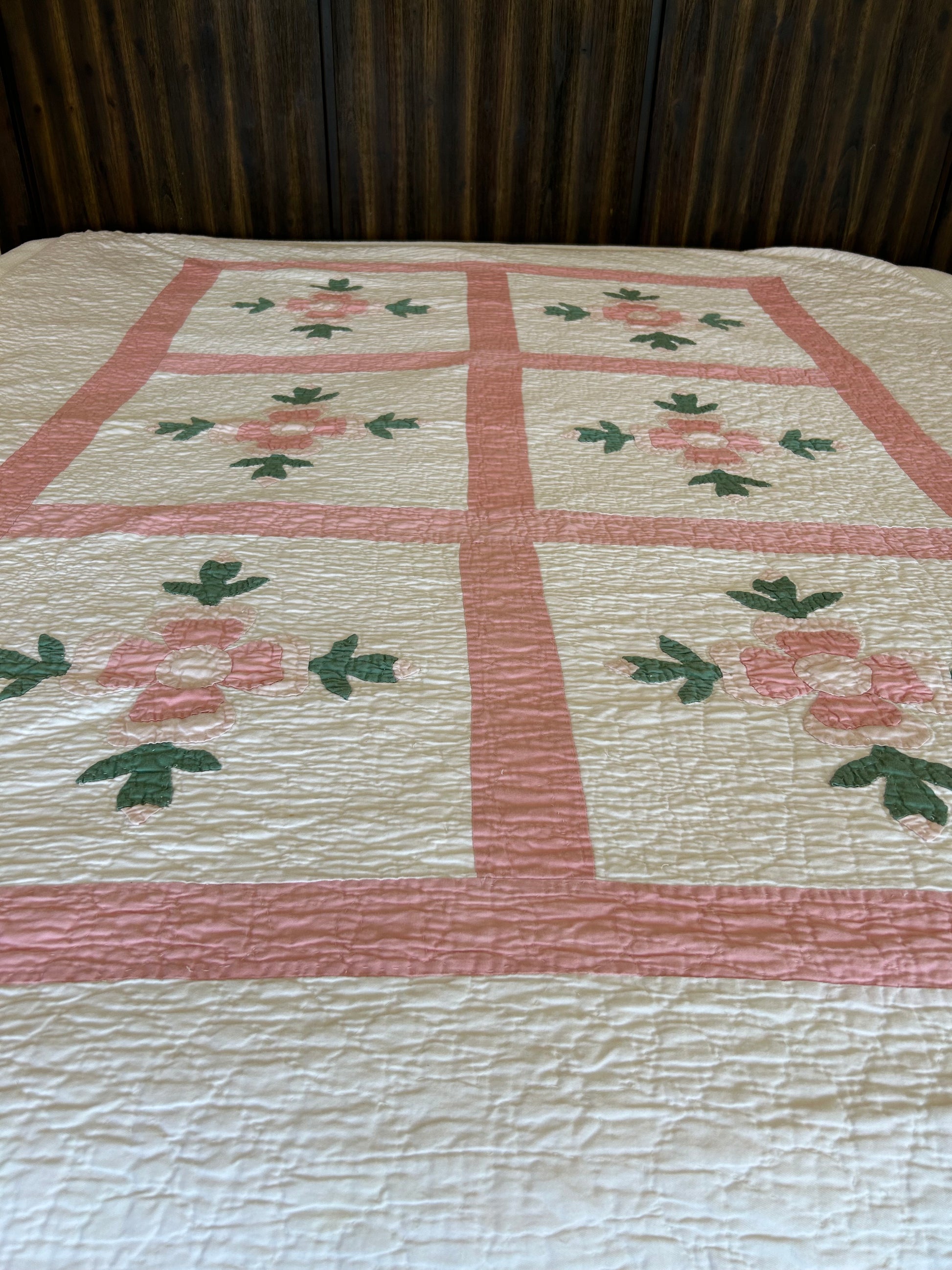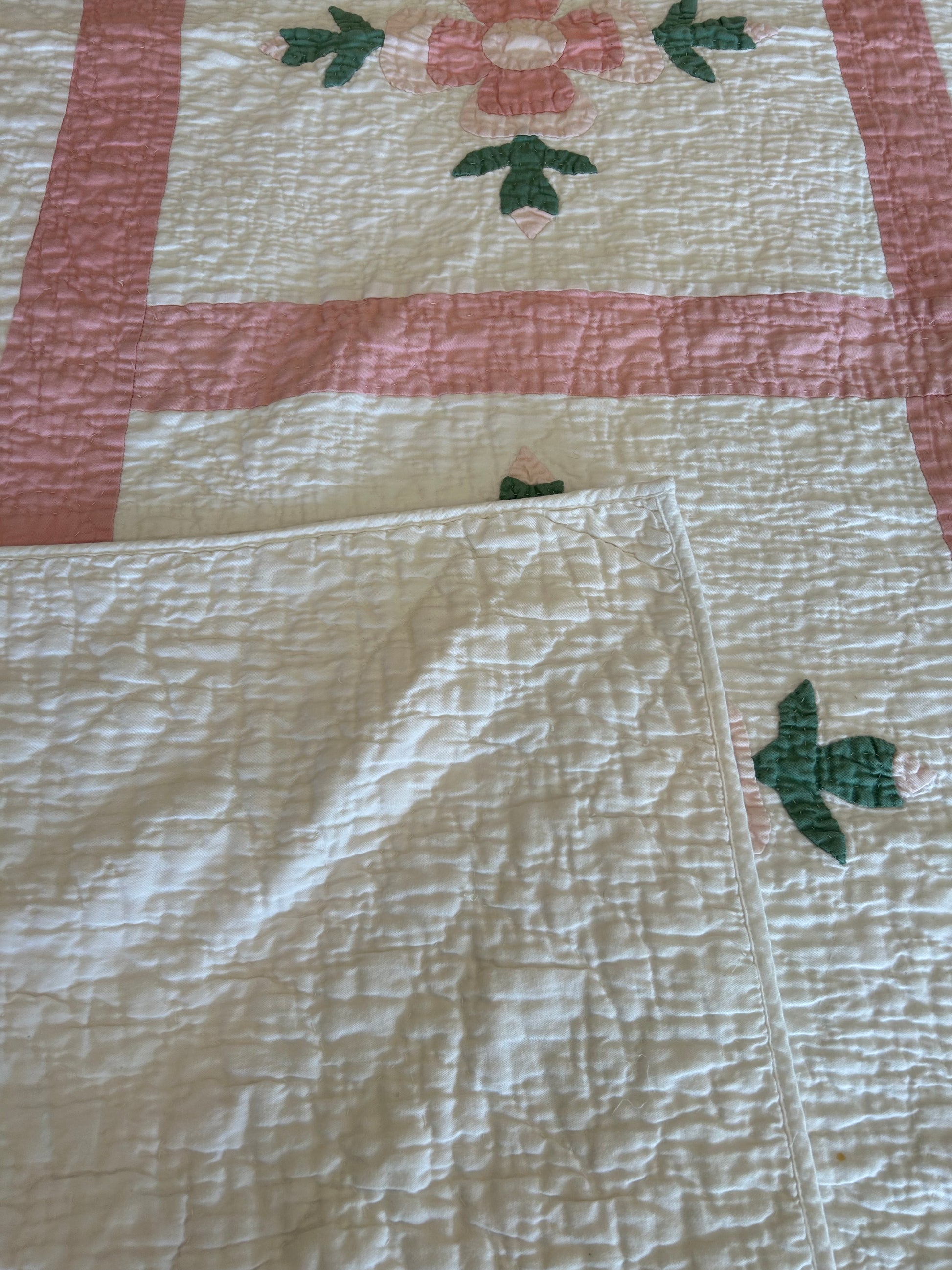 The delicate Rose of Sharon appliqué in soft pink and white adds a charming touch.