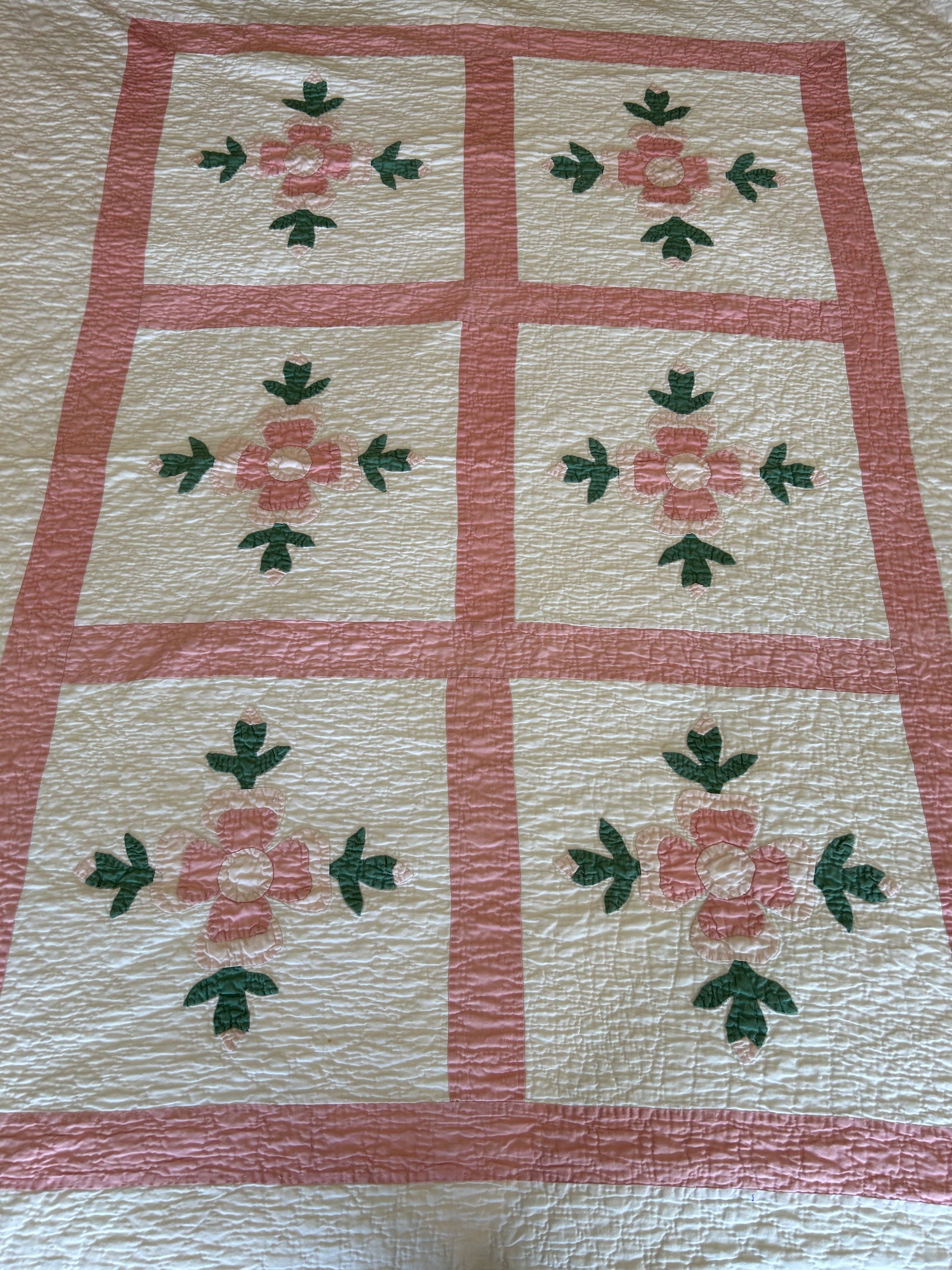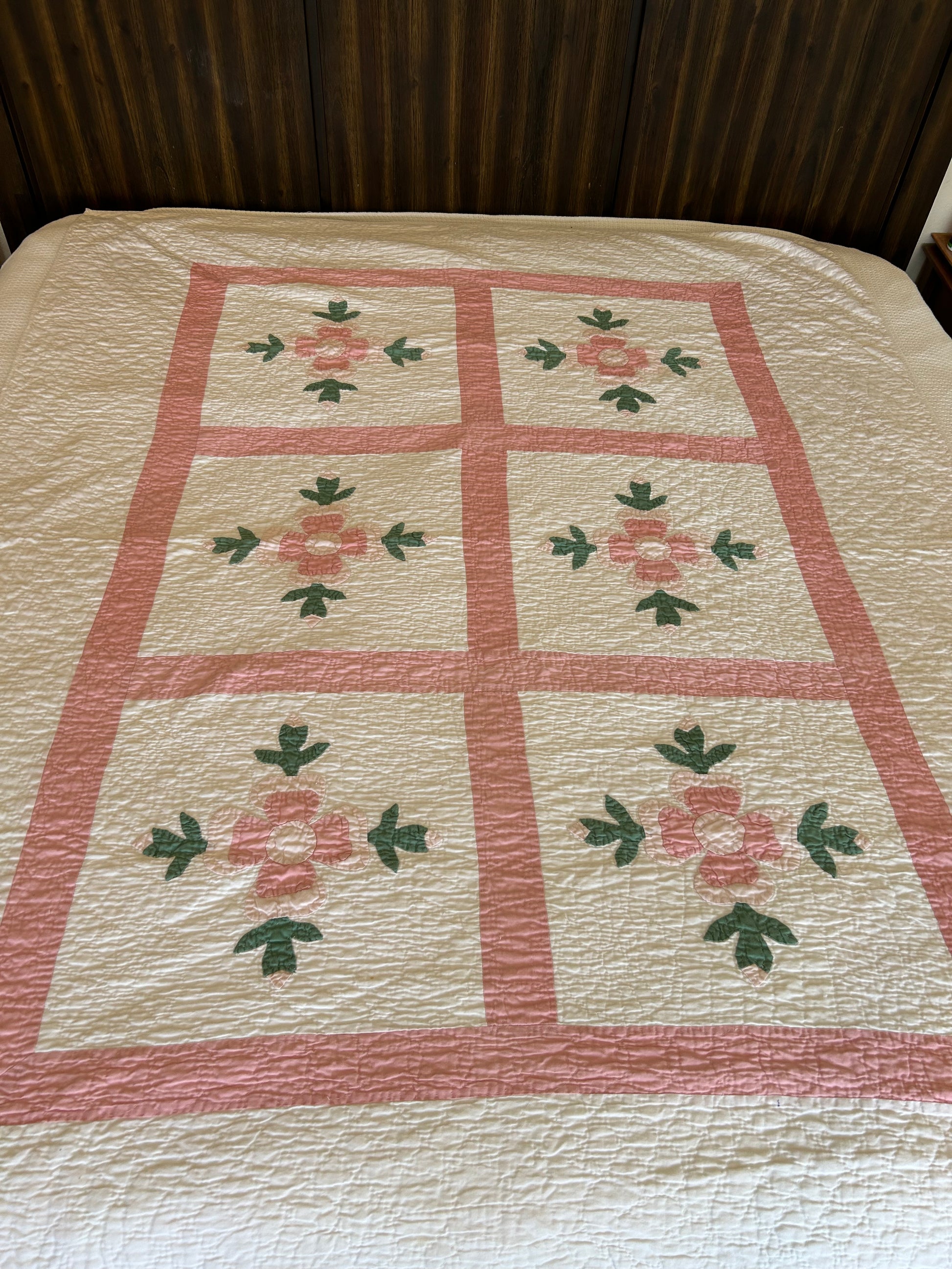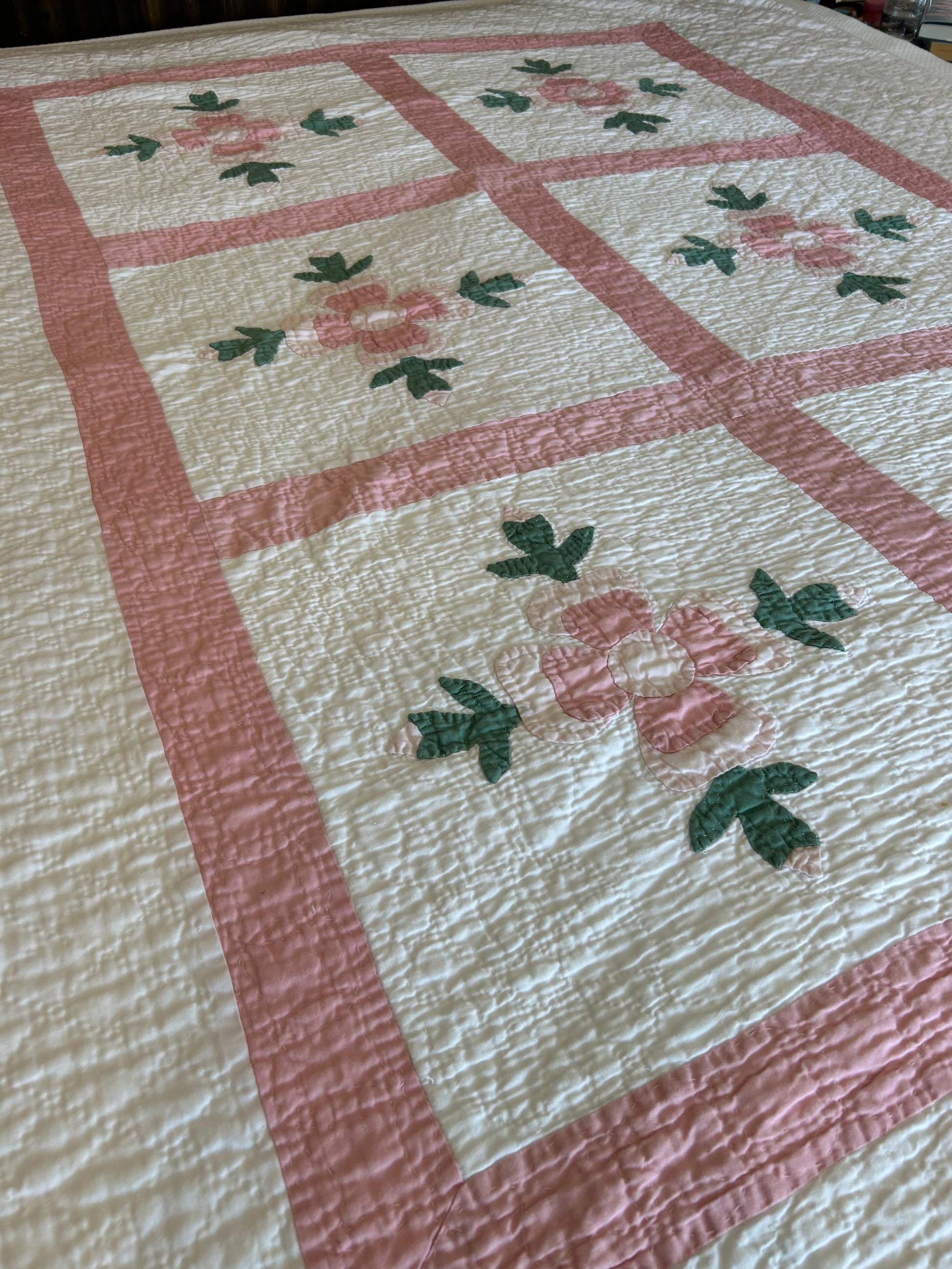 The delicate Rose of Sharon appliqué in soft pink and white adds a charming touch.