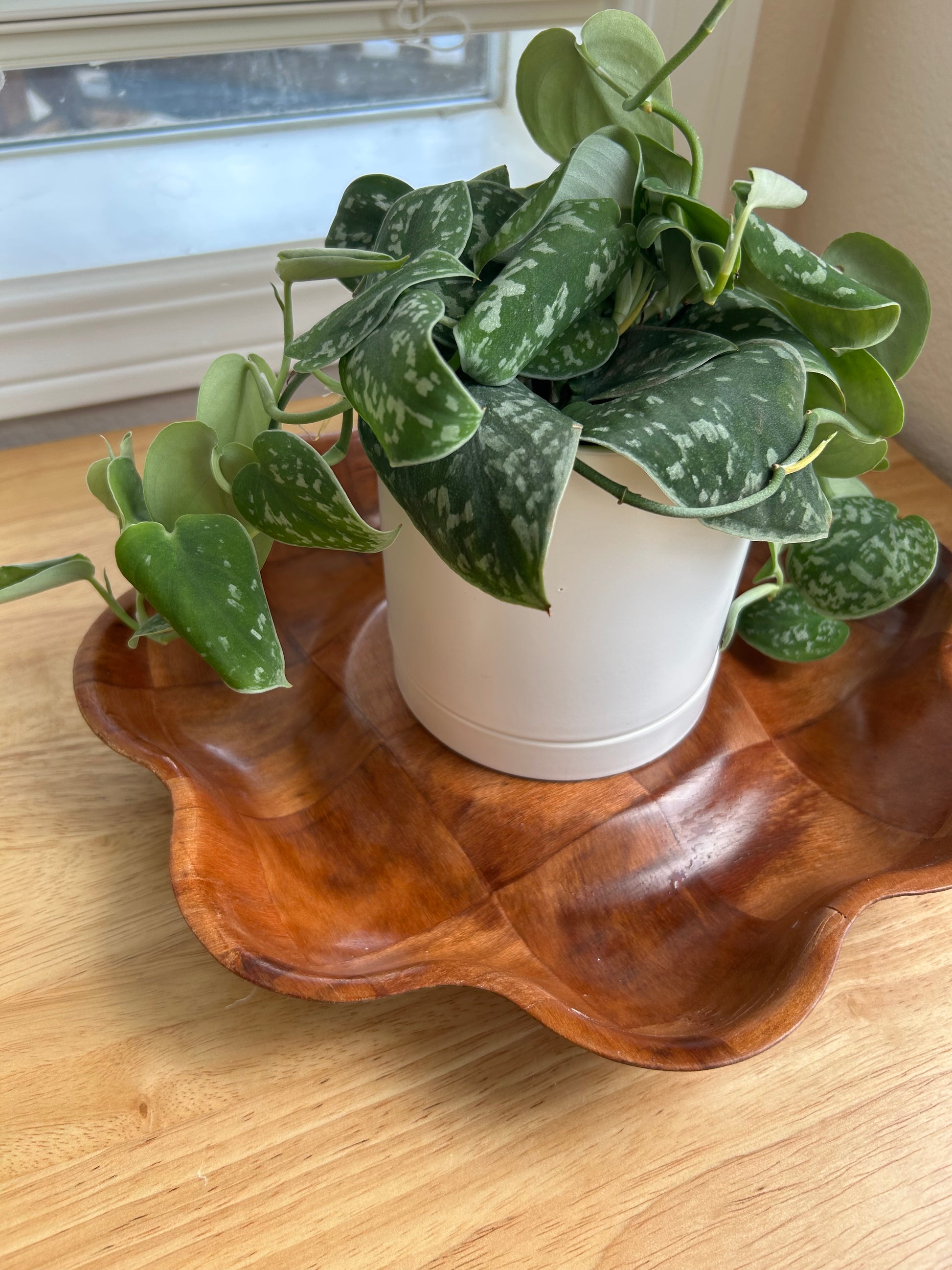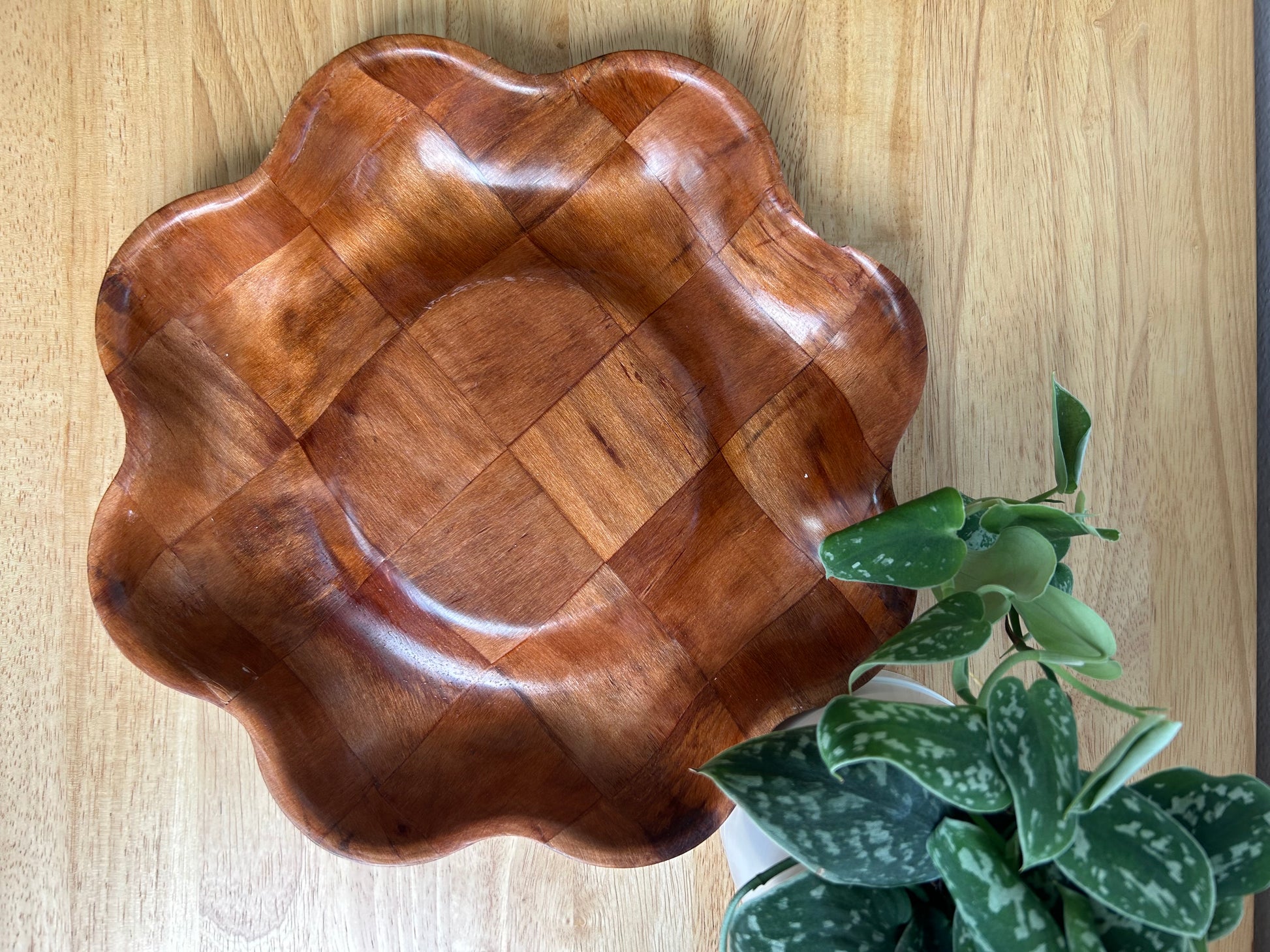 This gorgeous vintage wooden bowl features a petal-shaped scalloped edge and a beautiful woven parquet pattern that adds warmth and texture to any space. Lightweight and versatile, it’s perfect as a catchall, fruit bowl, centerpiece, or decorative tray.