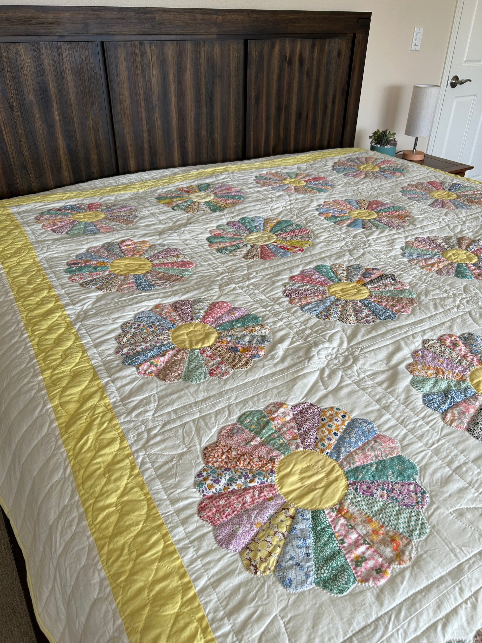 This 1940s Yellow Dresden Quilt is a stunning example of vintage craftsmanship, made from beautiful feedsacks. Featuring a variety of yellow hues, it’s machine-stitched and generously sized—perfect for a Cal King bed. The white backing complements the bright colors. A couple of small spots on the front add to its vintage character.